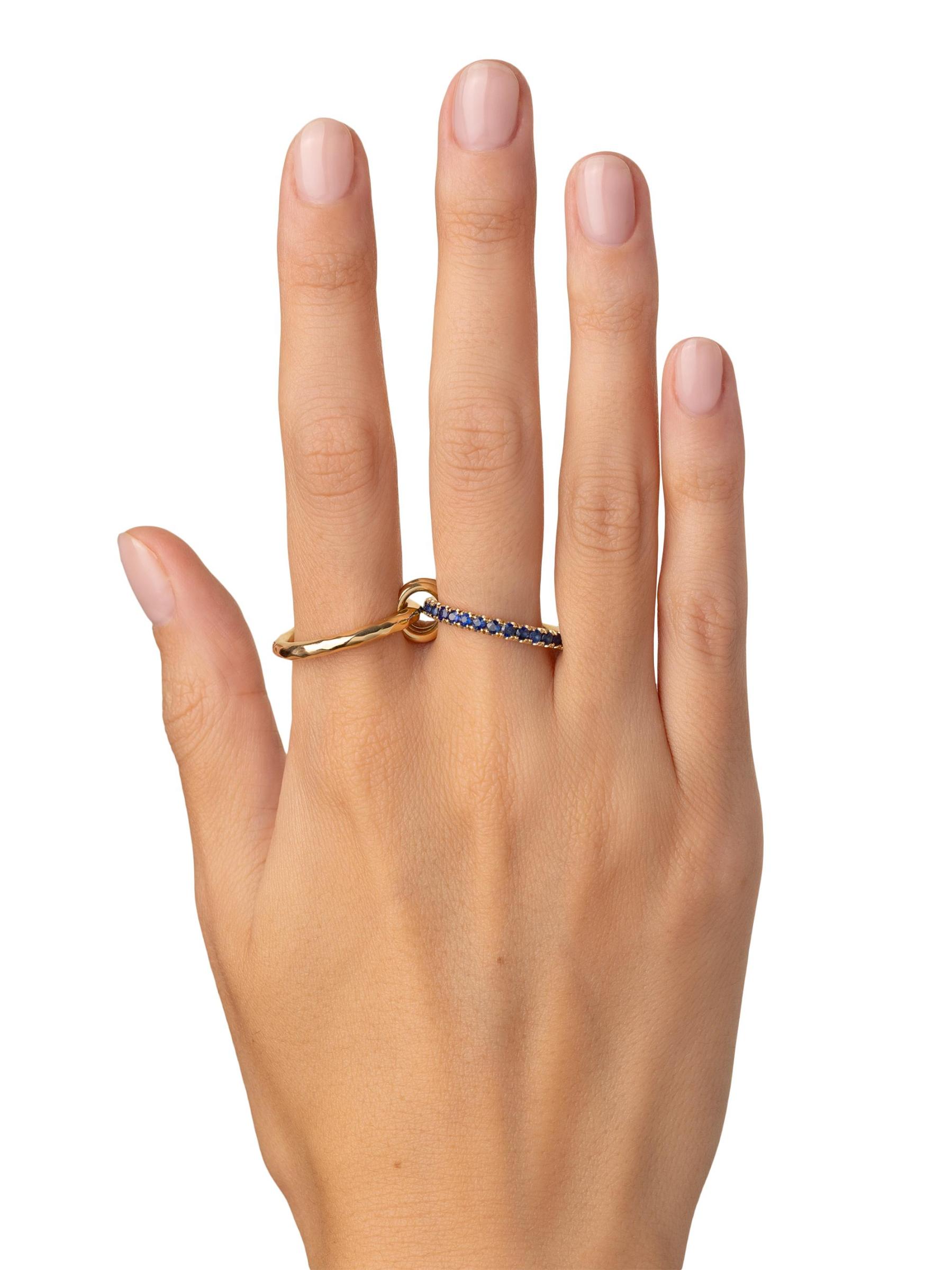 من مجموعة فيترا فولكان. صُنع خاتم Spinelli Kilcollin يدويًا من الذهب الأصفر عيار 18 قيراطًا، ويتميز بحزام خلود من الأحجار الكريمة وحزام مطروق متصل بموصلين. يمكن ارتداء هذه القطعة الرائعة مكدسة أو عبر إصبعين.الياقوت الأزرق أو الزمرد ذهب أصفر عيار 18 قيراط صُنع في الولايات المتحدة الأمريكية