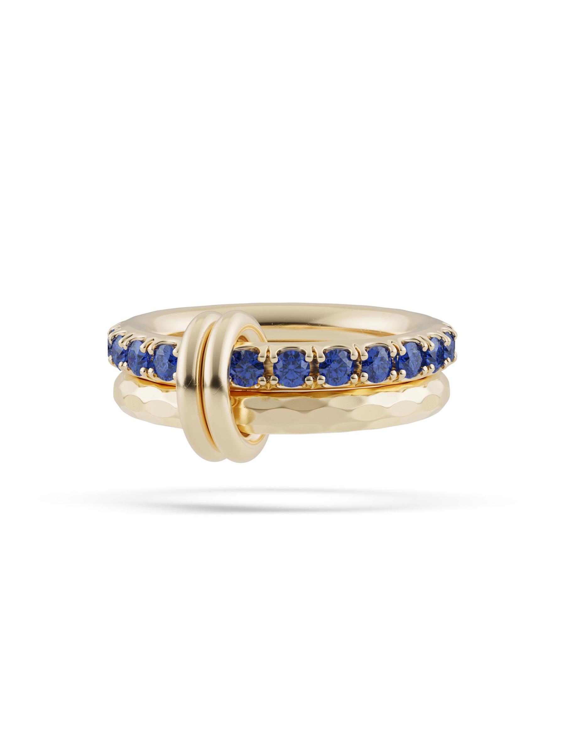 من مجموعة فيترا فولكان. صُنع خاتم Spinelli Kilcollin يدويًا من الذهب الأصفر عيار 18 قيراطًا، ويتميز بحزام خلود من الأحجار الكريمة وحزام مطروق متصل بموصلين. يمكن ارتداء هذه القطعة الرائعة مكدسة أو عبر إصبعين.