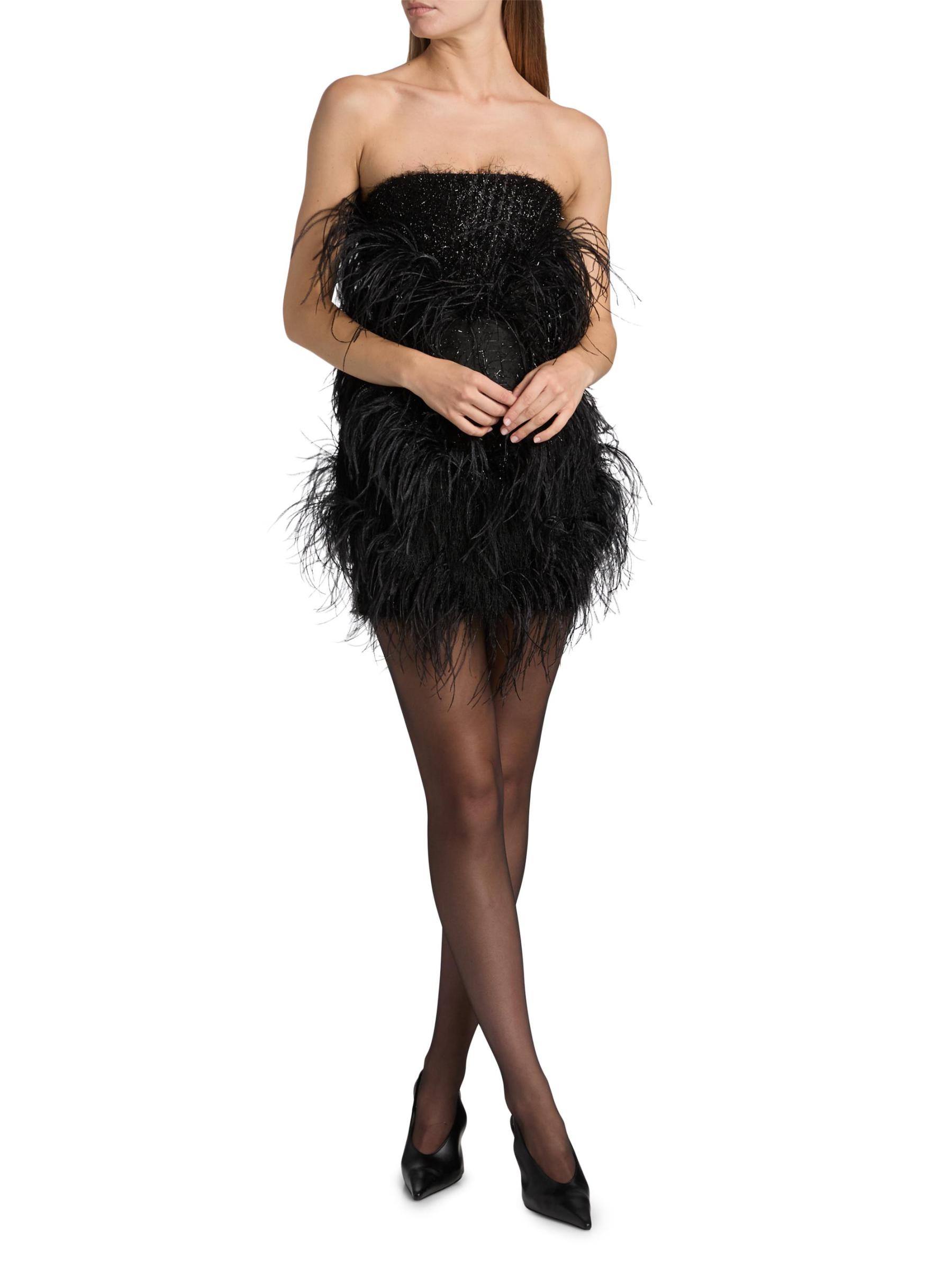 من مجموعة Lights On. 16 يُضفي فستان Visea الصغير من Arlington مزيدًا من الأناقة على الصورة الظلية الأنيقة بدون حمالات مع لمسة نهائية مزخرفة من ريش النعام.