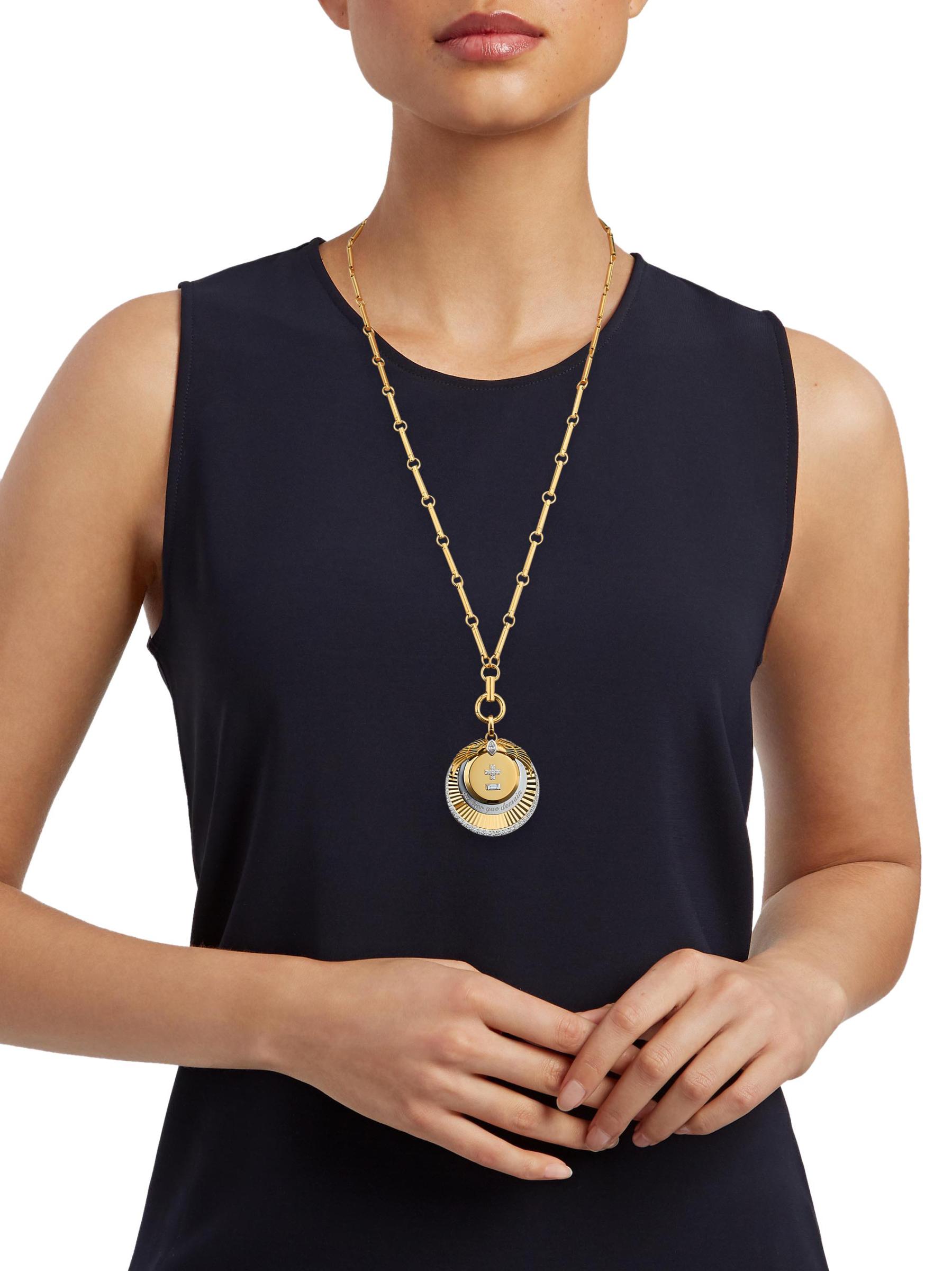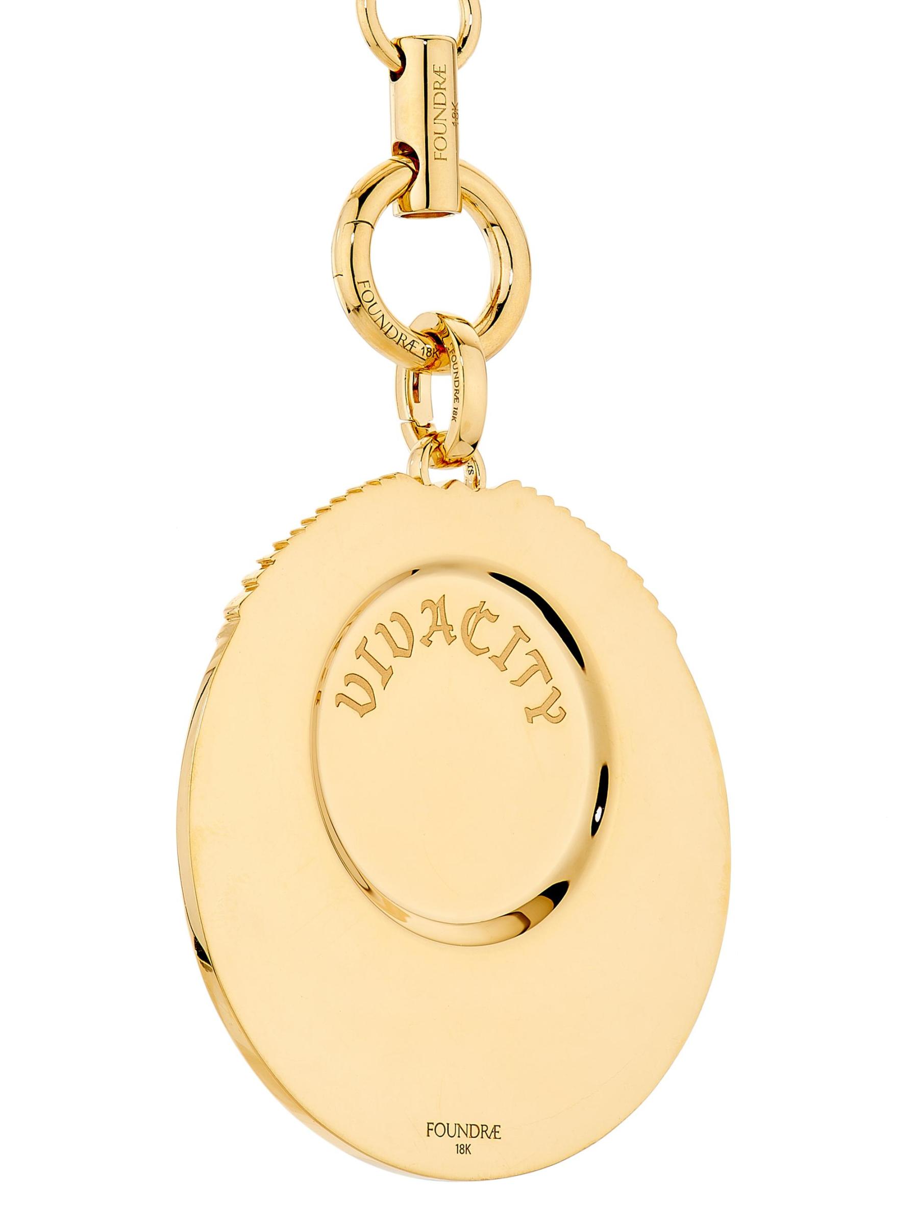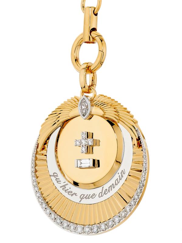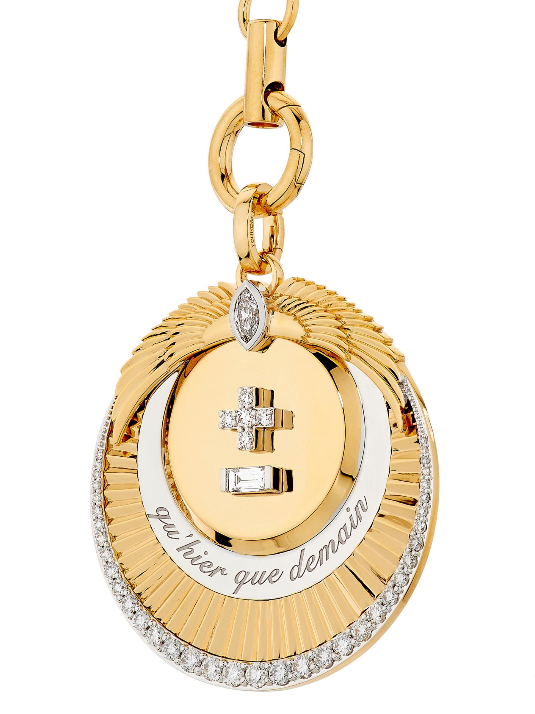 من مجموعة Vivacity. تتميز قلادة Foundrae المصنوعة يدويًا من الذهب عيار 18 قيراطًا بقلادة ميدالية عليها علامات زائد وناقص للدلالة على التعبير الفرنسي «Qu'hier que demain» الذي يعني «أكثر من الأمس وأقل من الغد». تضيف قطع الماس المختلطة لمسة من التألق إلى هذا الإكسسوار الرائع.