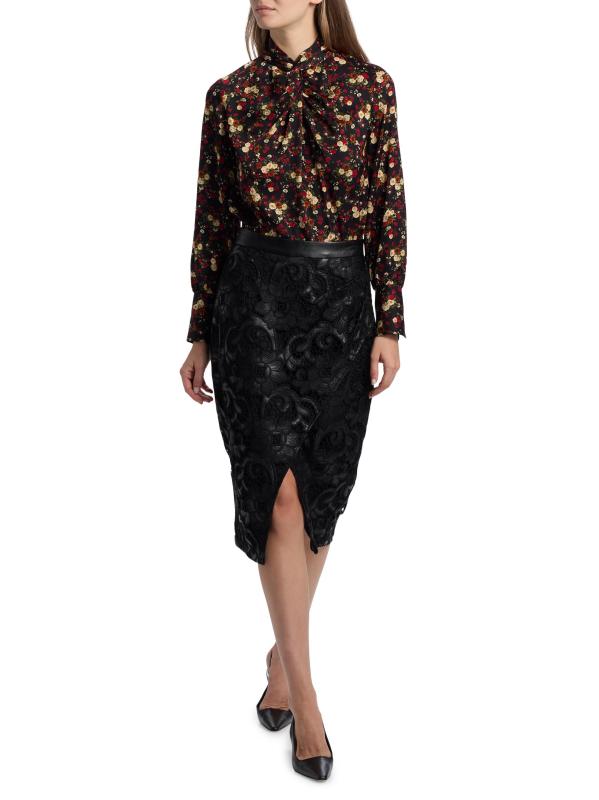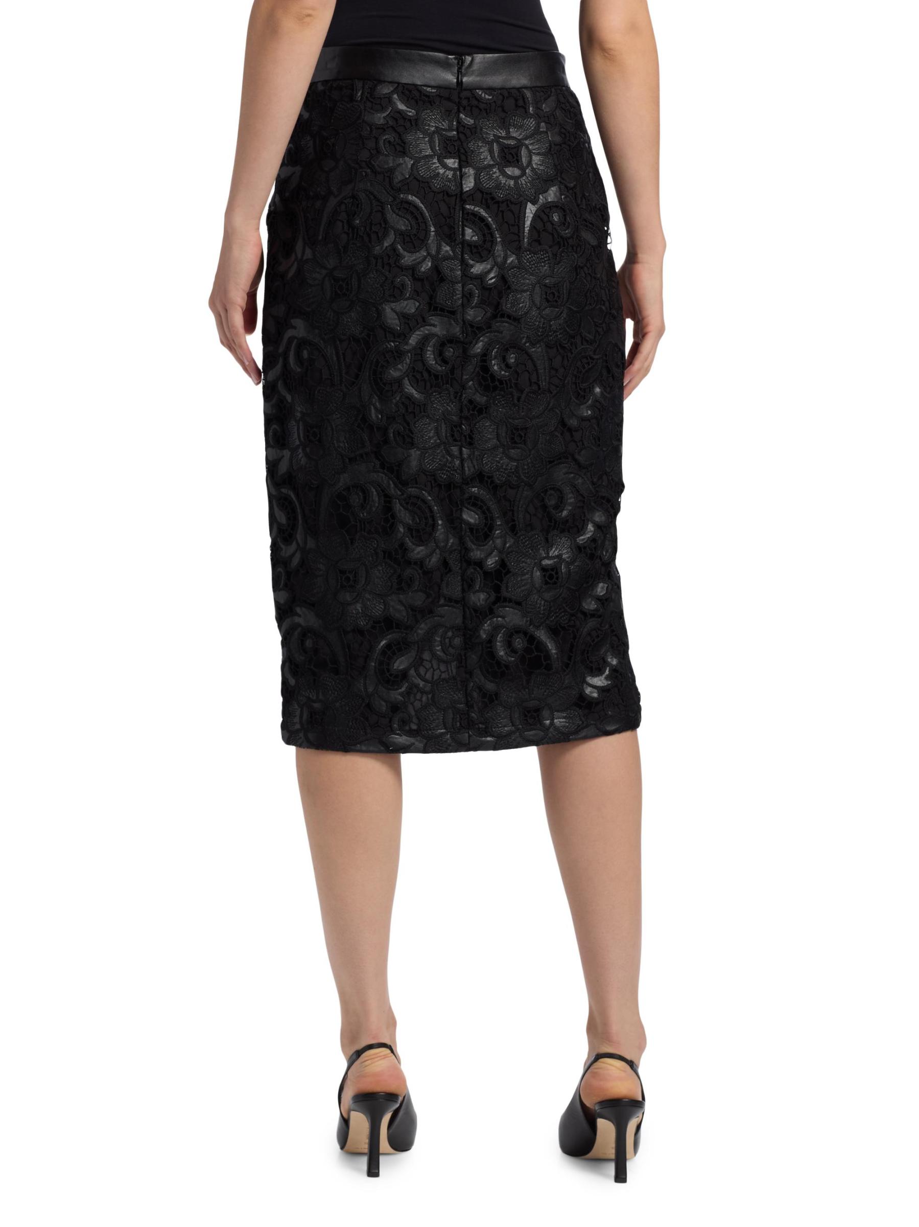 تتميز تنورة Vivienne المتوسطة هذه من Elie Tahari بتصميم من الدانتيل وواجهة ملفوفة.