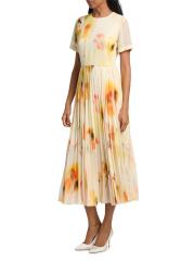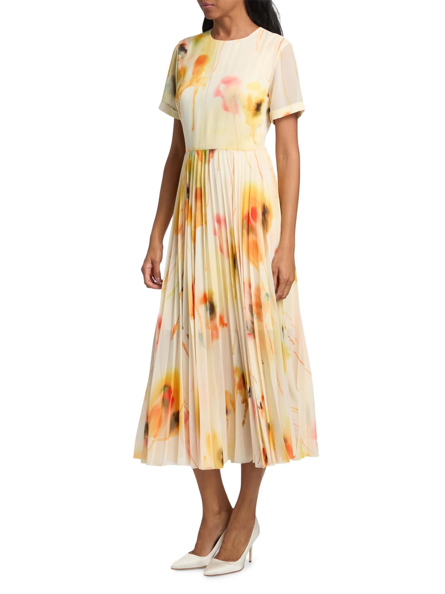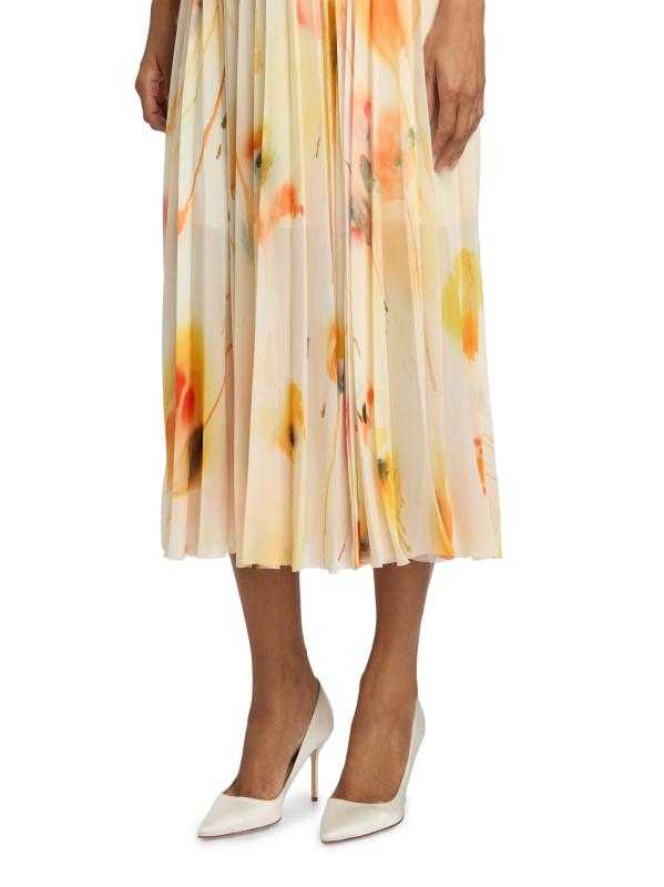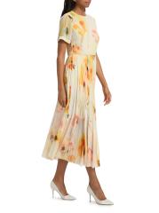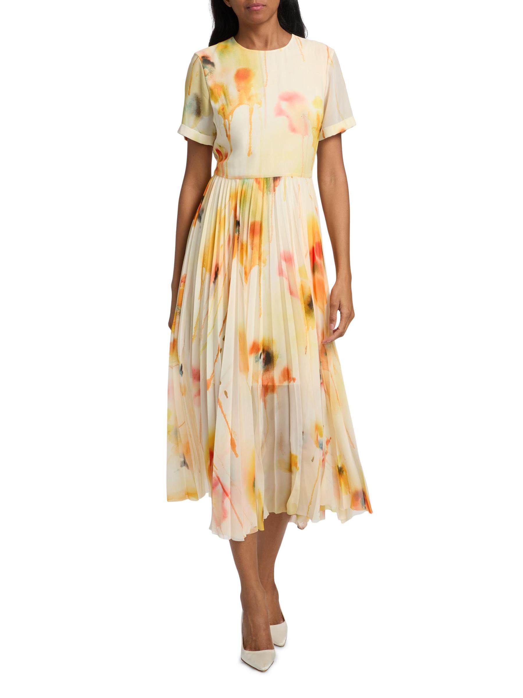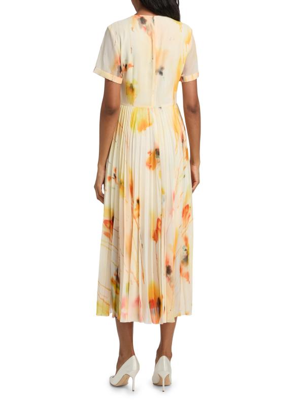 يتميز الفستان المتوسط بألوان مائية من مجموعة جايسون وو المصنوع من الشيفون الخفيف بتنورة متأرجحة ذات ثنيات. تتضمن هذه القطعة تقويرة دائرية وأكمام قصيرة وخصر طبيعي مزركش.