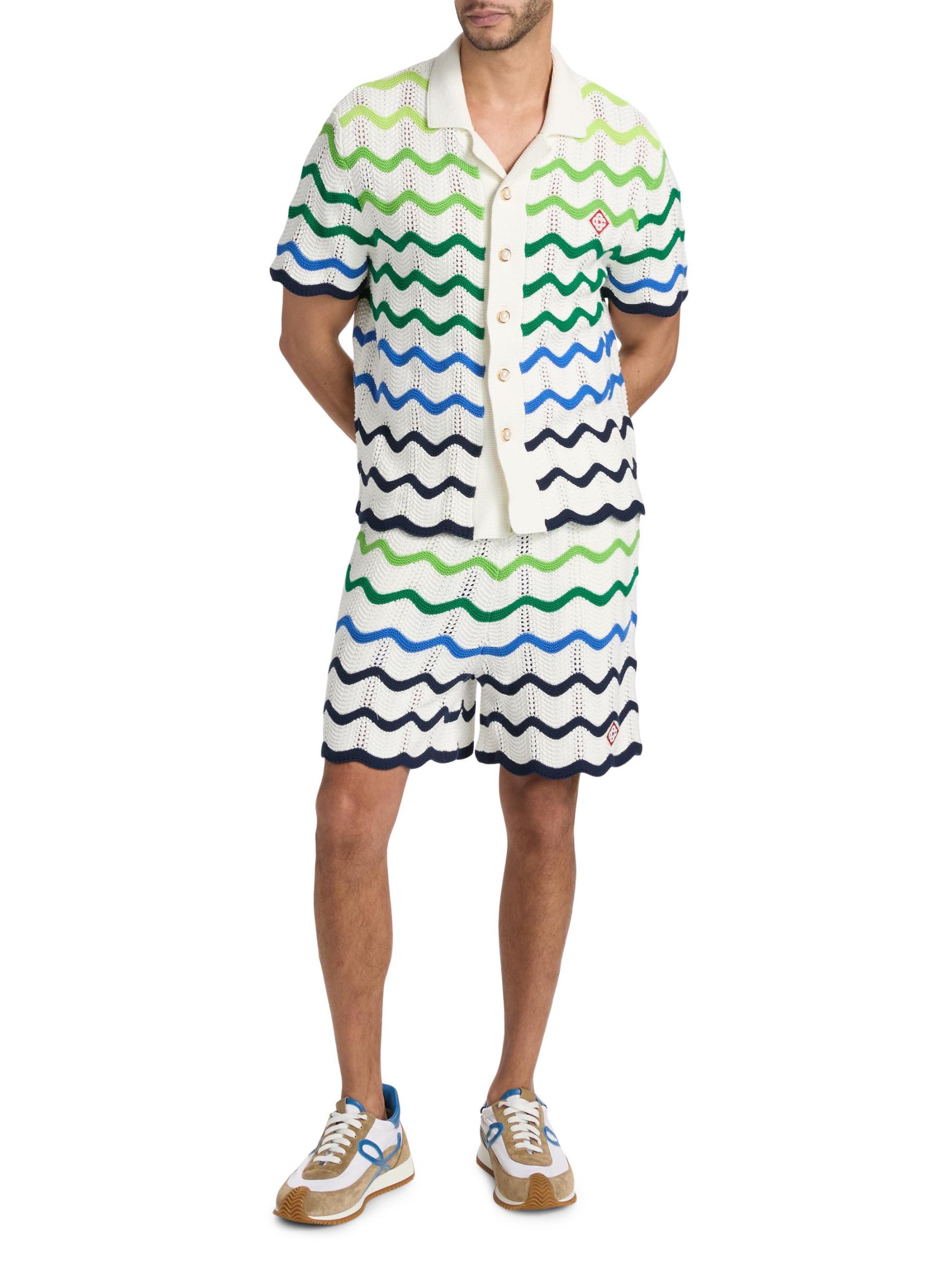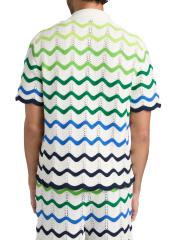 يتميز هذا القميص المحبوك من الدار البيضاء، المصنوع من القطن، بتصميم على شكل موجة مزين بتفاصيل مزخرفة للحصول على لمسة نهائية جرافيكية.طوق المخيم أكمام قصيرة فتحة أمامية بأزرار قطن الزينة: 95% فيسكوز/ 5% أسيتات فينيل الإيثيلين غسيل يدوي مستوردة