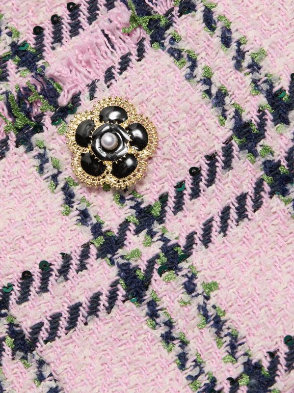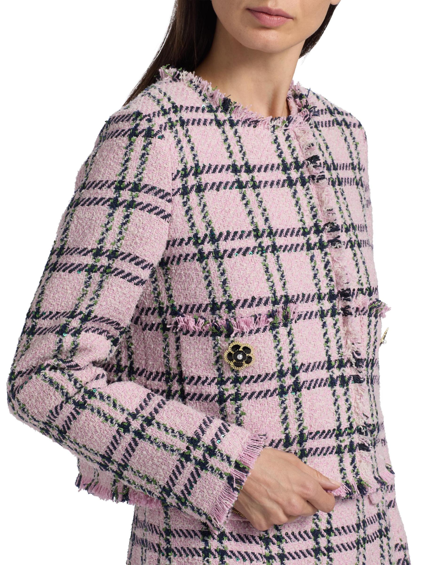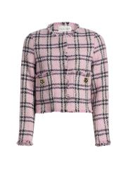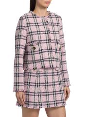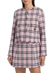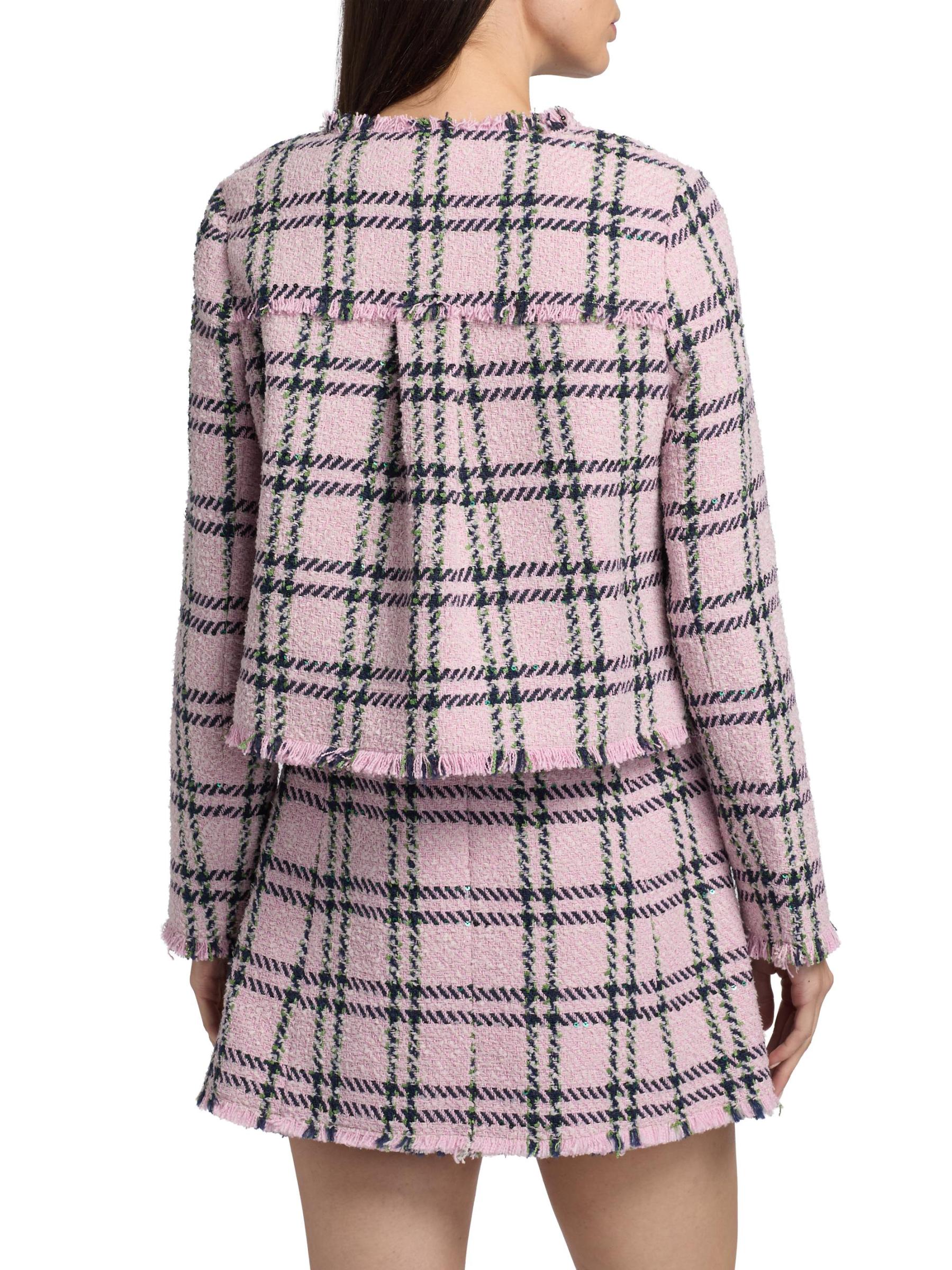 تتميّز سترة Waylin من Cara Cara، المُصمّمة بشكل صندوقي، بتصميم مصنوع من التويد، وتقليمات مُهدبة، ونمط كلاسيكي منقوش.