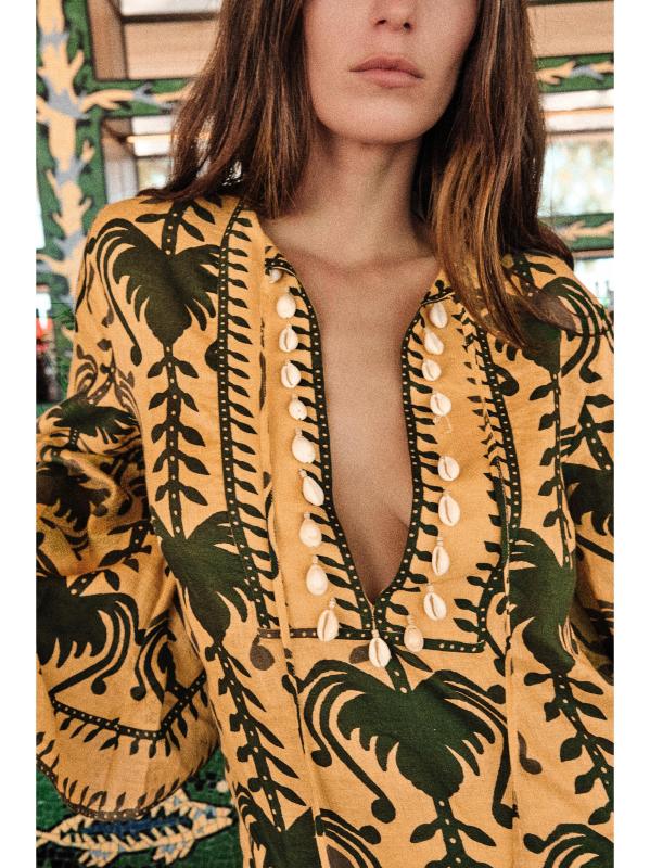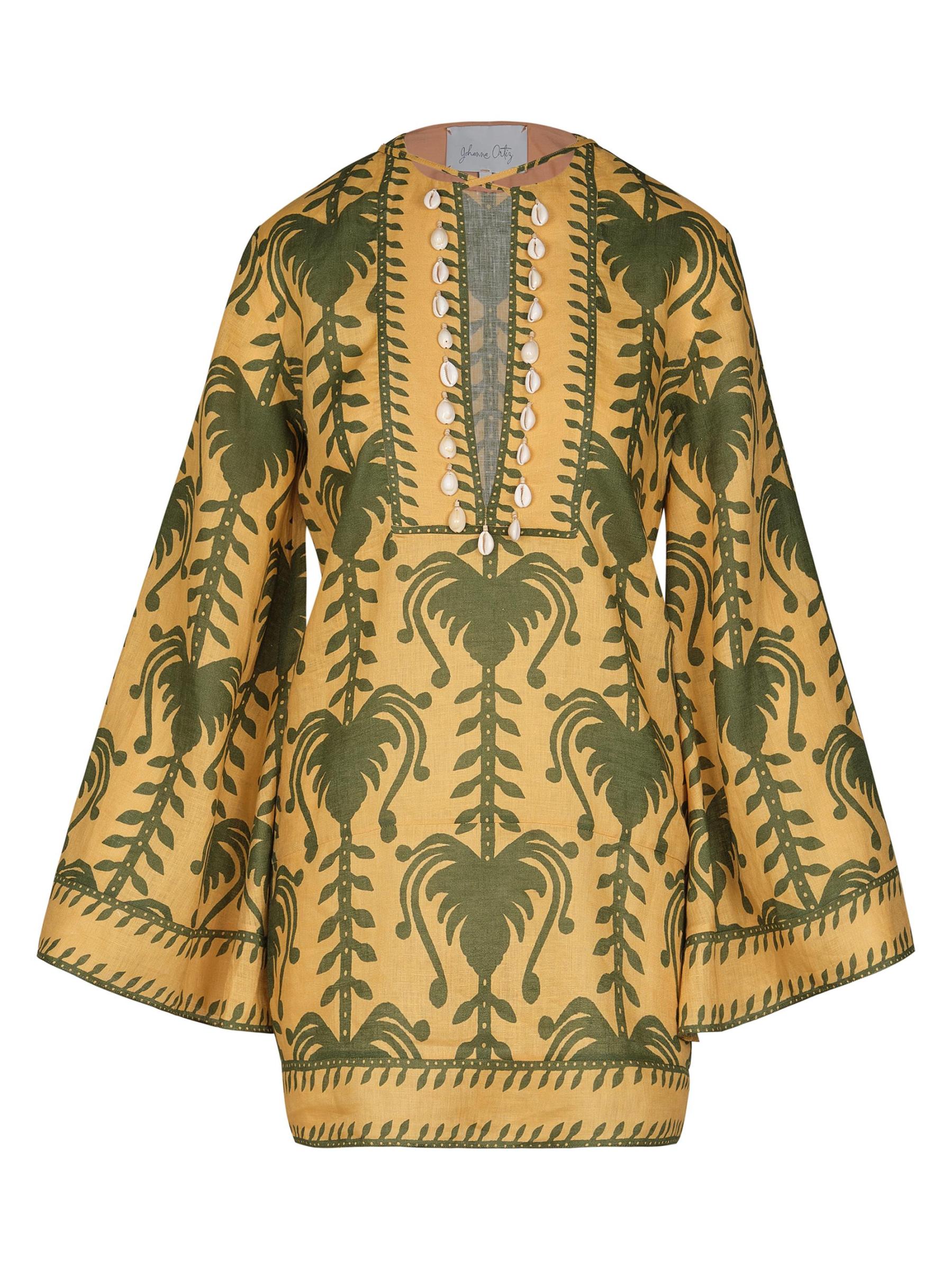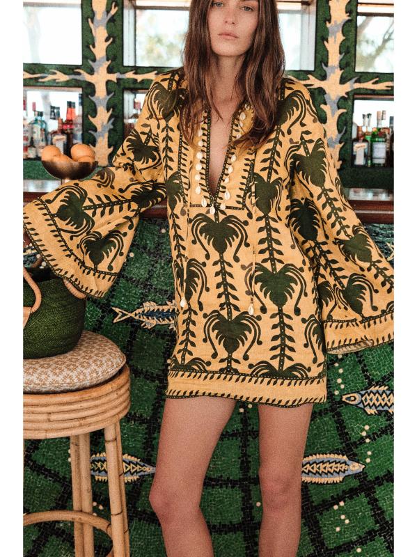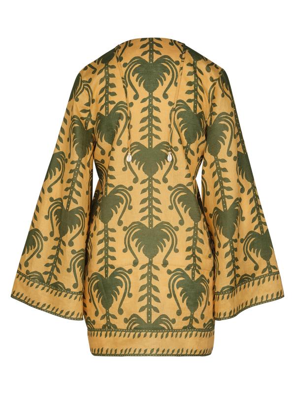 من مجموعة ويل تيل وينتر صن. صُمم فستان Wild Savannah القصير المصمم على طراز تونك Wild Savannah من الكتان الخفيف بطبعة استوائية وزخرفة مطرزة وياقة مزينة بالصدف.