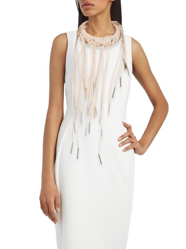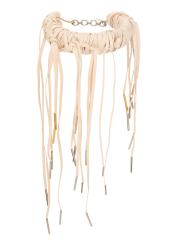 قلادة Dries Van Noten مصنوعة من الأربطة القطنية المزينة بأحجار فضية وذهبية اللون. تتميز هذه القطعة بتصميم ملفوف مع أربطة معلقة بأطوال مختلفة.