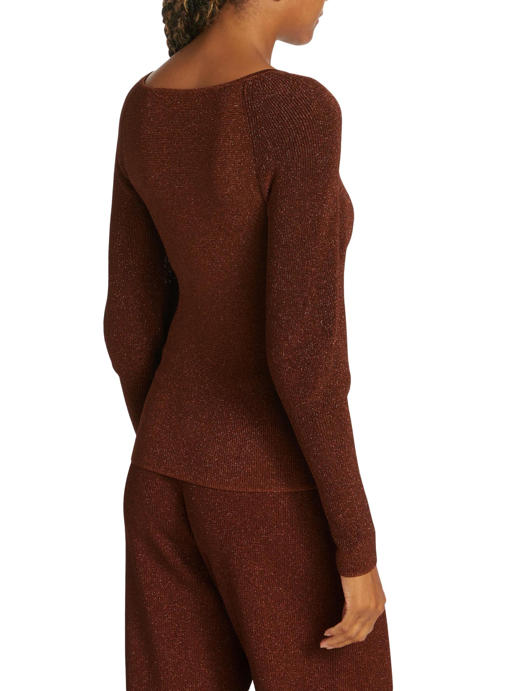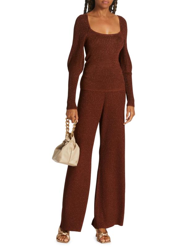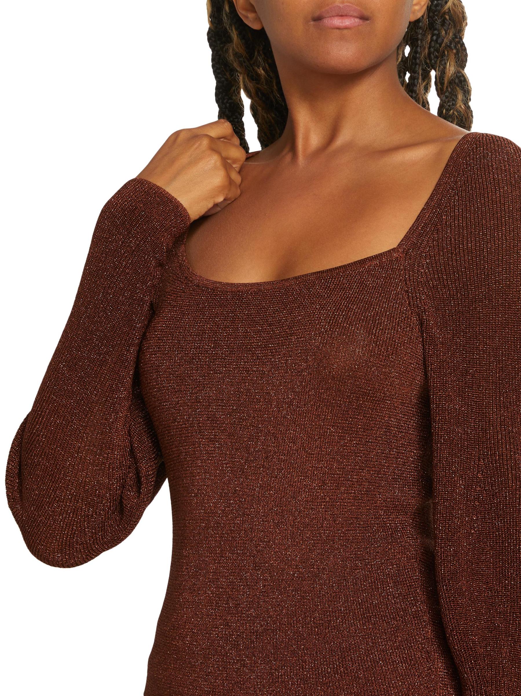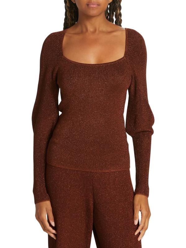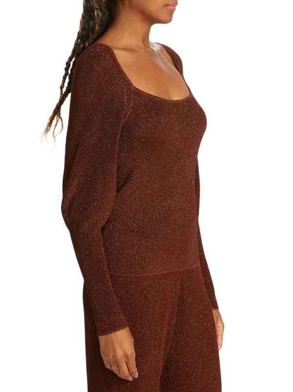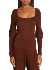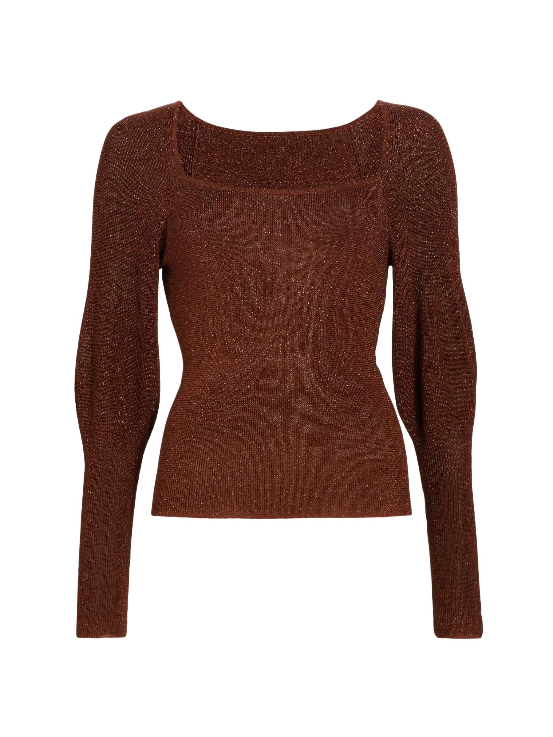 تتميّز سترة Wren من Westside برقبة مربعة منظمة، وهي محبوكة من البوليستر مع خيوط معدنية لامعة. تم الانتهاء من هذه القطعة بأكمام ضخمة منتفخة.