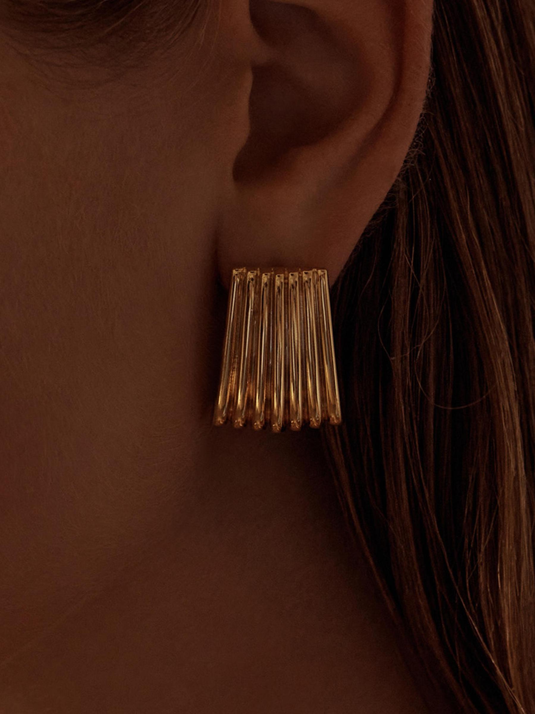 من مجموعة زاغورا. تتميّز أقراط Junie Drop الأنيقة من Amber Sceats بتصميم مخدد ومدبب، وهي مصنوعة يدويًا من النحاس المطلي بالذهب عيار 24 قيراطًا.نحاس مطلي بالذهب عيار 24 أرسل مرة أخرى صُنع في إيطاليا