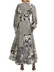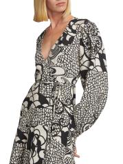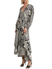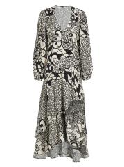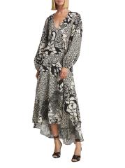 تم تصميم فستان Zarela الملفوف من Alexis للحصول على صورة منسدلة بأكمام واسعة. تضيف الطباعة التجريدية أحادية اللون التي تجمع بين الزخارف الكلية والجزئية دسيسة إلى التصميم.