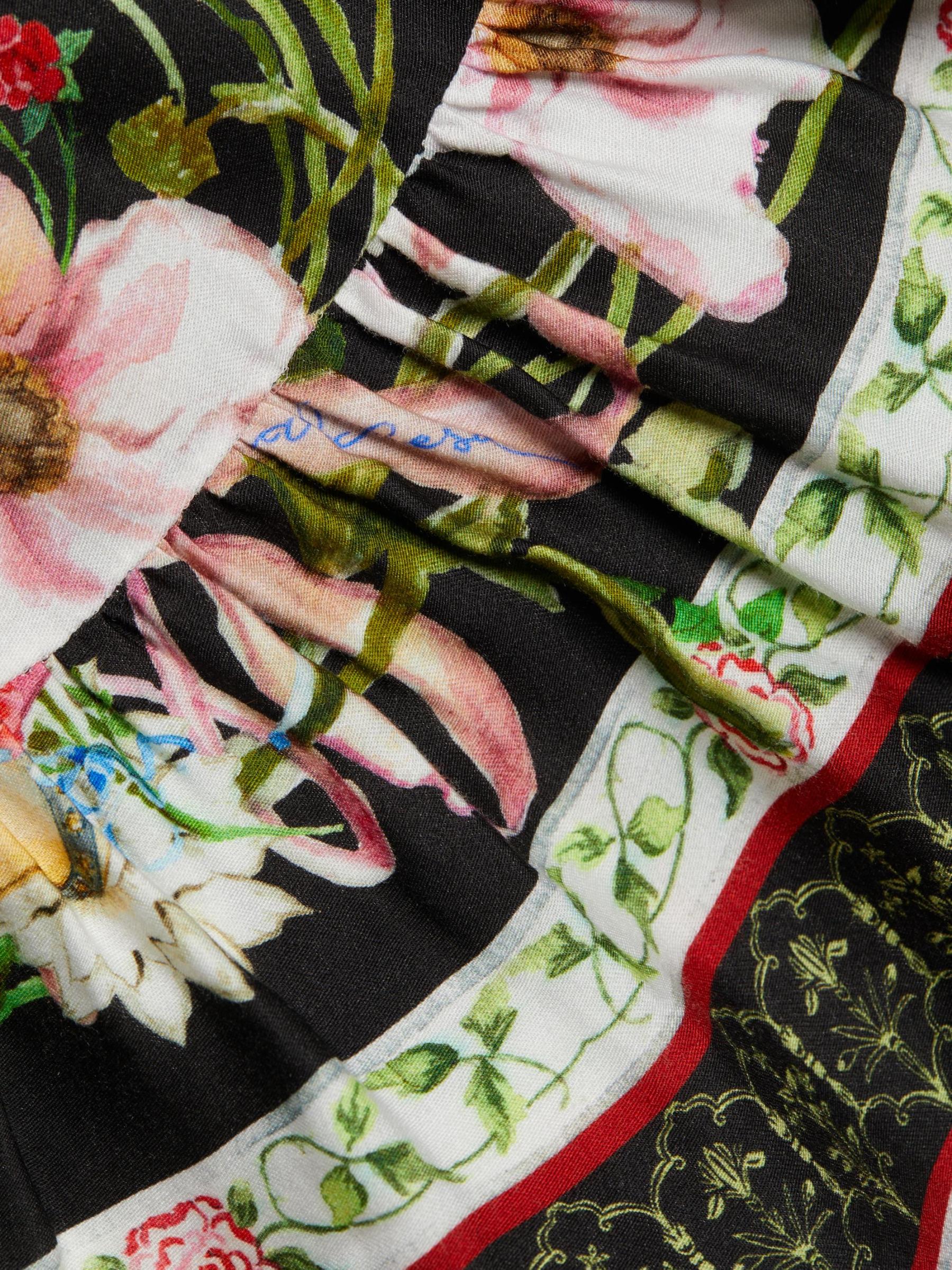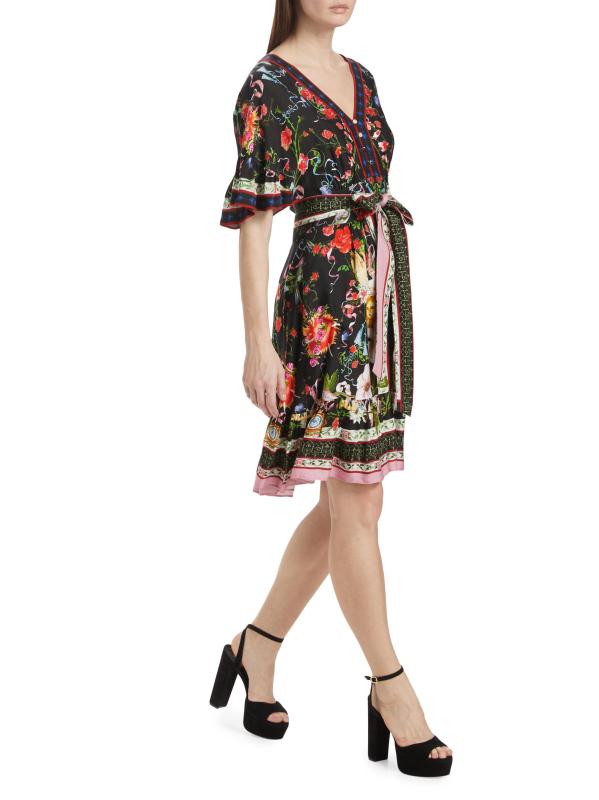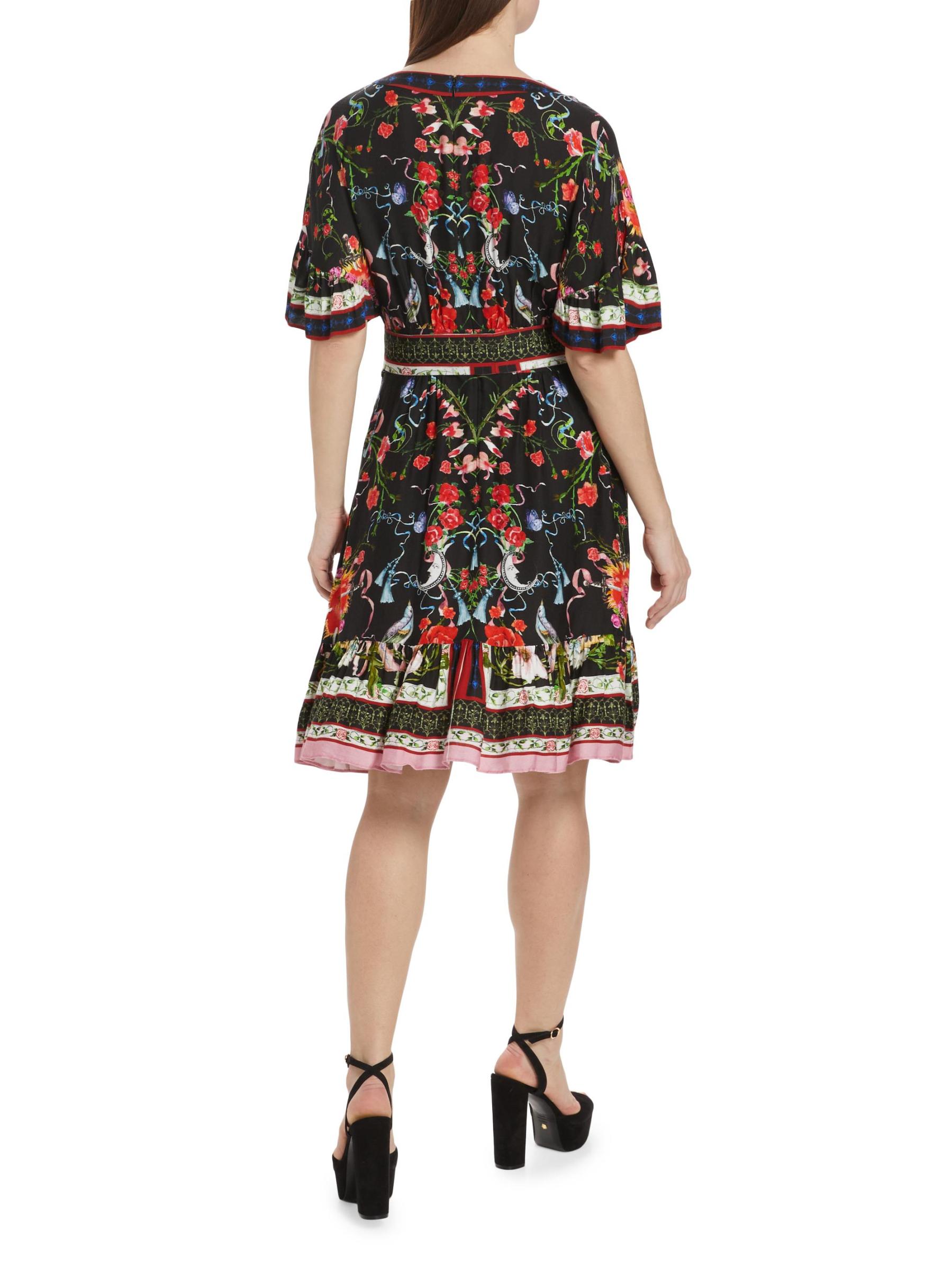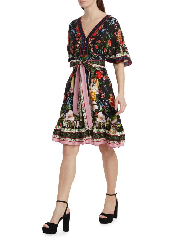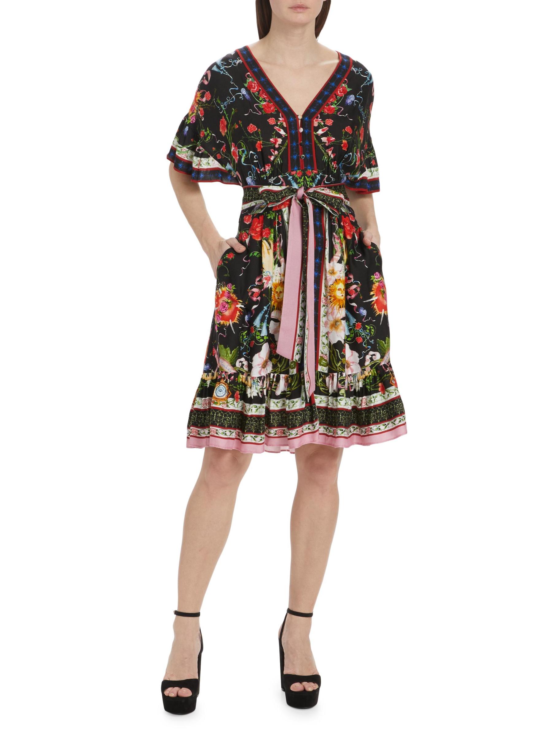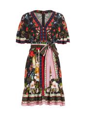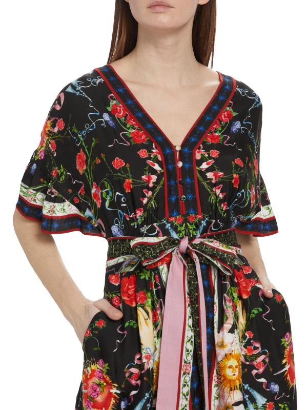 يتميز فستان Zea من Marchesa Rosa المزين بطبعة وشاح بأكمام قصيرة على شكل فراشة ورقبة على شكل حرف V وحزام ذاتي.
