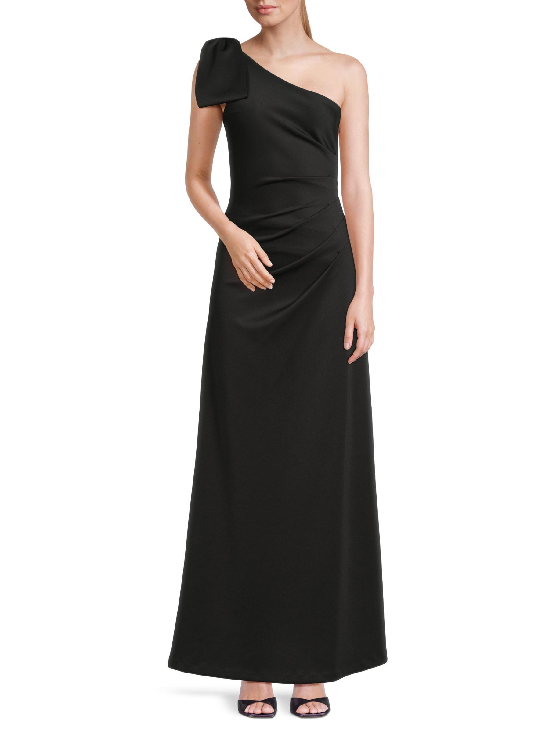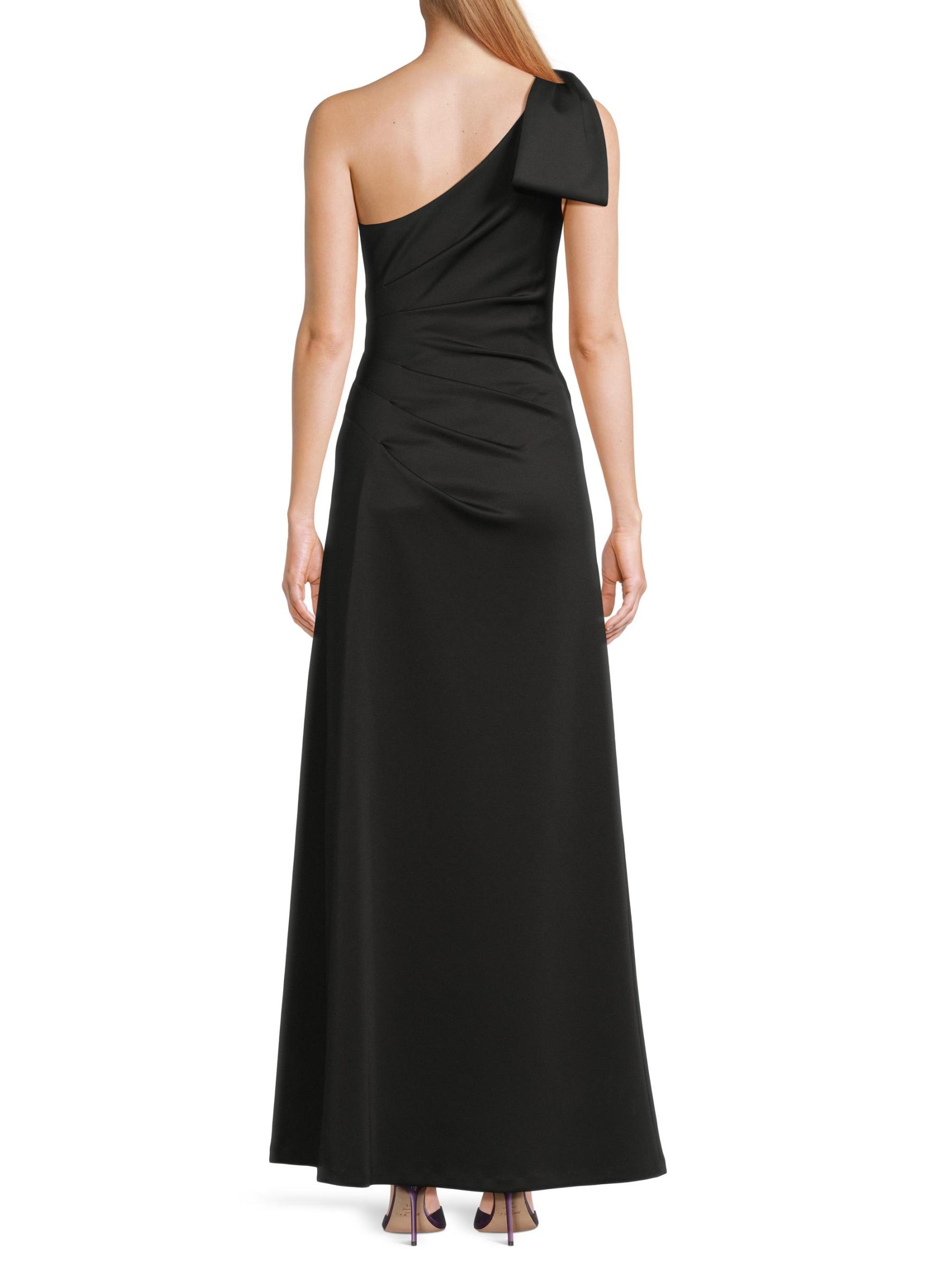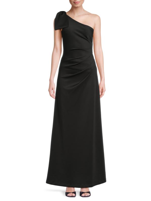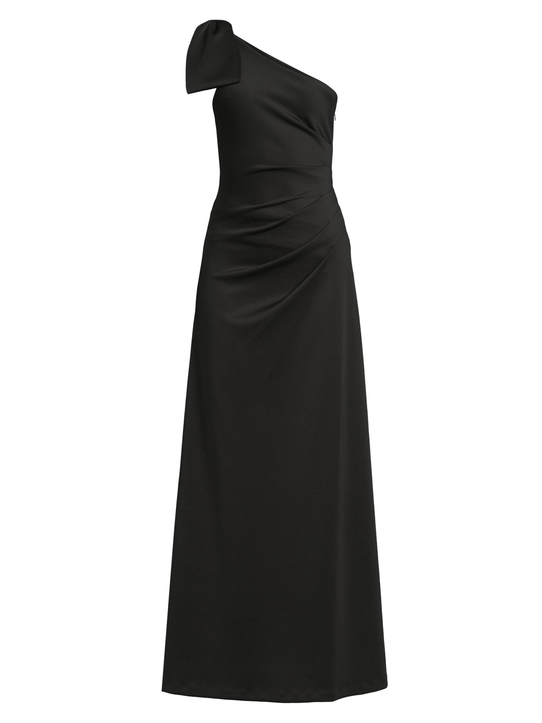 من مجموعة بلاك هالو إيف. يتميز فستان Black Halo الذي يصل إلى الأرض برقبة فيونكة مذهلة بكتف واحد وتفاصيل مجمعة عند الخصر.
