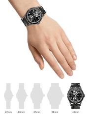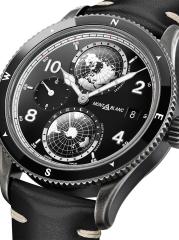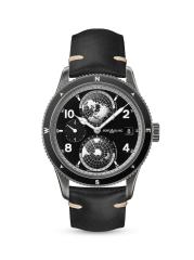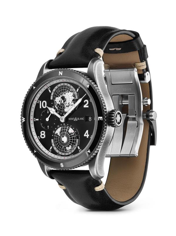 two domed globes, turning in opposite directions, that complete a full rotation in 24 hours, all tied together by a black calf leather strap with beige stitching.Automatic, self-winding movement Bi-directional turning bezel Domed sapphire crystal with anti-reflective coating Black dial with white luminescent rhodium-coated Arabic numerals and indexes Folding clasp Two-year limited warranty Made in Switzerland