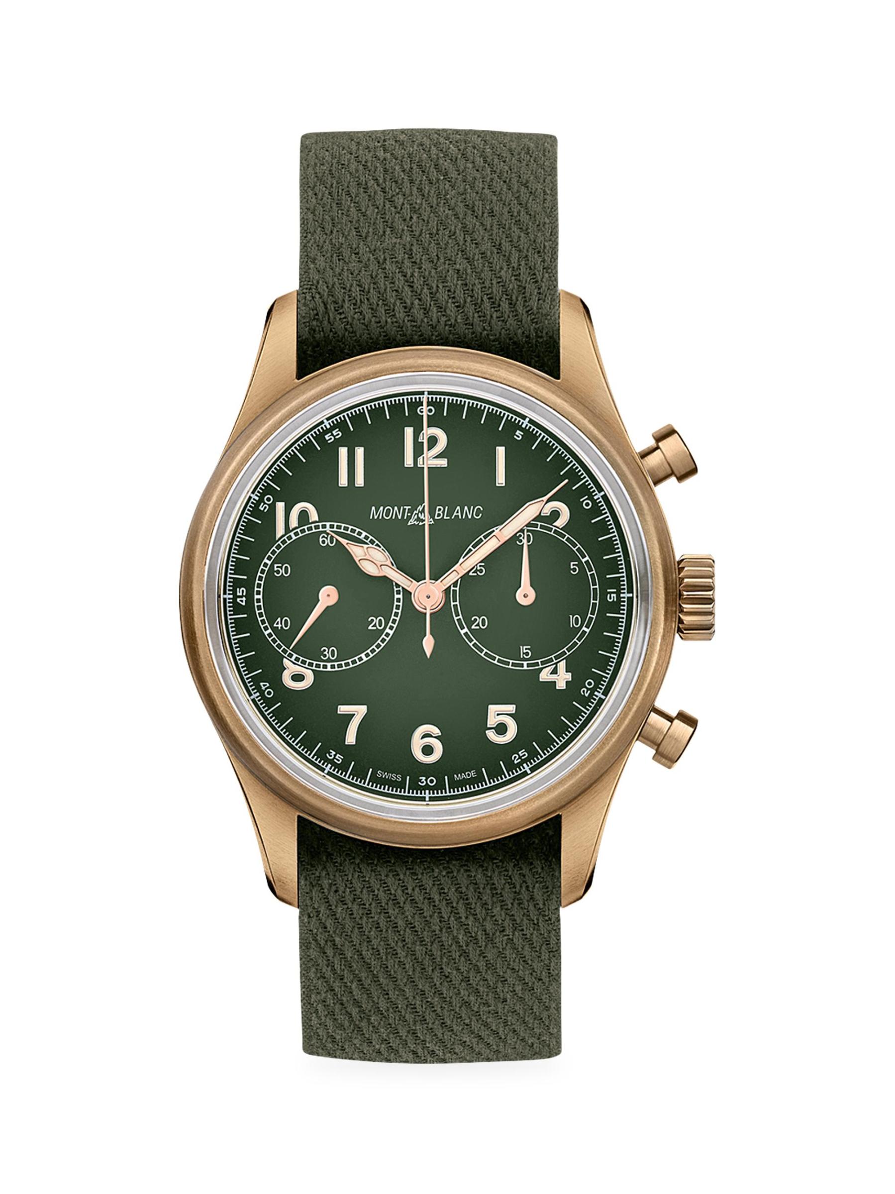 The Montblanc1858 product line is inspired by the legendary professional Minerva watches from the 1920s and 1930s which were conceived for military use and exploration. Reinterpreting these legendary timepieces, theMontblanc1858 product line expresses the spirit of mountain exploration, embodying the modern trend of returning to nature. The 1858 Automatic comes in a 40 mm polished and satin-finished stainless steel case featuring slim bevelled horns. The case back is also engraved with the emblematic Mont Blanc mountain, a compass and two crossed ice pick-axes, as a nod to the spirit of mountain exploration. For legibility and design, the black dial contrasts with historical luminescent cathedral-shaped hands with a “cloisonné” design that has been slightly domed for one of the finest finishes. Other details include beige SuperLumiNova*-coated Arabic numerals, a railway minutes track and the origina lMontblanc logo from the 1930s era with its historical font and emblem of the Mont Blanc mountain. The timepiece is equipped with a khaki-green nubuck calf leather strap.Automatic, self-winding movement Fixed stainless steel bezel Khaki-green dial Arabic numerals Luminescent rose gold-coated hours and minutes hands Second hand Two chronograph subdials Satin-finished bronze aluminum case Nato strap Ardillon buckle Made in Switzerland