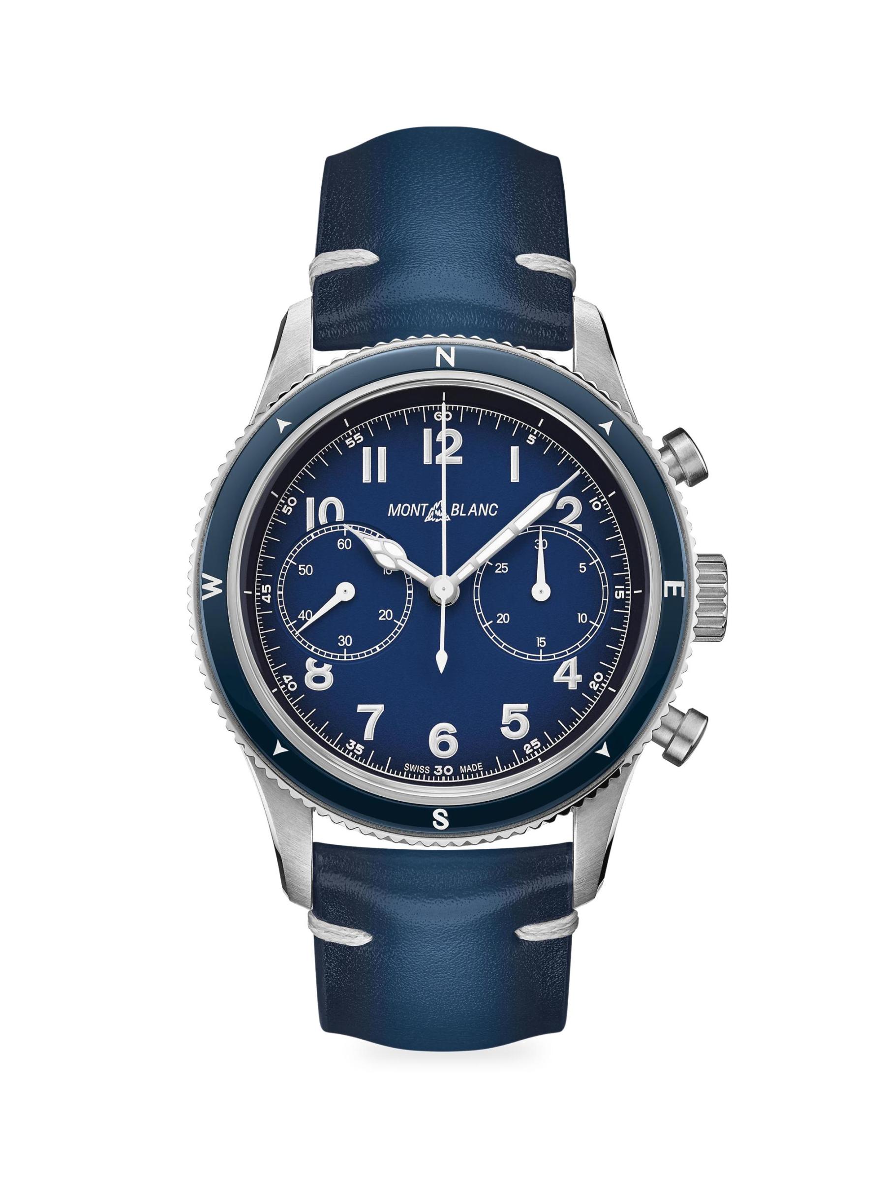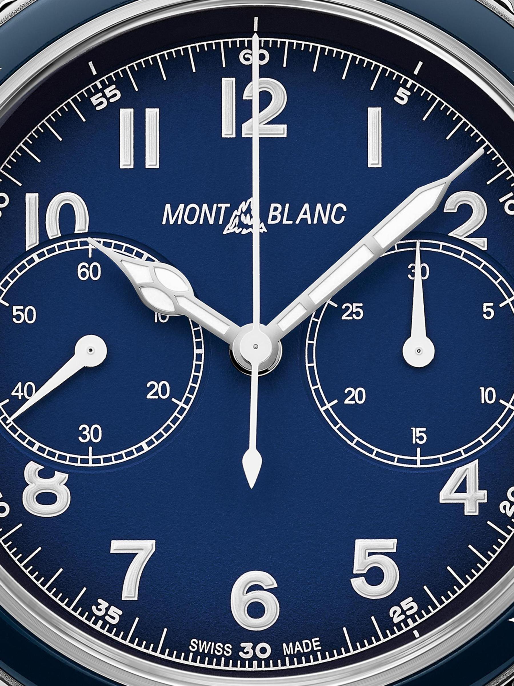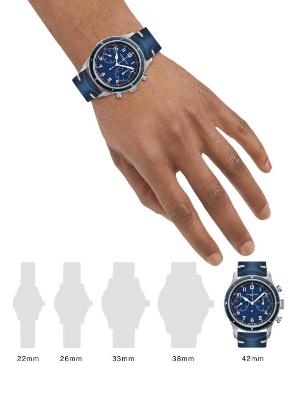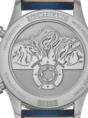 The Montblanc 1858 product line is inspired by the legendary professional Minerva watches from the 1920s and 1930s, which were conceived for military use and exploration. Reinterpreting these legendary timepieces, the Montblanc 1858 product line expresses the spirit of mountain exploration, embodying the modern trend of returning to nature. Reminiscent of glaciers, the Montblanc 1858 Automatic Chronograph watch comes with a blue aesthetic combined with a bi-directional steel bezel that has been enhanced with shiny blue ceramic and the four engraved luminescent cardinal points. The 42 mm stainless steel case features both polished and satin finishes and has been engraved with the emblematic Mont Blanc mountain, a compass, and two crossed ice pick-axes, as a nod to the Spirit of Mountain Exploration. To complete the overall design, the Montblanc 1858 Automatic Chronograph is equipped with a blue Sfumato calf leather strap.Automatic chronograph movement Stainless steel