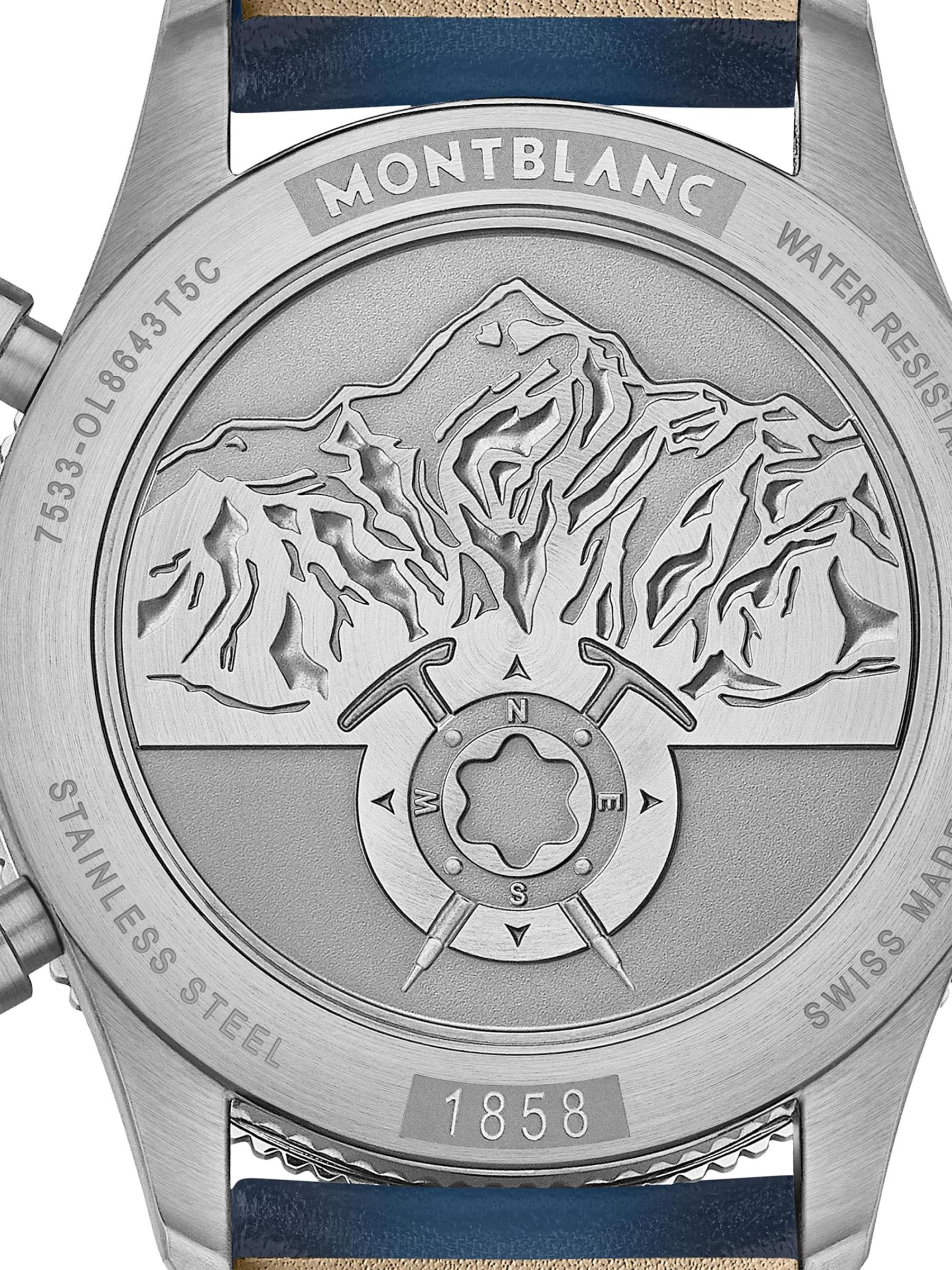 The Montblanc 1858 product line is inspired by the legendary professional Minerva watches from the 1920s and 1930s, which were conceived for military use and exploration. Reinterpreting these legendary timepieces, the Montblanc 1858 product line expresses the spirit of mountain exploration, embodying the modern trend of returning to nature. Reminiscent of glaciers, the Montblanc 1858 Automatic Chronograph watch comes with a blue aesthetic combined with a bi-directional steel bezel that has been enhanced with shiny blue ceramic and the four engraved luminescent cardinal points. The 42 mm stainless steel case features both polished and satin finishes and has been engraved with the emblematic Mont Blanc mountain, a compass, and two crossed ice pick-axes, as a nod to the Spirit of Mountain Exploration. To complete the overall design, the Montblanc 1858 Automatic Chronograph is equipped with a blue Sfumato calf leather strap.