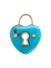 Showcasing the designer's vintage-inspired aesthetic, a vibrant turquoise stone is meticulously carved into a heart pendant with a key cutout and two shimmering bezel-set diamonds.