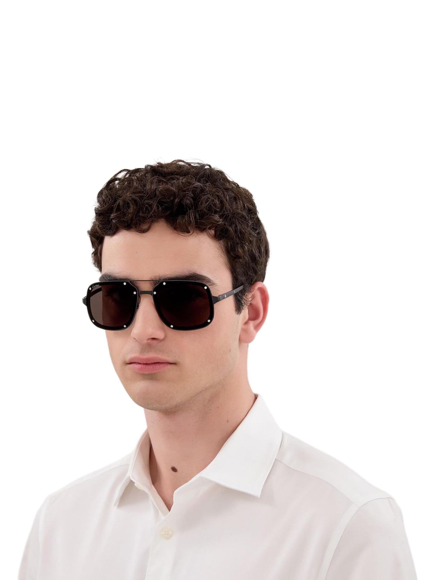Square in design with a dual brow bar, these bold sunglasses flaunt screw stud accents around the frame.