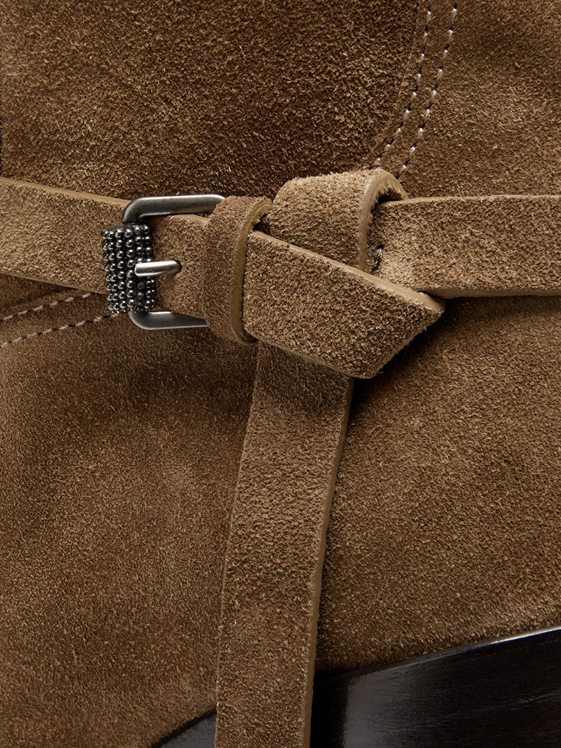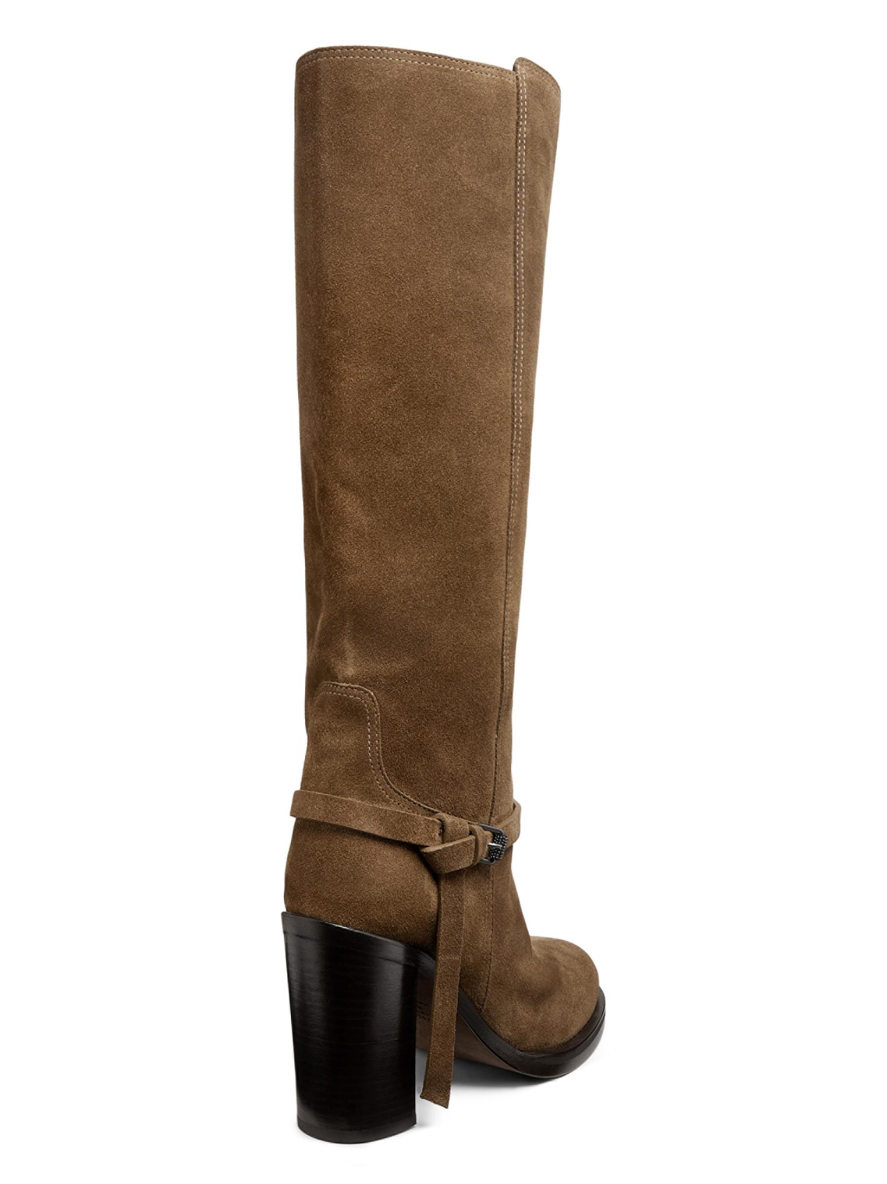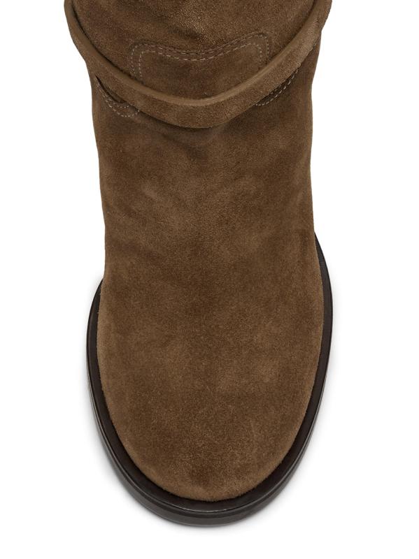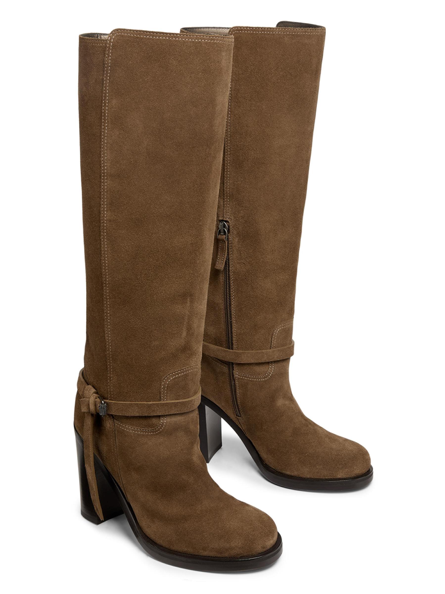 These knee-high boots from Brunello Cucinelli are crafted of soft suede and designed with a round toe and 90mm block heel.