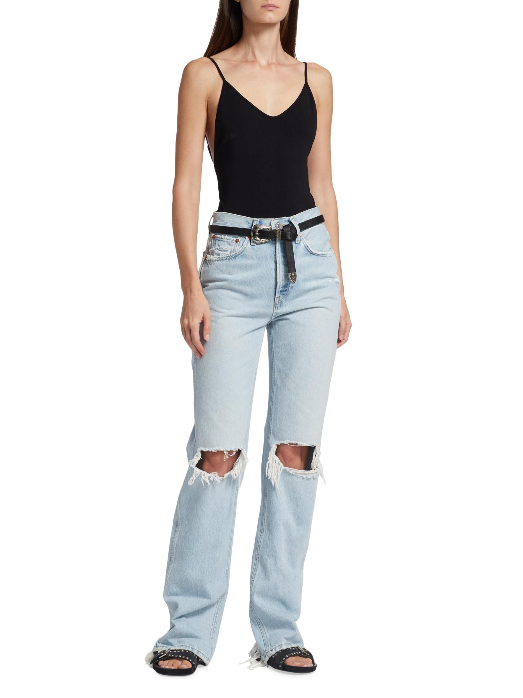These Re/done jeans feature a high-waisted, loose-leg silhouette. Heavy distressing at the knees and hems complete this rigid denim style.Five-pocket style Button fly 100% Cotton Machine wash Imported