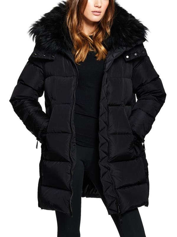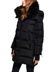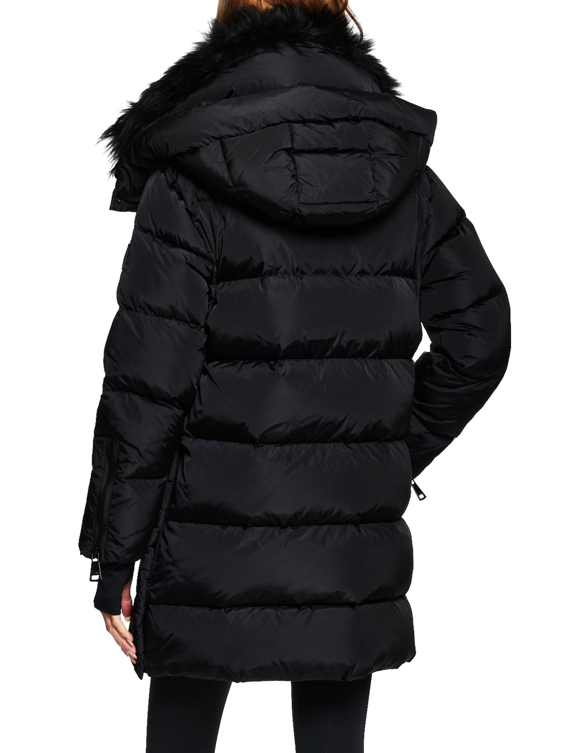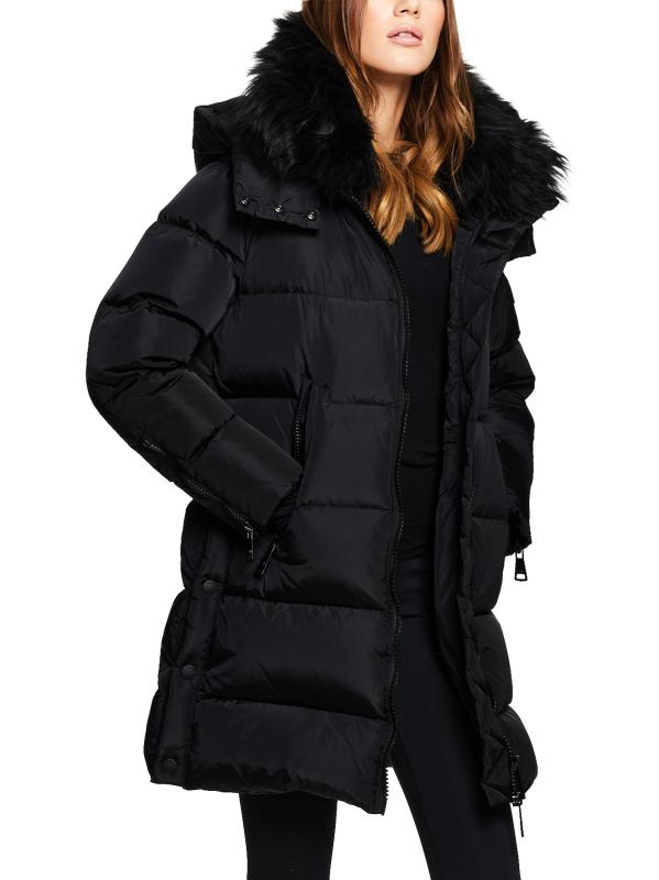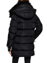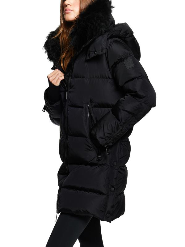 The Addison coat by Sam. flaunts a wind and water-resistant, down-filled design featuring a detachable hood with a shearing collar, side vent snap openings, spandex thumbhole cuffs, and two zip pockets.