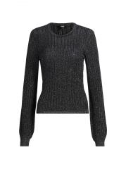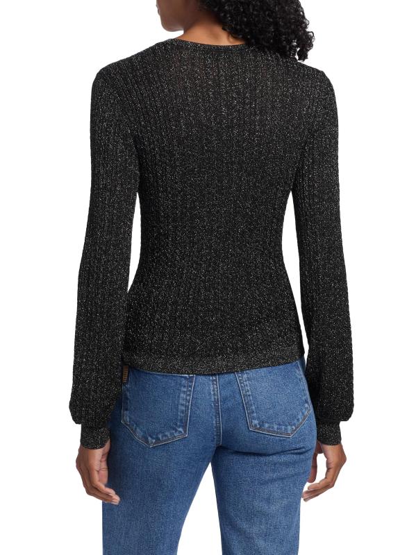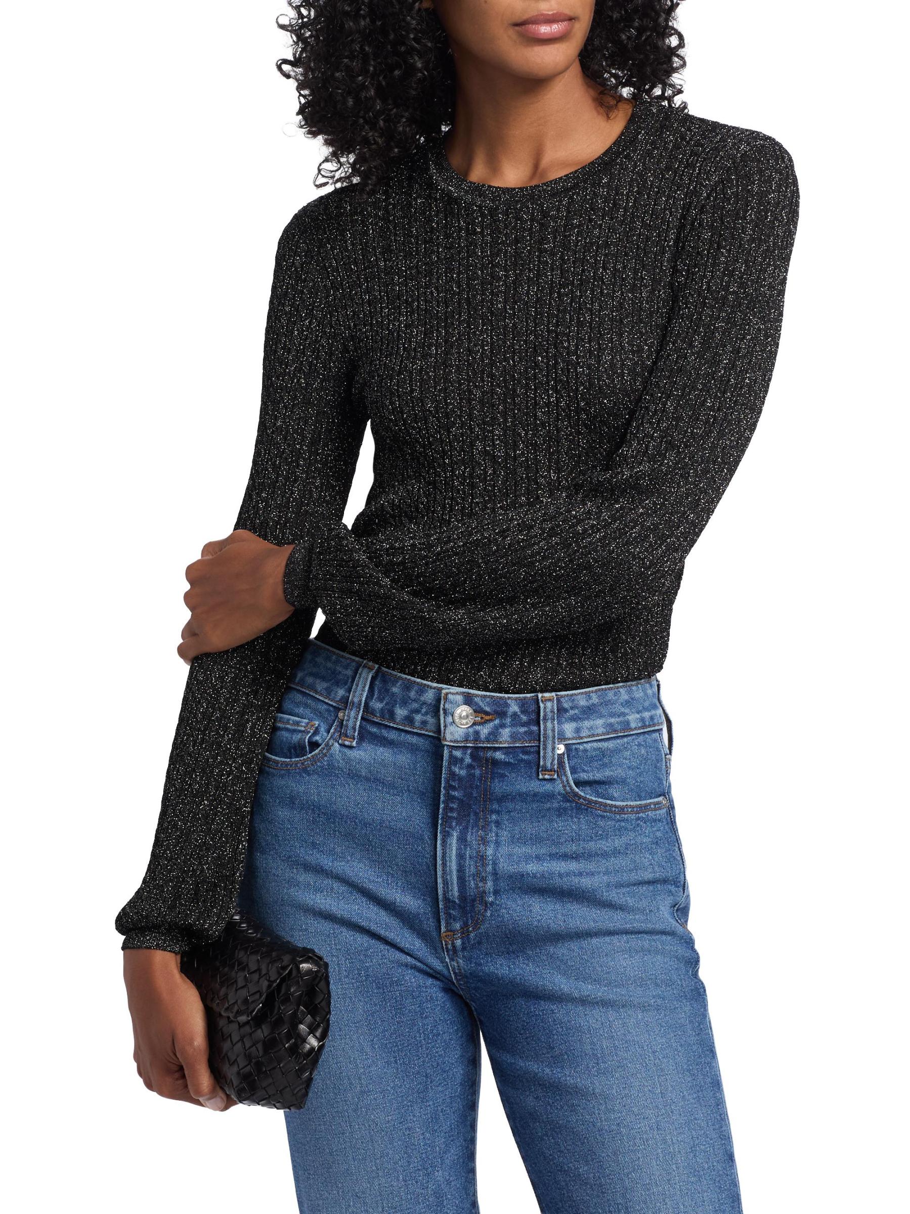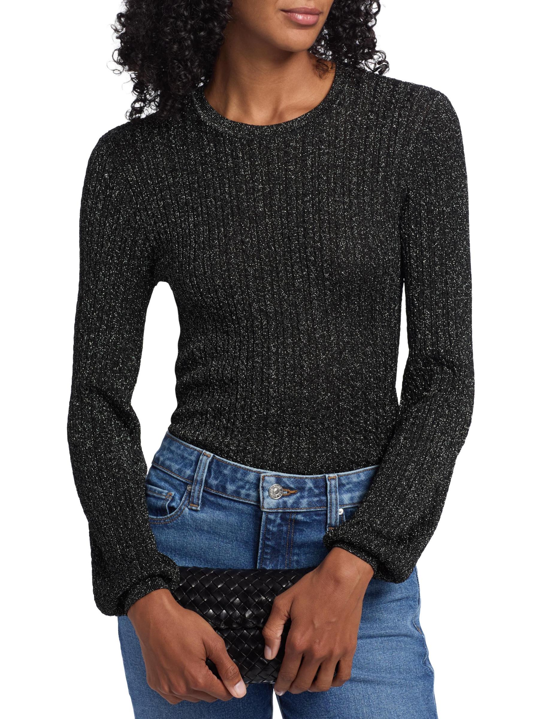 Paige's Adela sweater features a metallic rib-knit finish, long balloon sleeves, and a crew neckline.