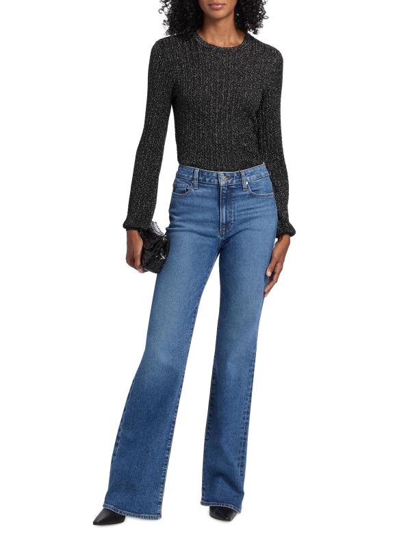 Paige's Adela sweater features a metallic rib-knit finish, long balloon sleeves, and a crew neckline.Crewneck Long sleeves, rib-knit cuffs Pulls over 87% viscose/13% polyester Dry clean Imported