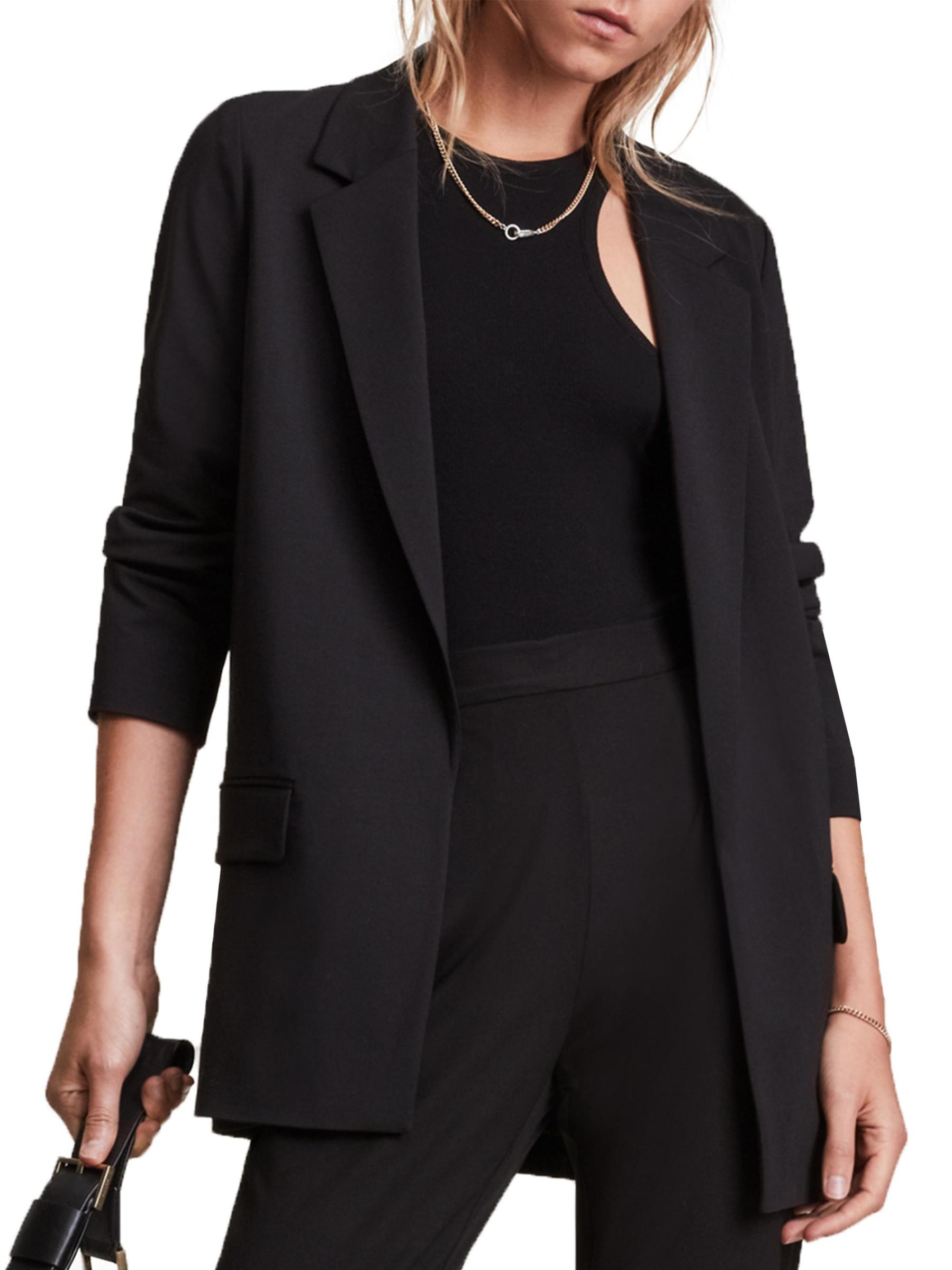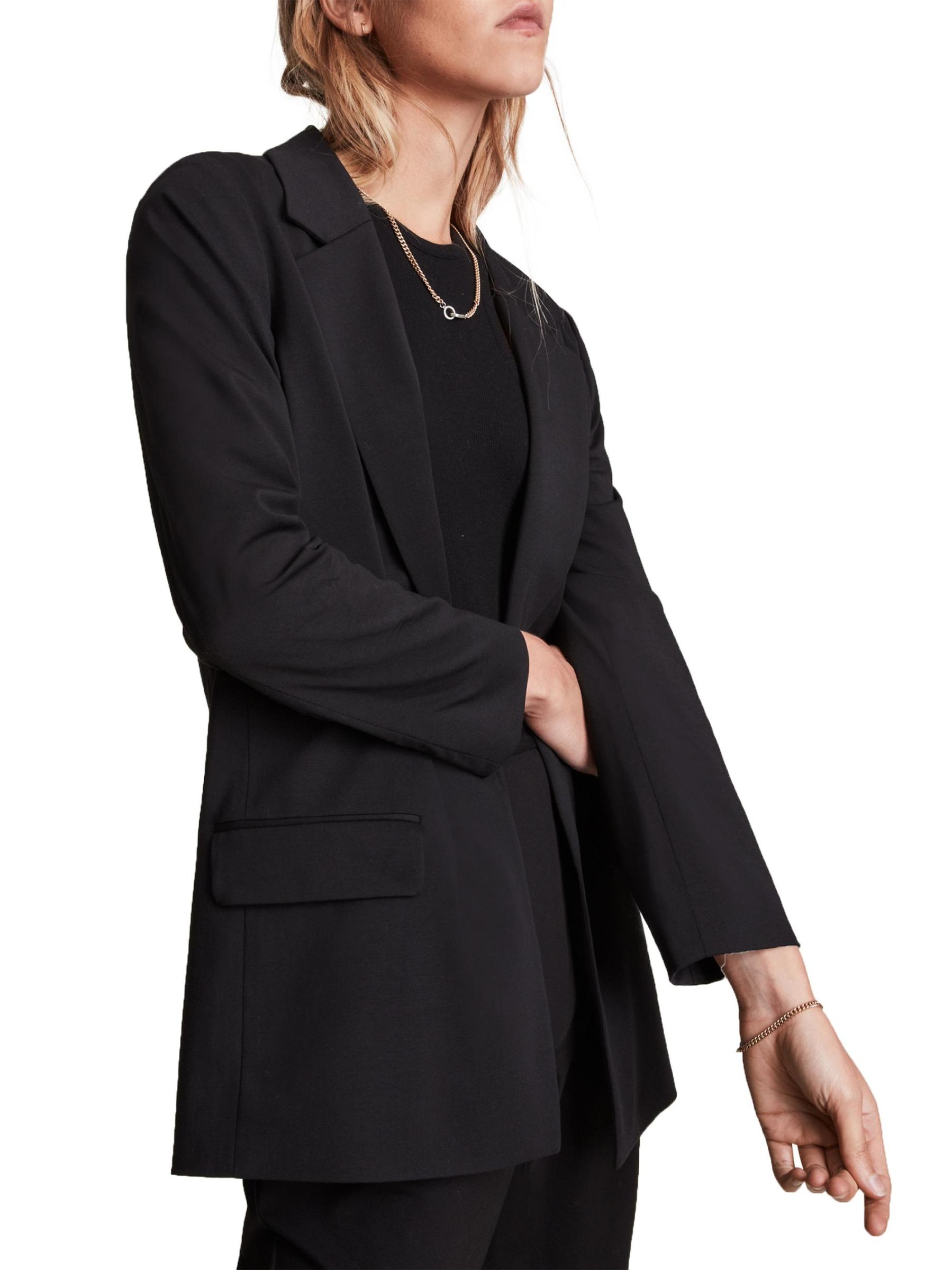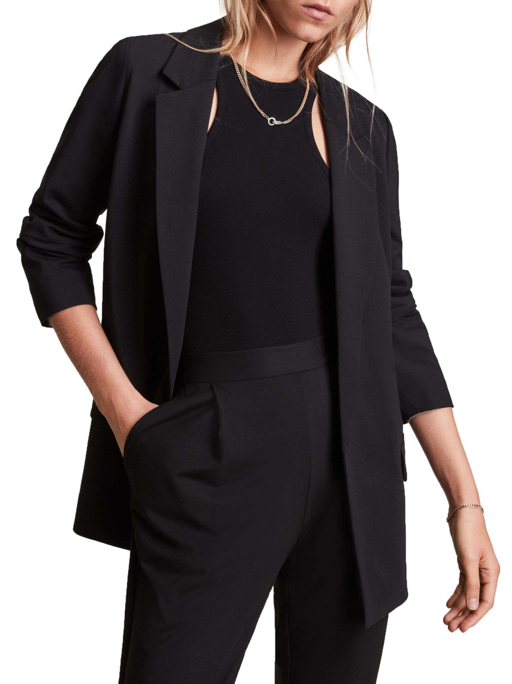 Crafted of a soft cotton jersey, AllSaints’ Aleida blazer is styled with notched lapels, long sleeves, and an open front. This tailored piece is finished with side flap pockets.