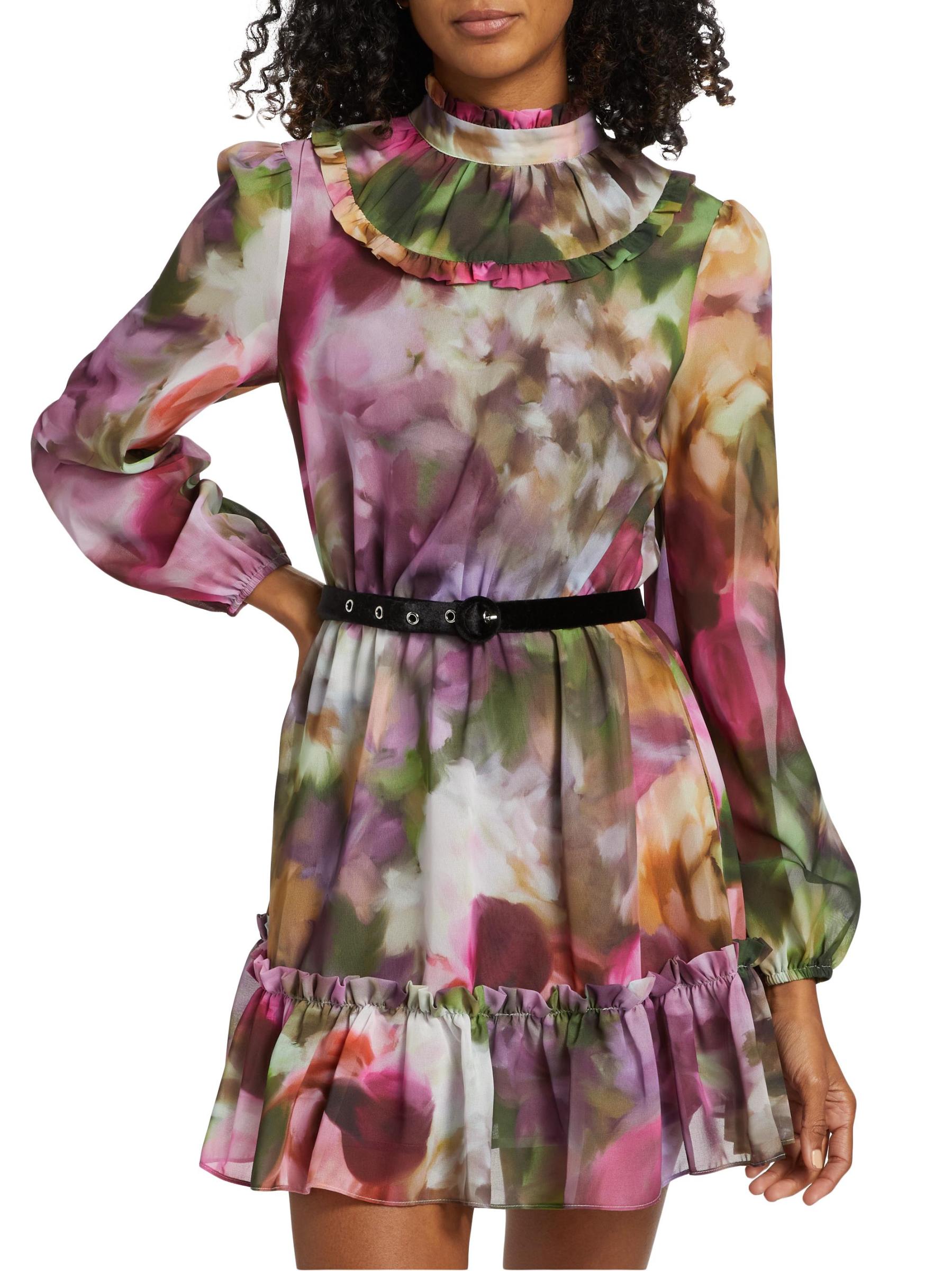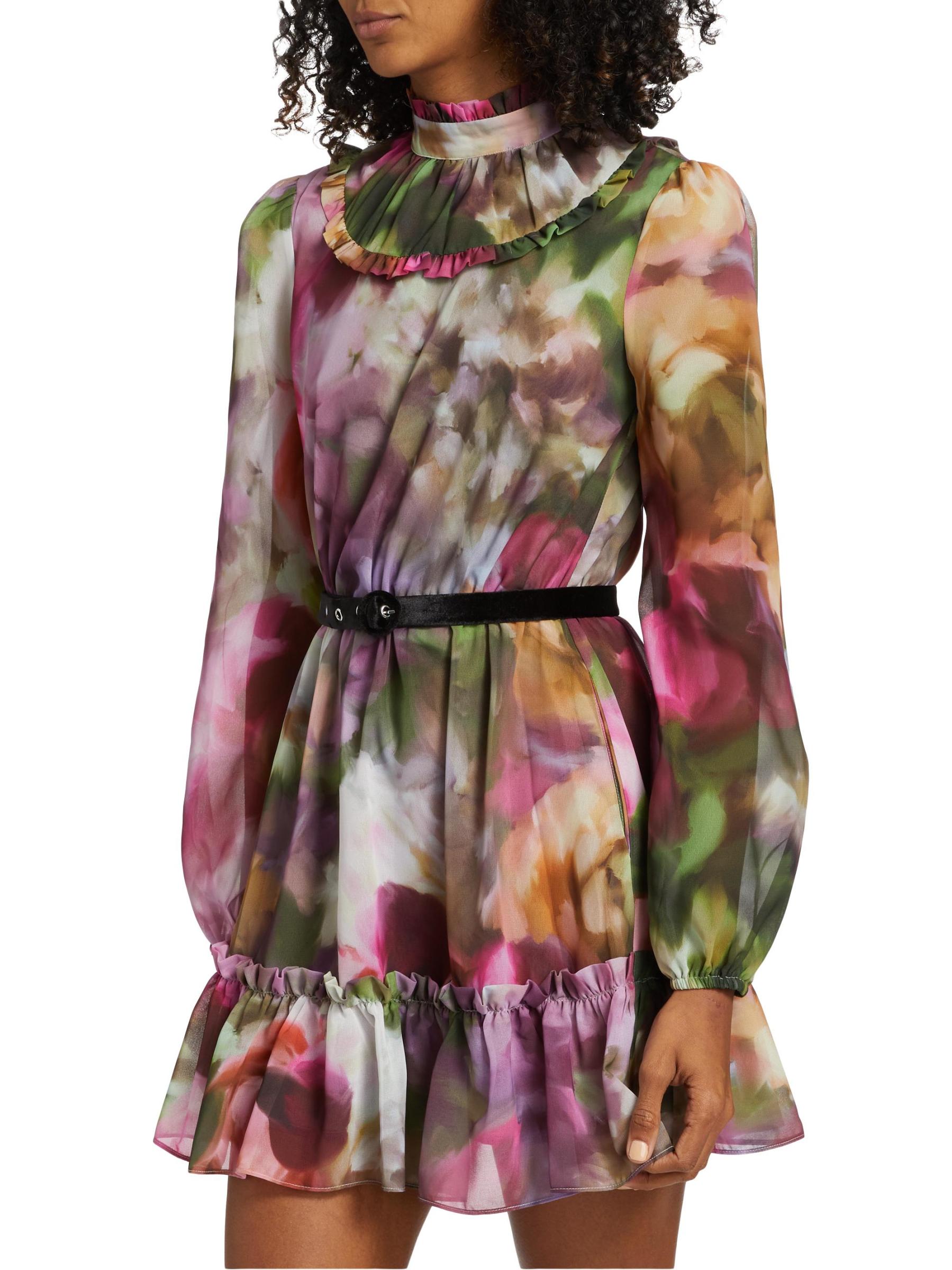 LDT's Alex minidress highlights a painterly floral print and contrasting velvet belted waist. Long sleeves and a ruffled yoke complete the look.
