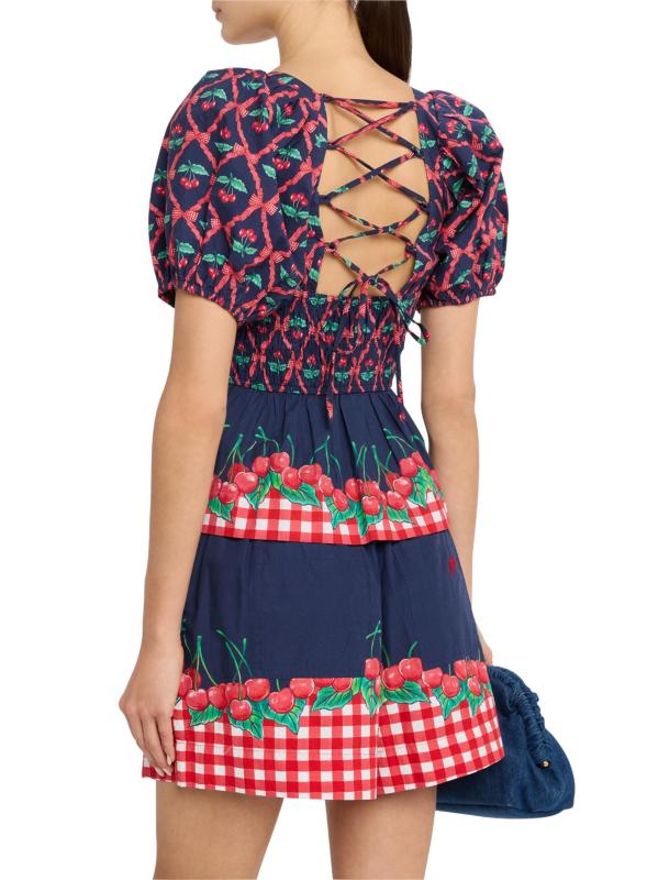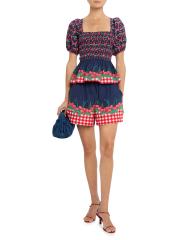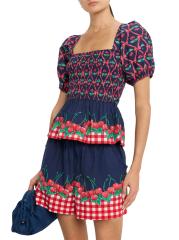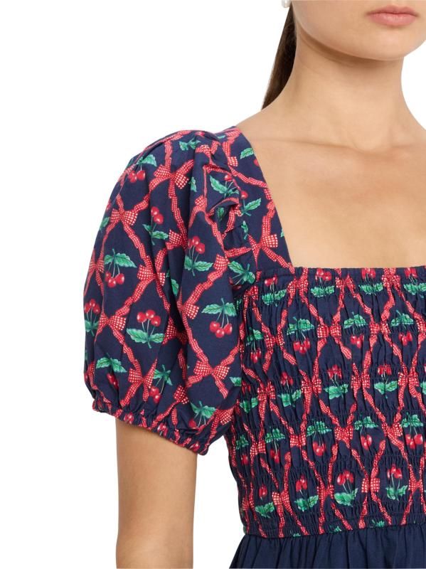 Damson Madder’s Allegra Cherry Pie printed blouse features a smocked bodice and peplum hem with a crisscross tie back.Square neck Short puff sleeves Peplum hem Crisscross tie back 100% Cotton Machine wash Imported