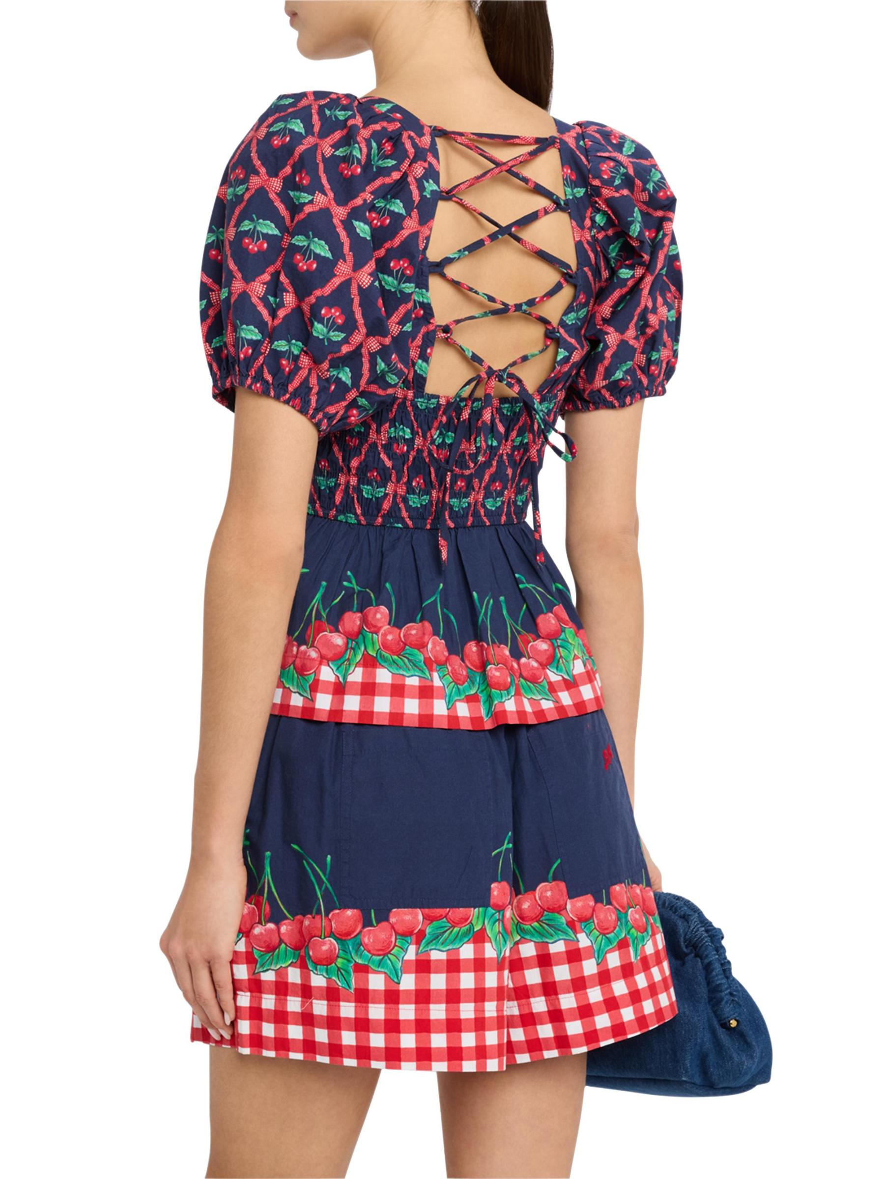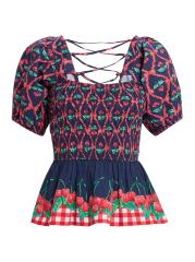 Damson Madder’s Allegra Cherry Pie printed blouse features a smocked bodice and peplum hem with a crisscross tie back.
