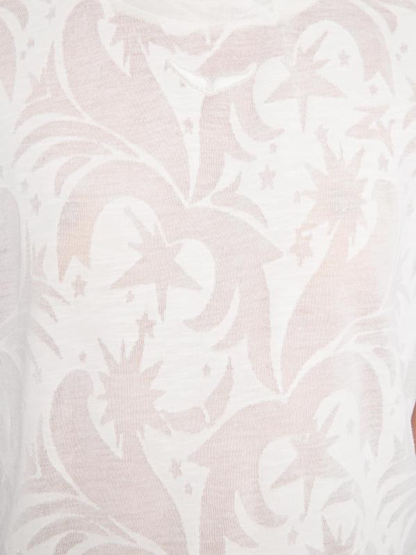 Voltaire features a semi-sheer filigree-inspired motif.Crewneck Short sleeves Pulls over 61% polyester/39% cotton Machine wash Imported