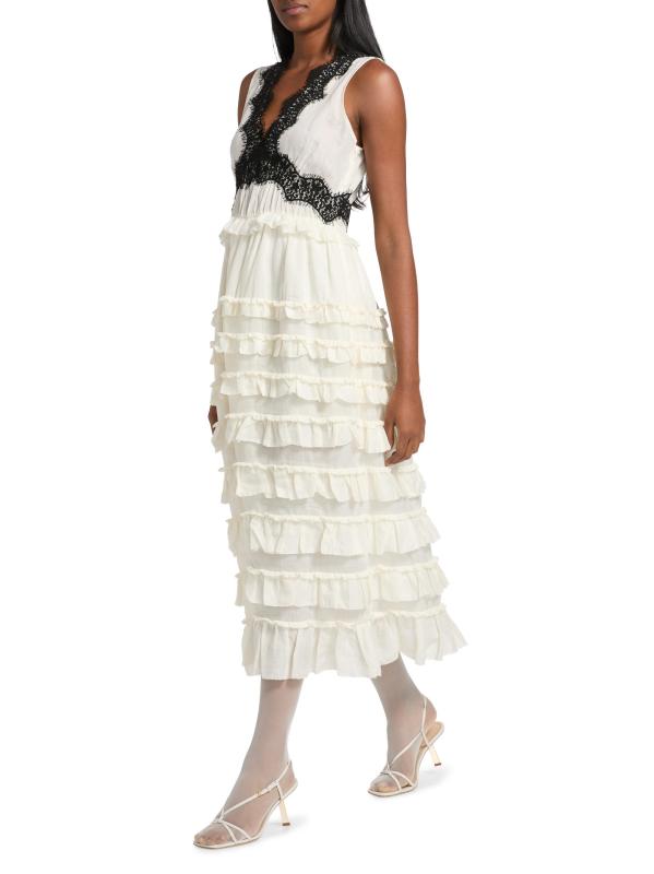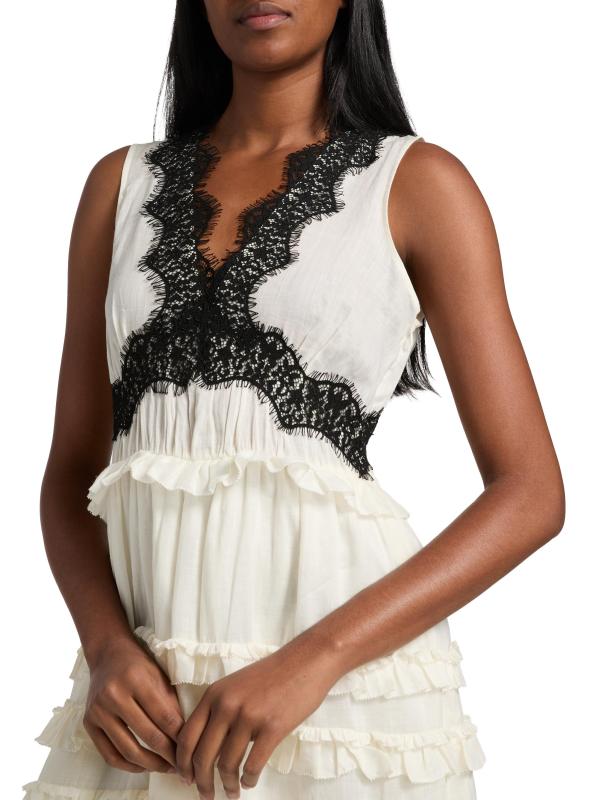 Sea's Anise tank midi-dress is designed with a V-neck, contrast eyelash lace trim, and soft shirring throughout. This A-line silhouette features tiered frills at the skirt.