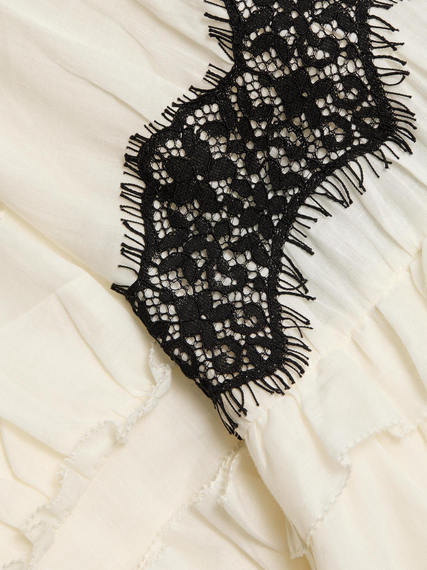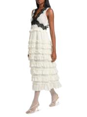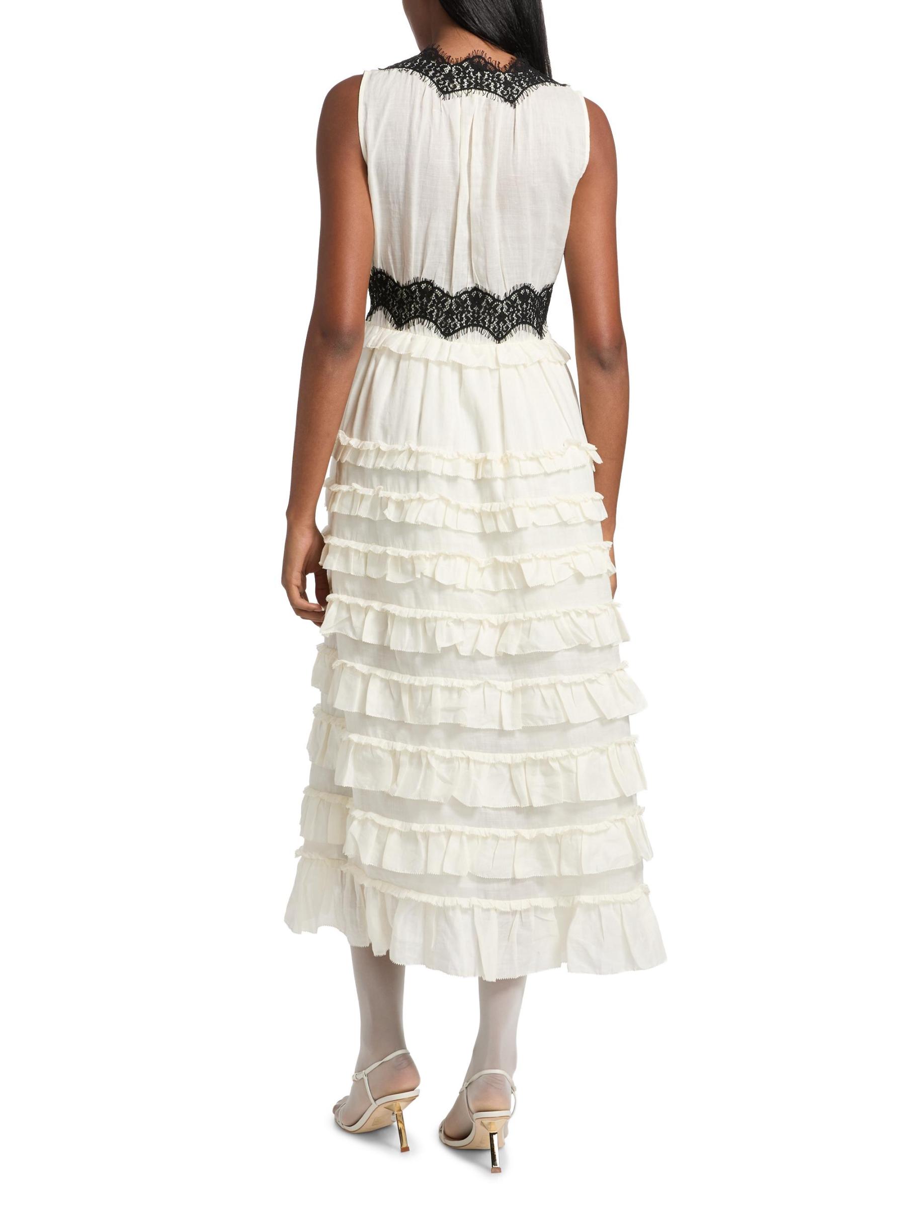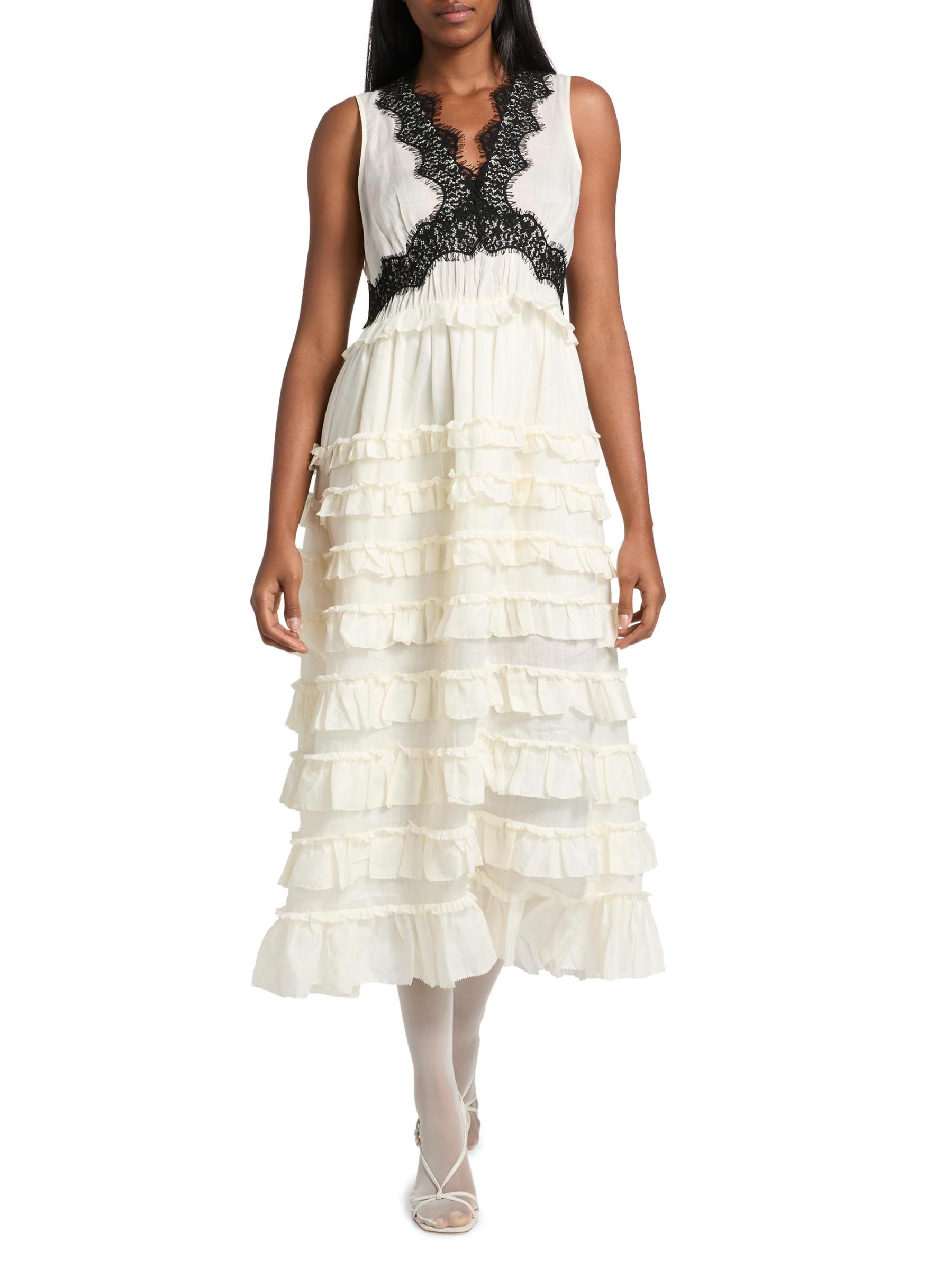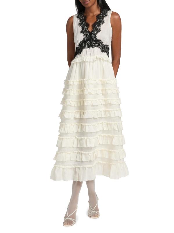 Sea's Anise tank midi-dress is designed with a V-neck, contrast eyelash lace trim, and soft shirring throughout. This A-line silhouette features tiered frills at the skirt.V-neck Sleeveless Concealed side-zip closure 100% Ramie Combo: 70% cotton/30% nylon Lining: 100% Cotton Dry clean Imported