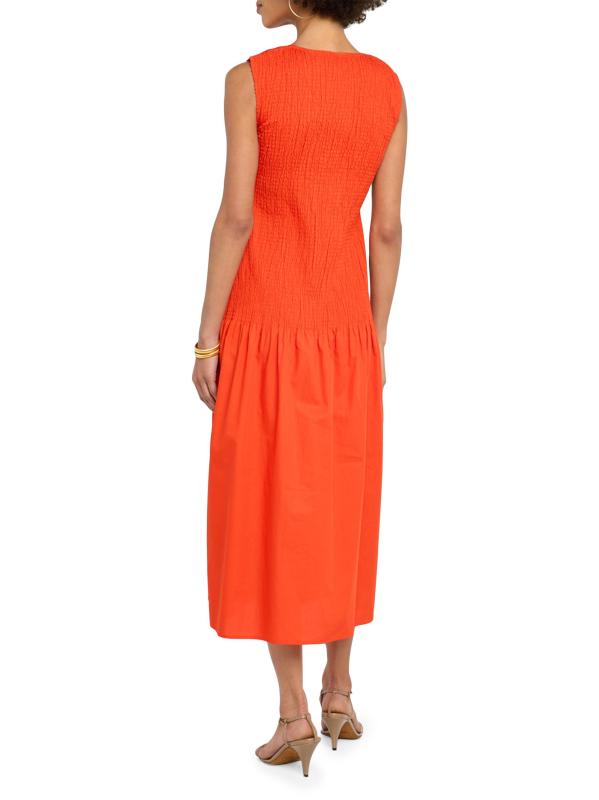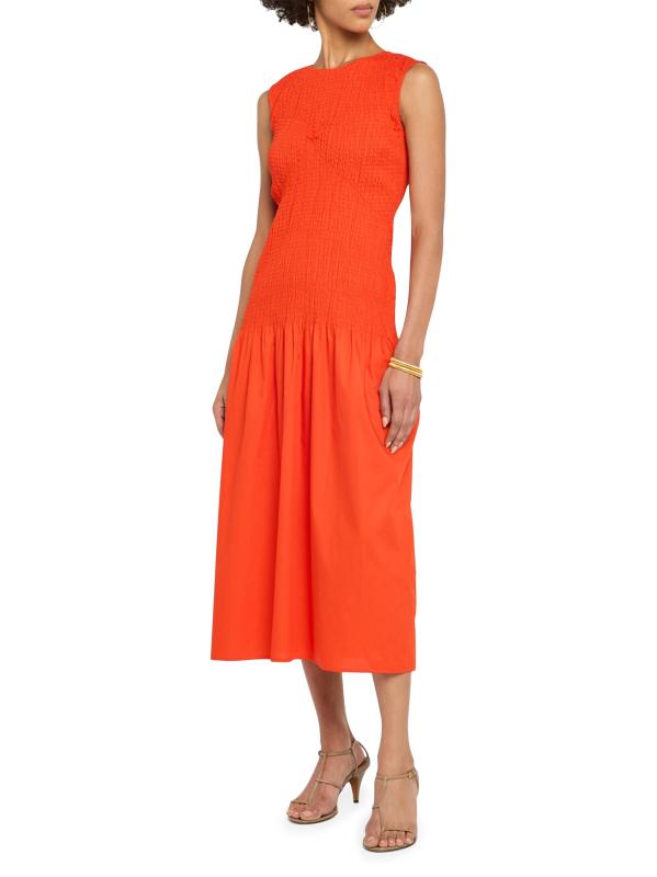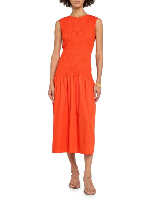 Reiss’ Annabel midi-dress is crafted of cotton to a fit-and-flare silhouette with a smocked bodice and gathered drop-waist skirt.
