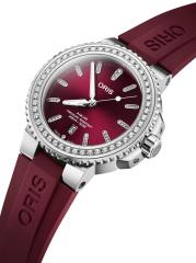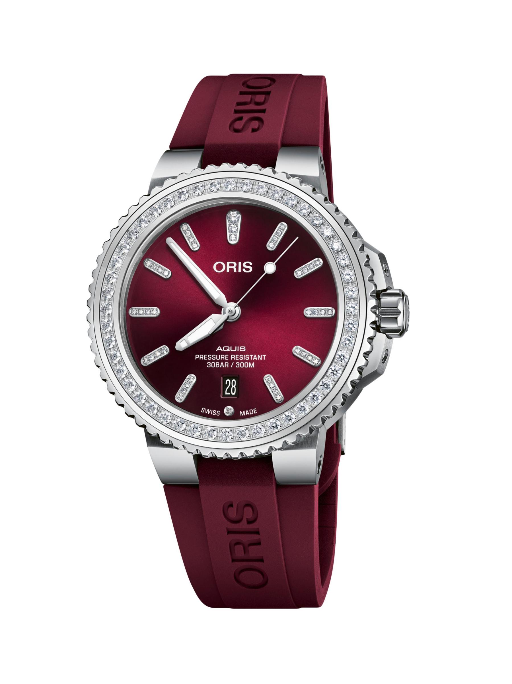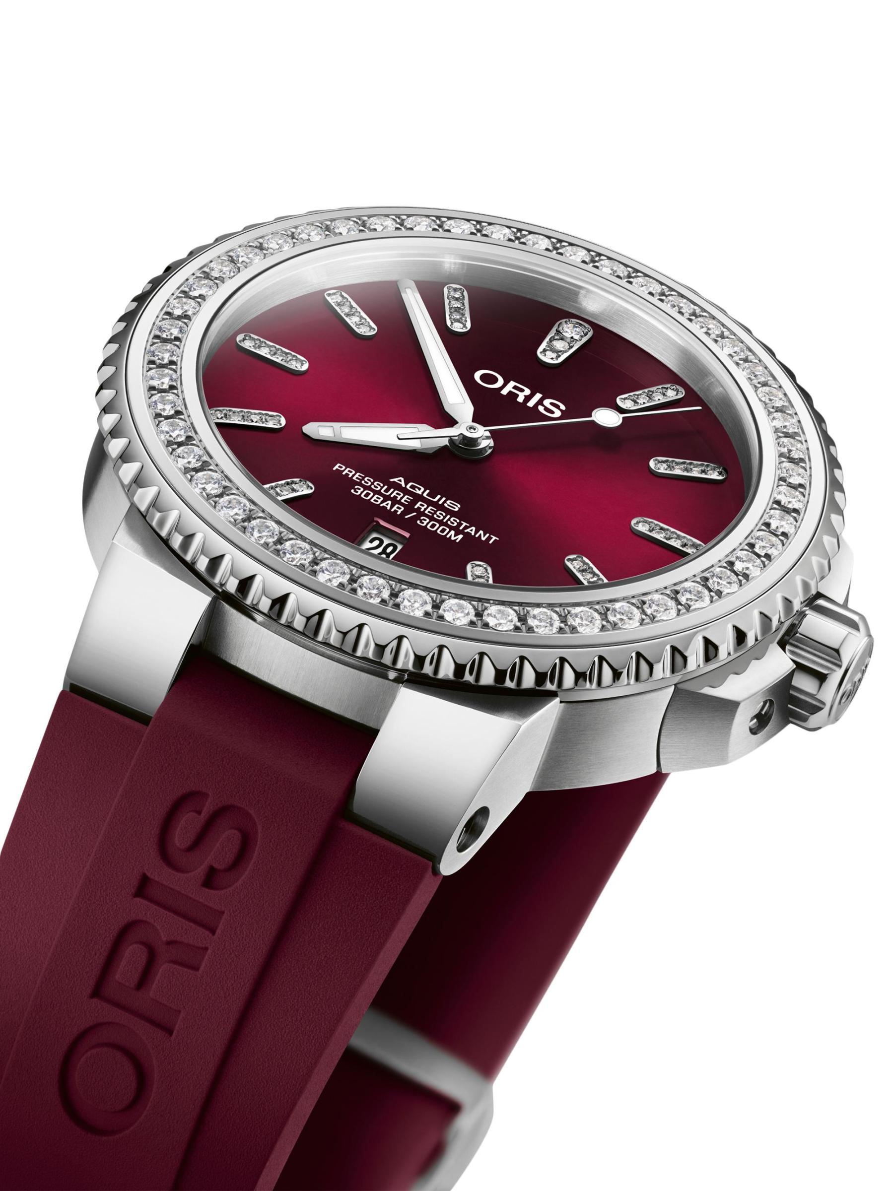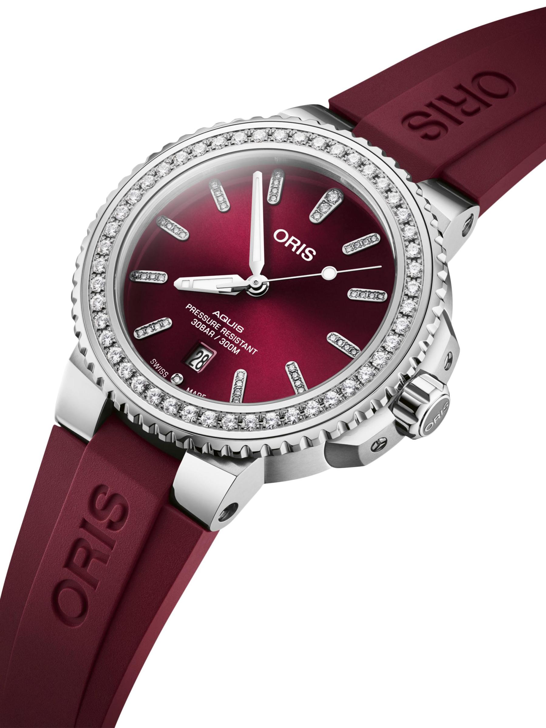 From the Aquis Collection. Secured with a rubber strap, Oris' watch features a round stainless steel case and a sparkling diamond bezel and hour markers.Automatic winding movement Lab-grown diamonds, 12 tcw Diamond color grade: E-G Diamond clarity grade: VS1 Domed anti-reflective sapphire crystal Burgundy dial Diamond hour markers Date display at six o’clock Stainless steel case Rubber strap Deployant buckle Made in Switzerland