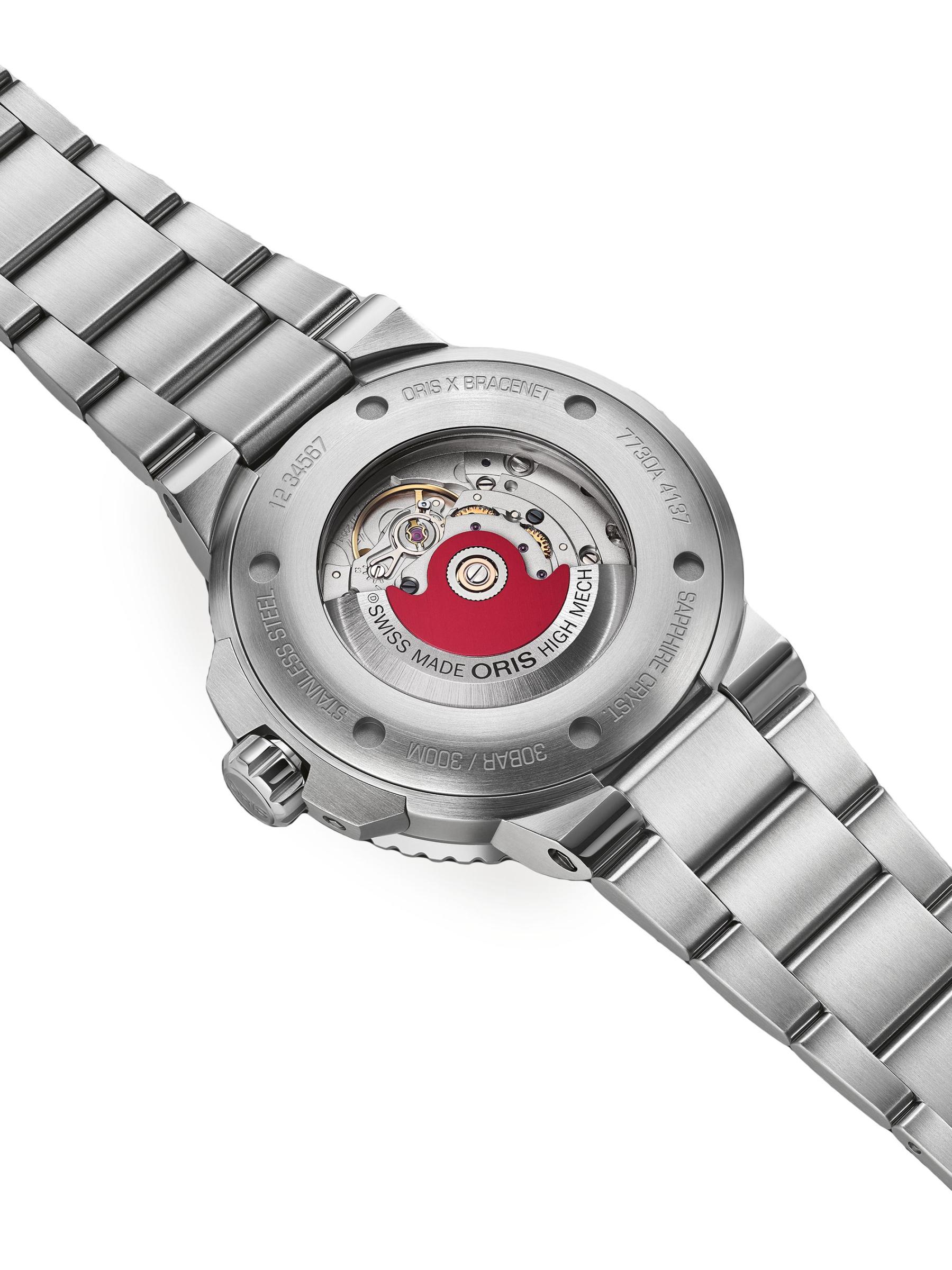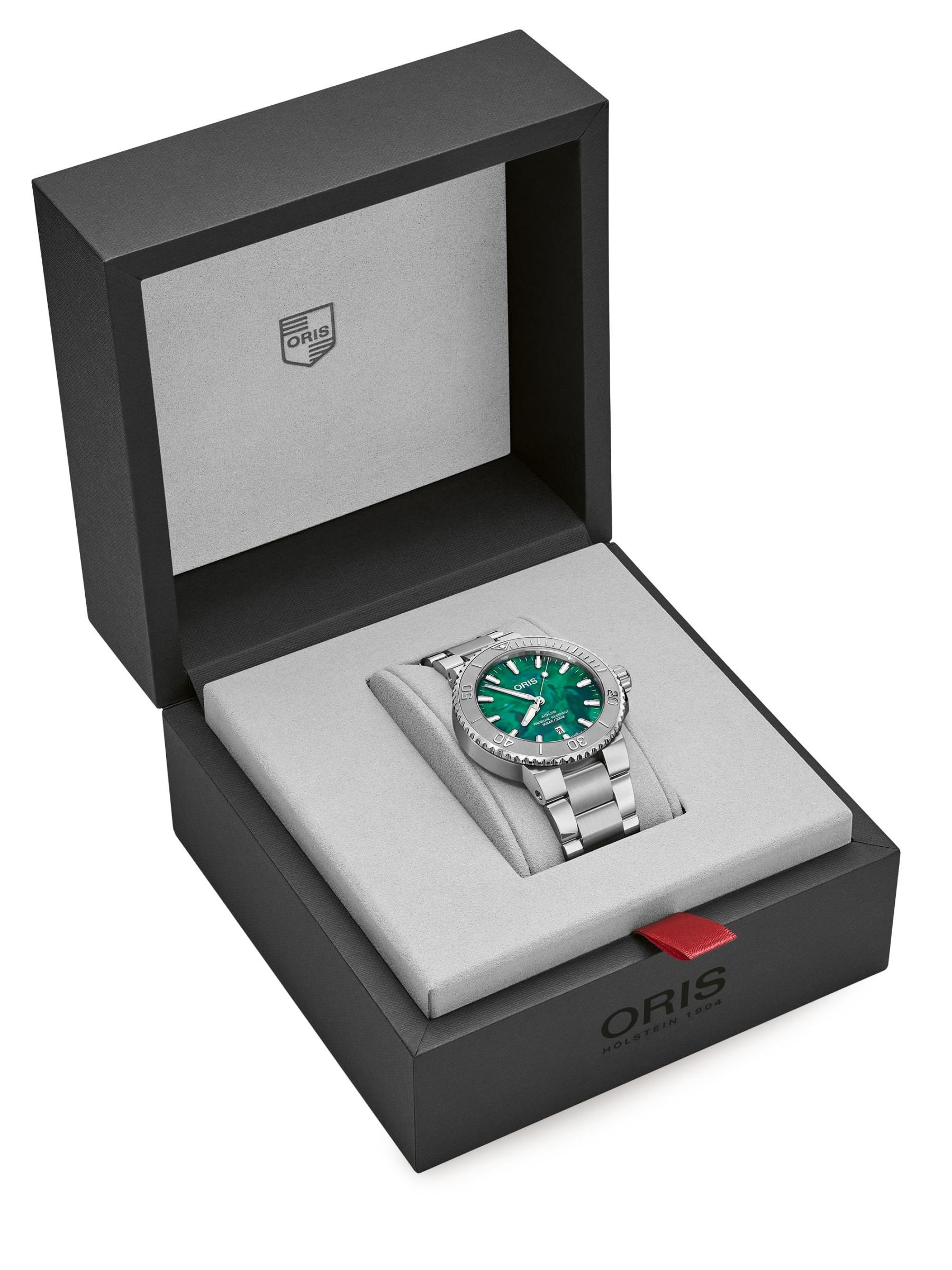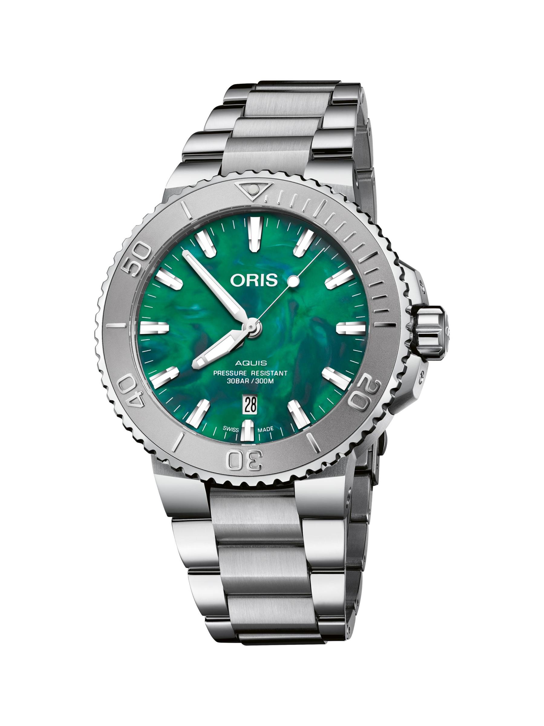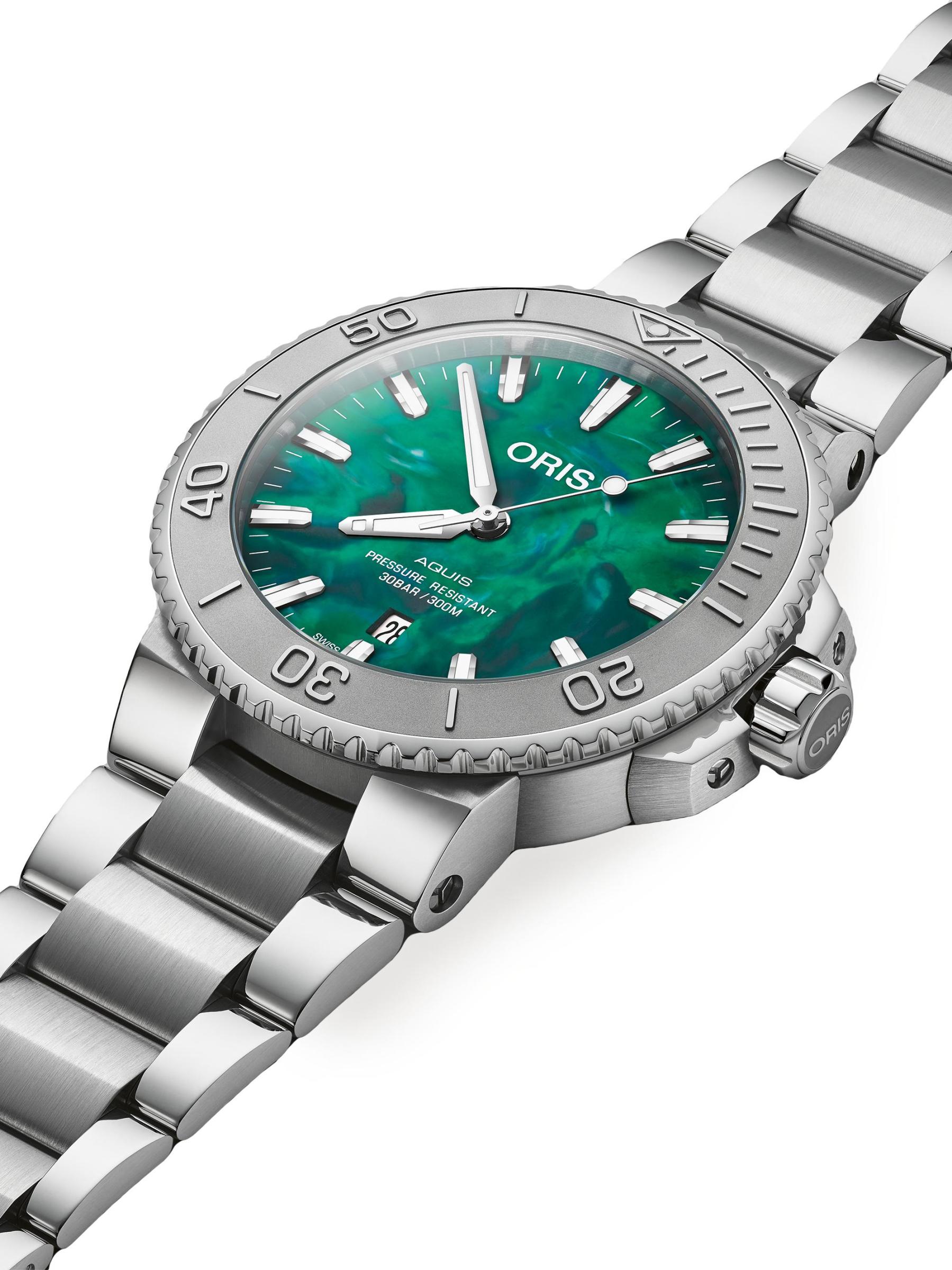 From the Aquis Collection. Oris’ Aquis Watch features classic stainless steel construction with a vibrant green dial for a bold finish.