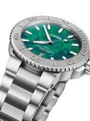From the Aquis Collection. Oris’ Aquis Watch features classic stainless steel construction with a vibrant green dial for a bold finish.Mechanical automatic movement Sapphire crystal Uni-directional rotating bezel Date display at 6 o'clock Second hand Stainless steel case and bracelet Deployant buckle clasp Made in Switzerland