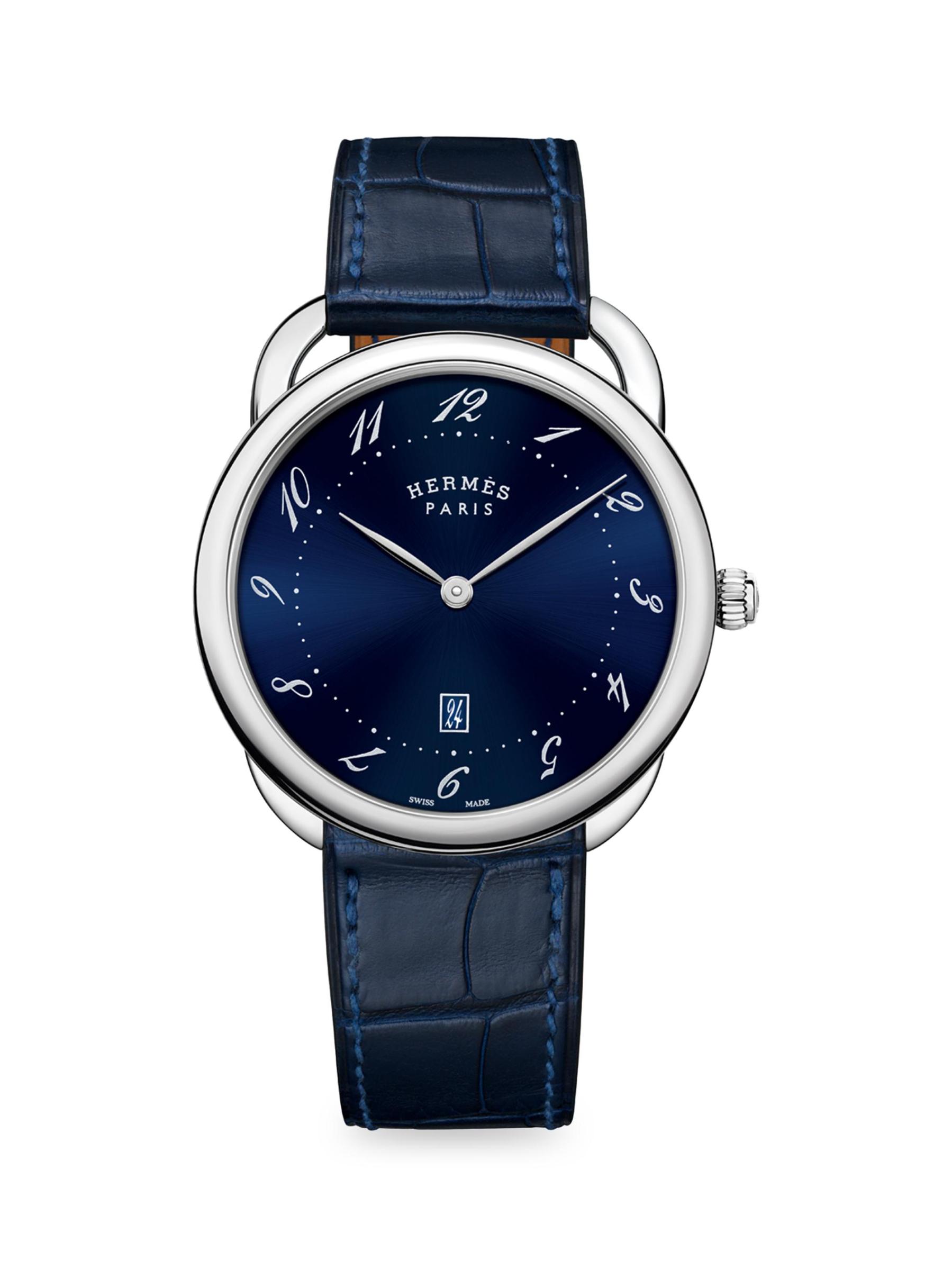 From the Arceau Collection. Henri d’Origny is known for his clever interpretations of classical designs. In 1978, he released the round watch from conventional codes. Firstly, by associating it with asymmetrical lugs inspired by stirrups, then by creating the sloping font of the Arabic numerals, as if carried away by the pace of a galloping mount. This sleek stainless steel timepiece features a blue lacquered dial and a fine alligator leather strap.Swiss quartz movement Stainless steel bezel Anti-glare sapphire crystal Blue lacquered dial Arabic numeral hour markers Date display at 6 o'clock Stainless steel case/alligator leather strap Adjustable buckle closure Hermés two-year international warranty Made in Switzerland