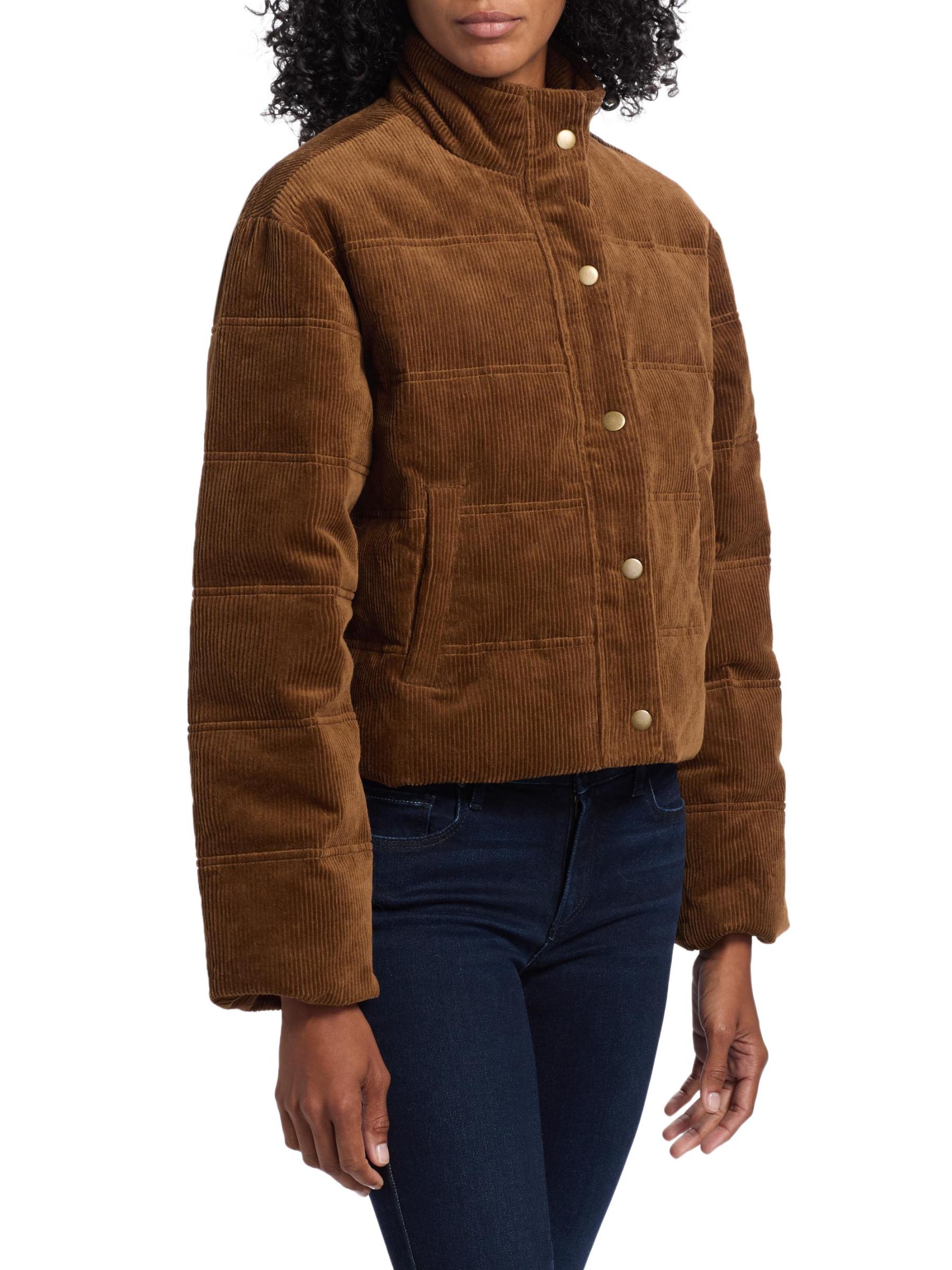 Paige's Astor puffer jacket is crafted of stretch cotton corduroy in a quilted design. Side vertical welt pockets and a front zip closure with an exposed snap storm placket lend elevated comfort to this style.Stand collar Long sleeves Side vertical welt pockets Front zip closure and snap storm placket 98% cotton/2% elastane Machine wash Imported