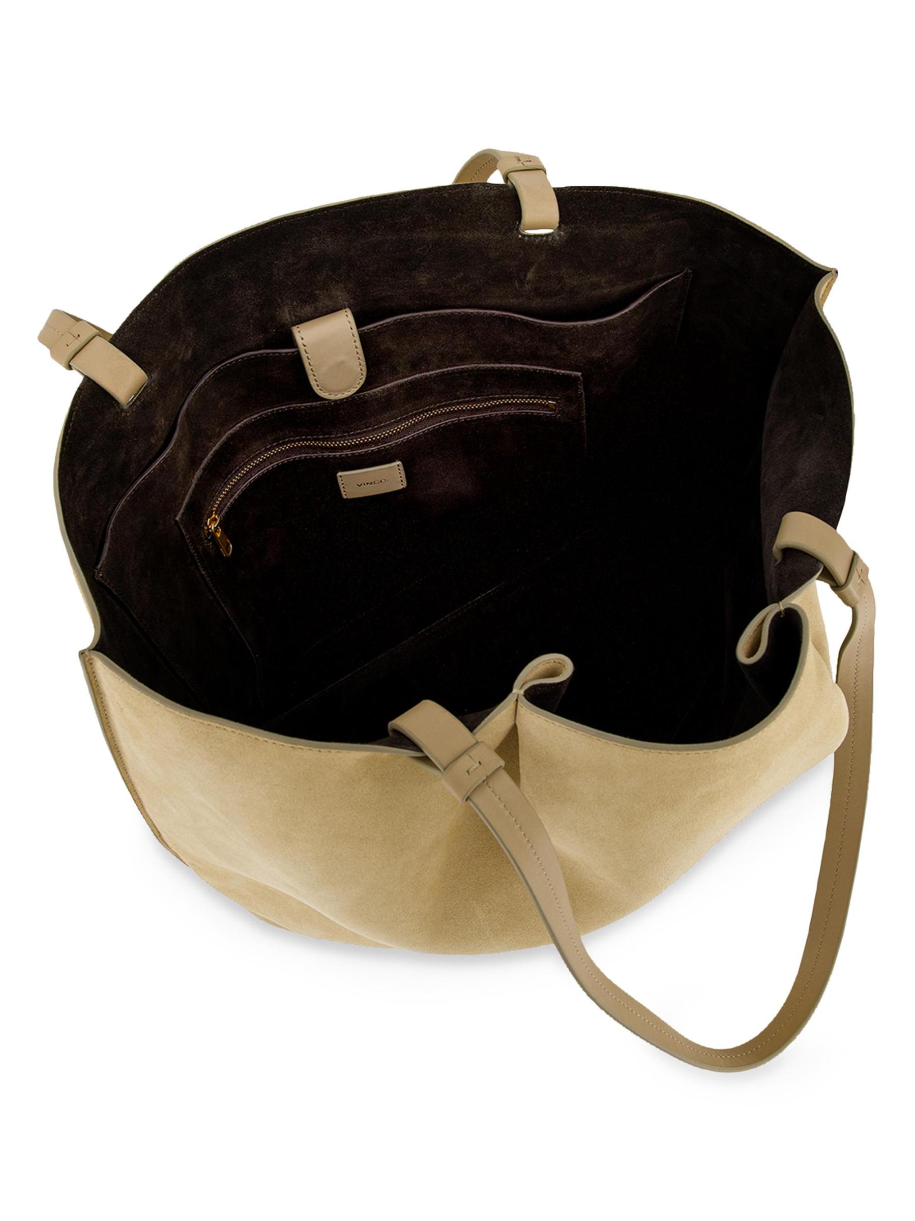 The Ava tote bag from Vince is crafted of premium suede with leather trim.