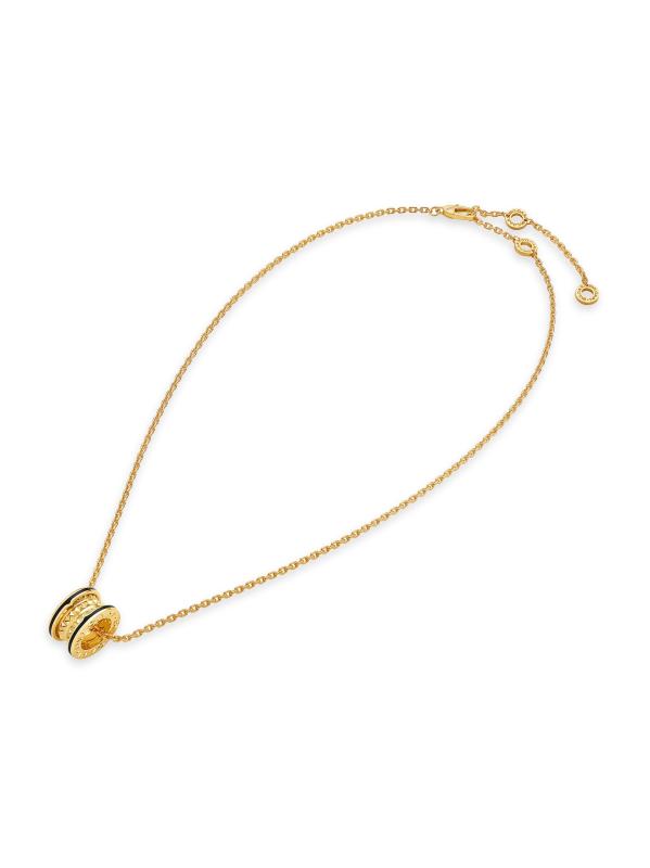 From the B.zero1 Collection. Crafted of polished 18K yellow gold, this necklace from BVLGARI features a studded logo-engraved pendant accented with black ceramic. This striking accessory comes with an additional cable chain for versatile styling options.Presented in BVLGARI's signature packaging, inspired by the house's rich history and commitment to luxury Ceramic 18K yellow gold Box and lobster clasps Imported