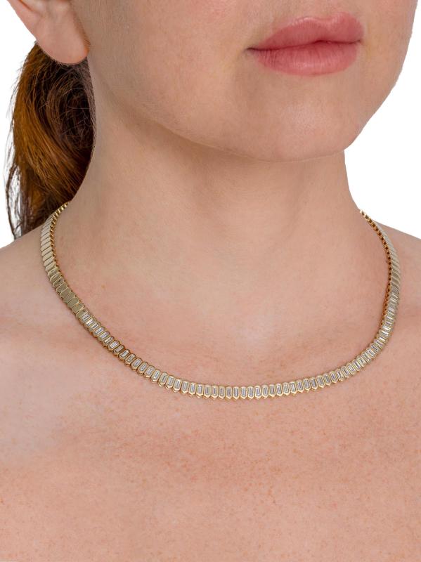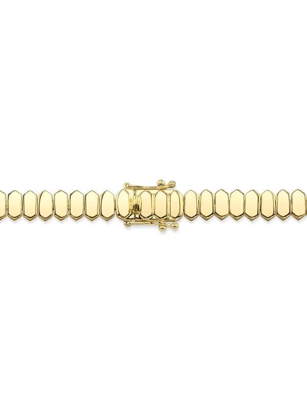 From the Bailey Collection. Composed of 14K-yellow-gold hexagonal links, this necklace from Shy Creation is accented with sparkling baguette diamonds resting in bezel settings.