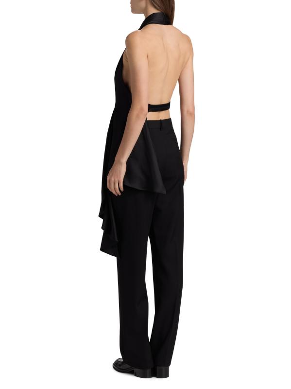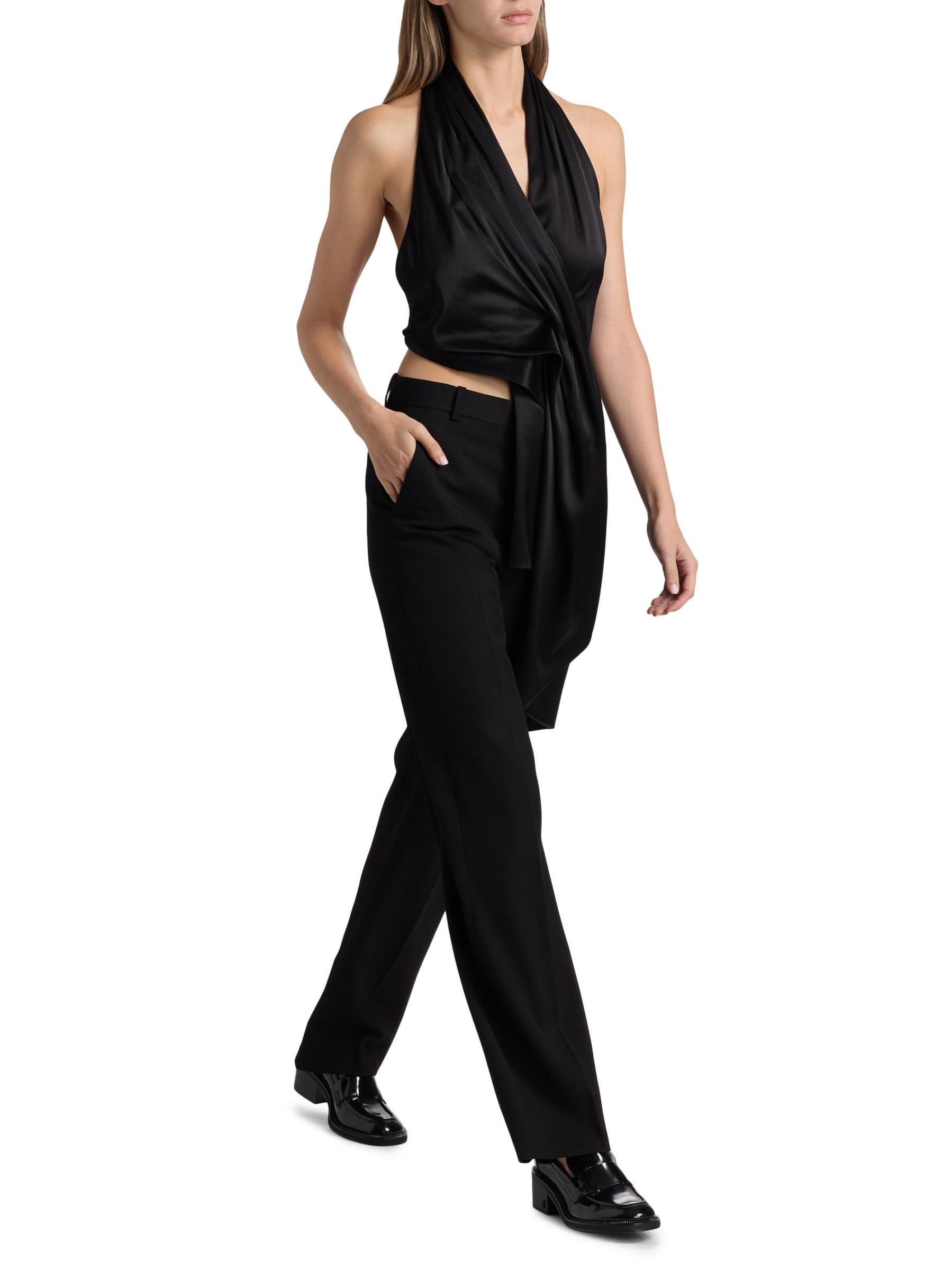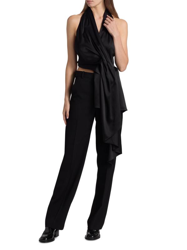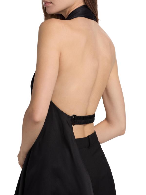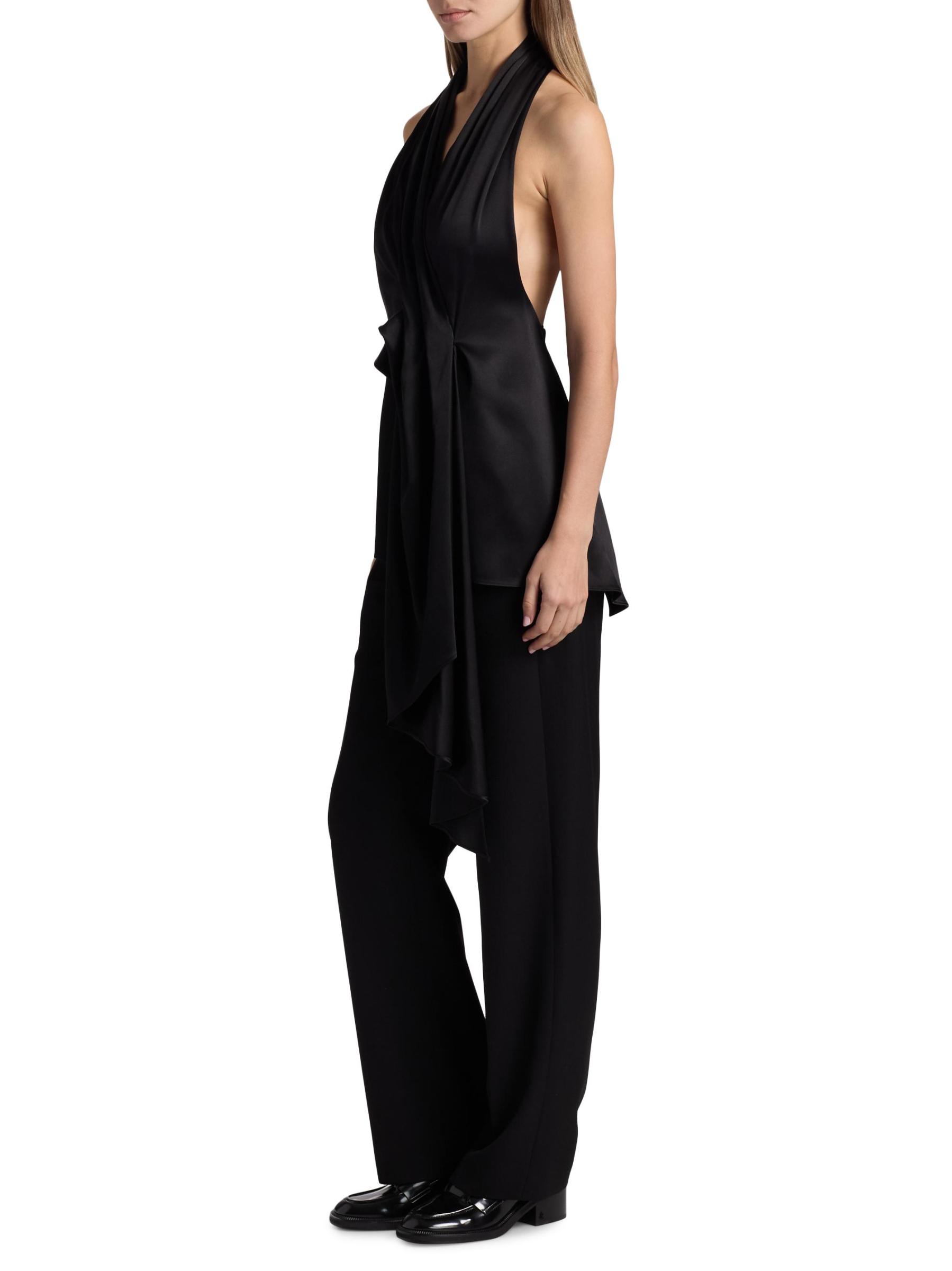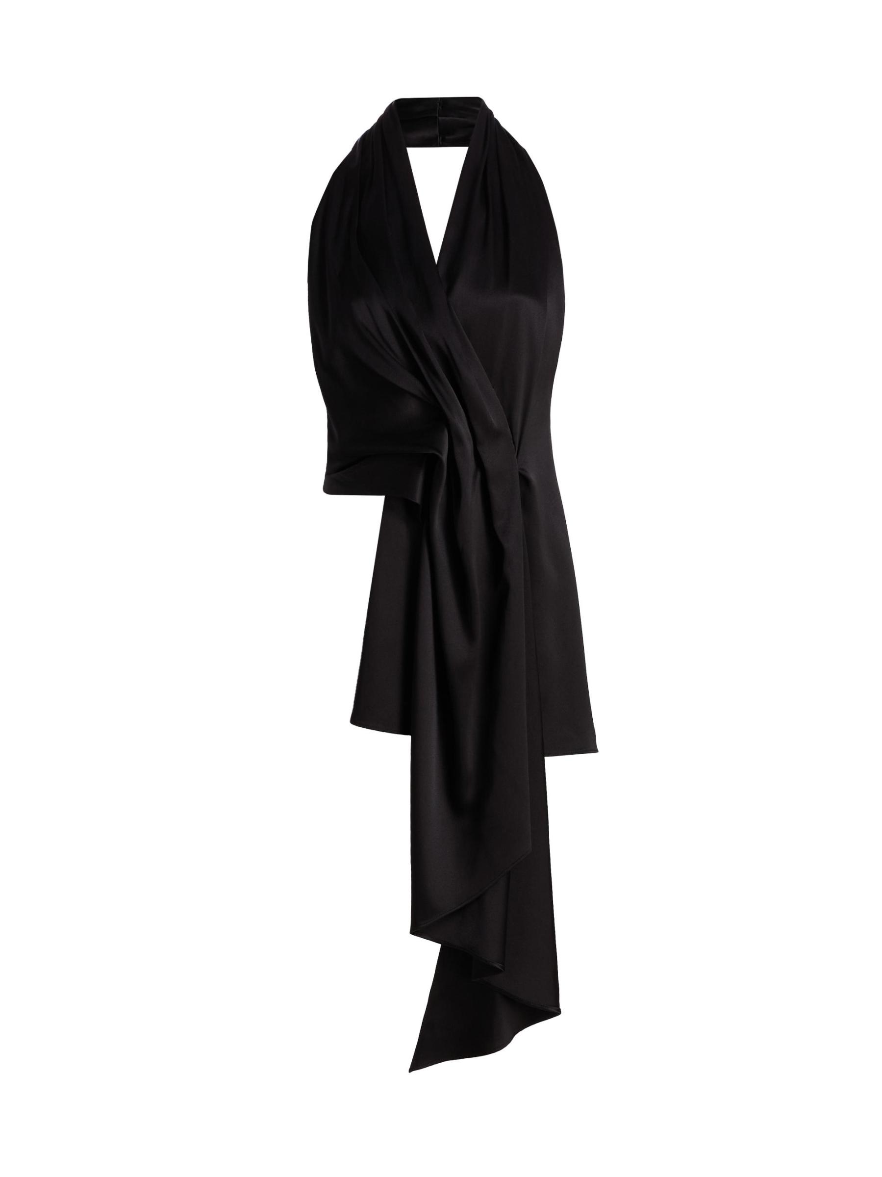 Crafted of lustrous satin, Heirlome’s Barbara halterneck top features a draped asymmetric hem.