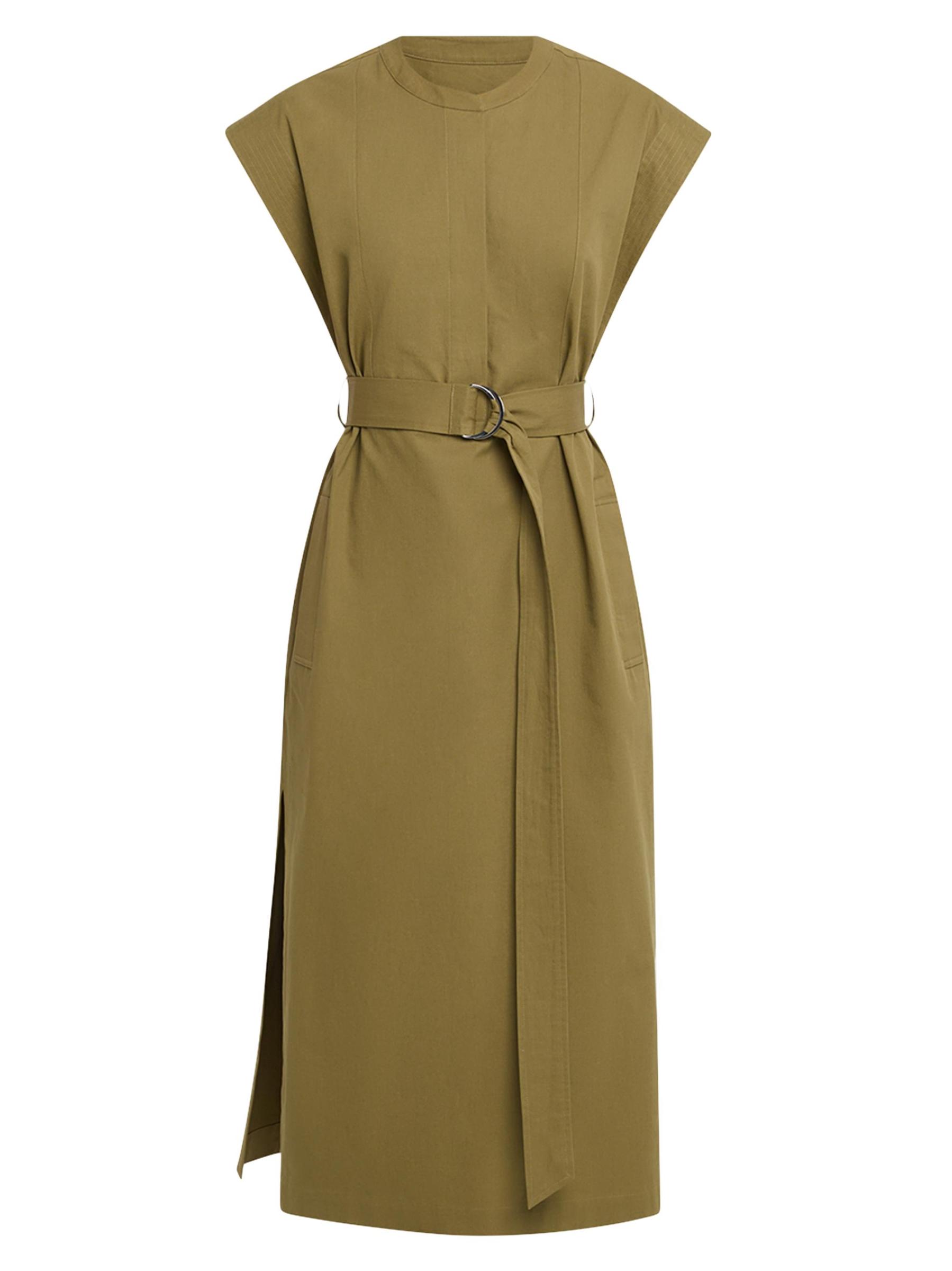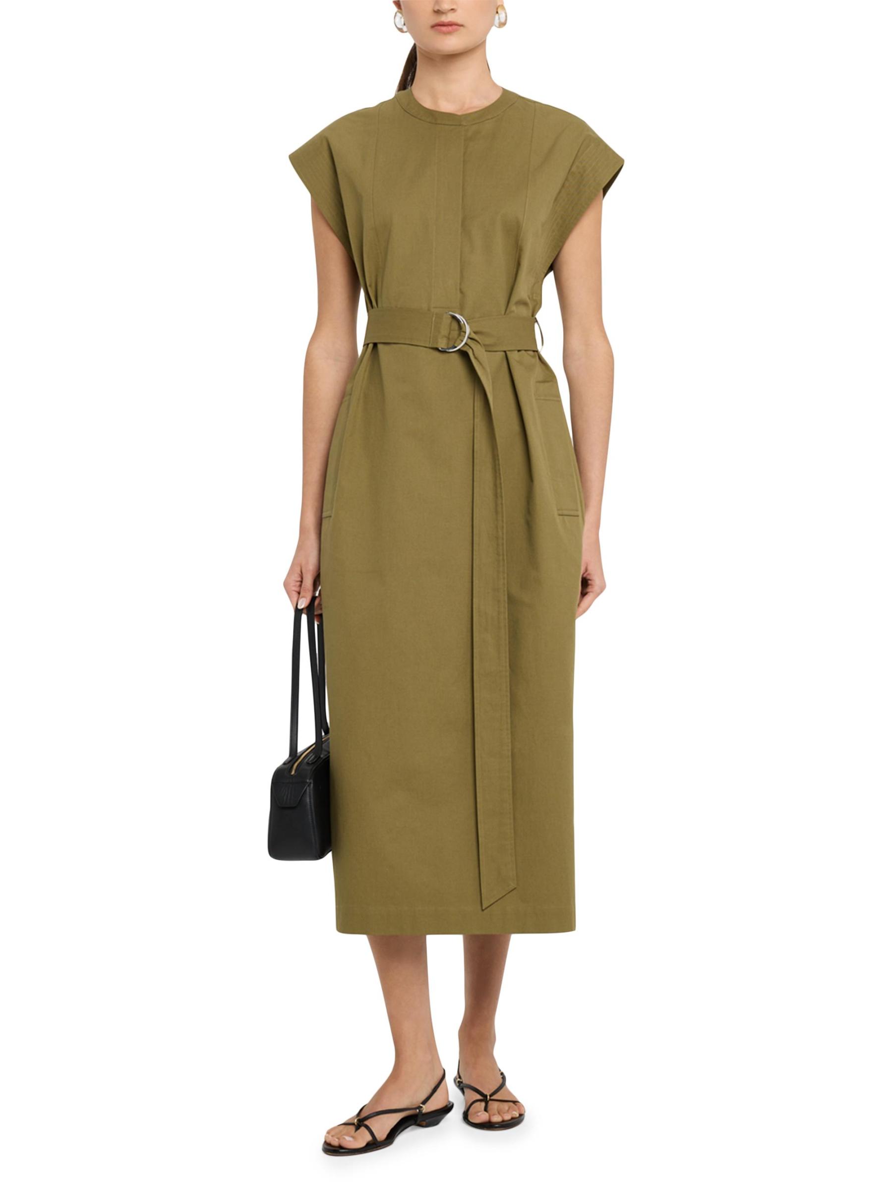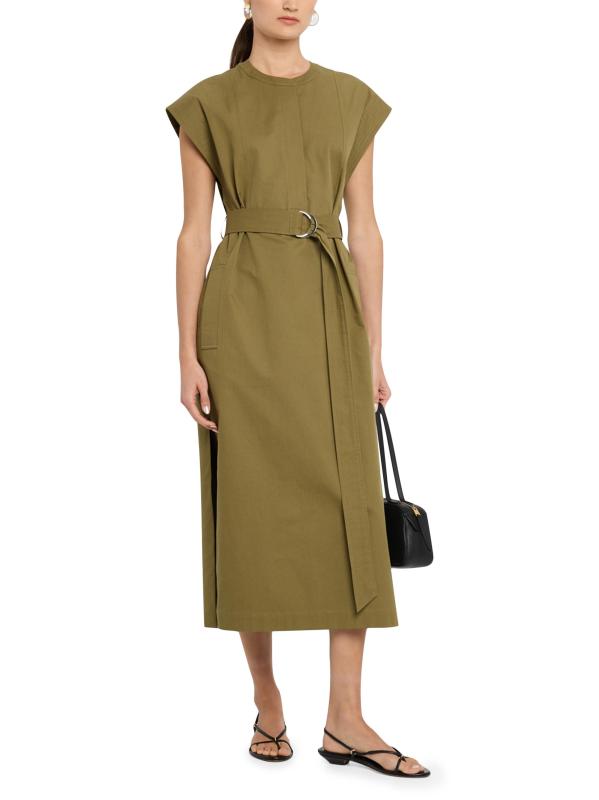 This structured midi-dress from Argent, crafted of cotton twill, is designed with defined topstitching, a round neck, and a waist-defining D-ring belt.Round neck Cap sleeves Self D-ring belt Side welt pockets Side slits Back yoke Concealed button-front closure Cotton Machine wash Imported