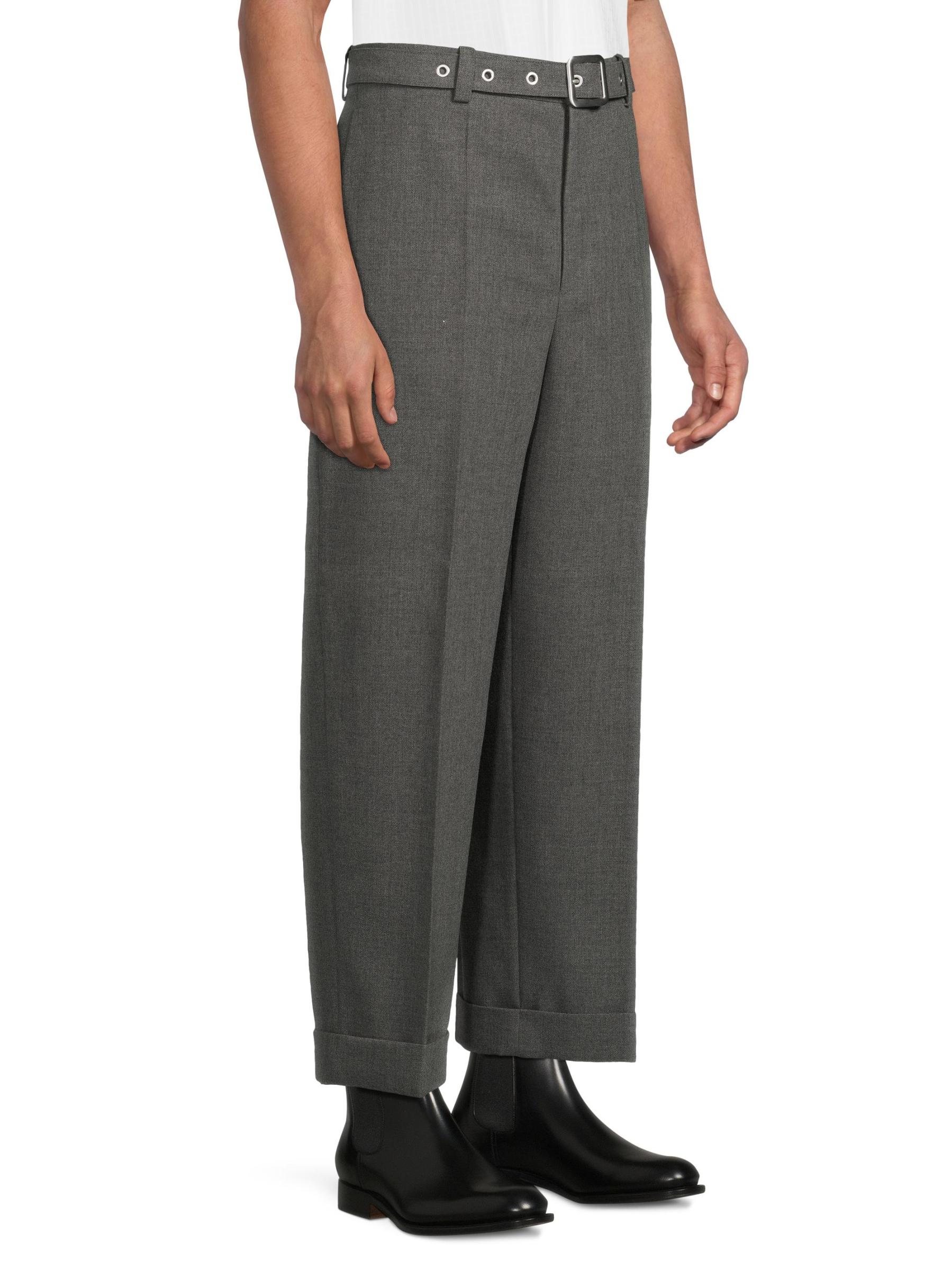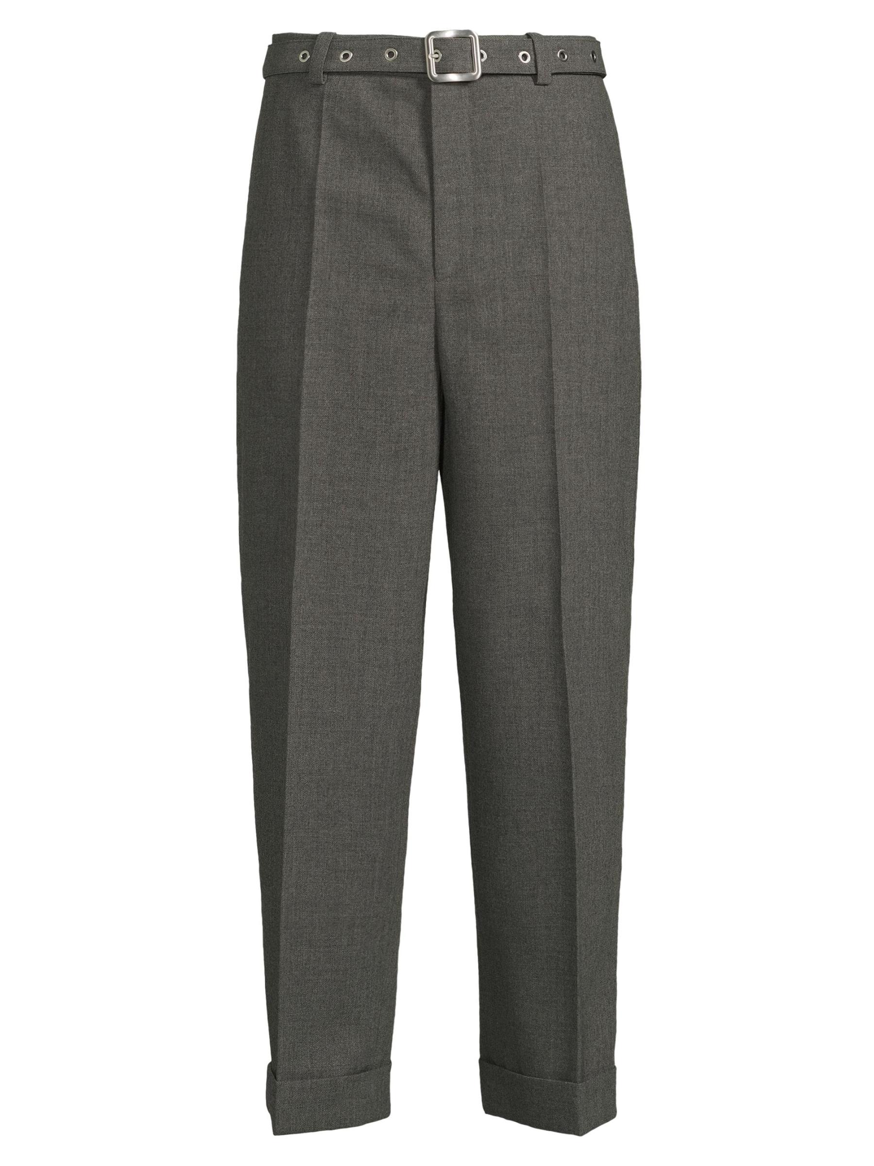 Crafted of wool canvas, these Jil Sander trousers are cut in a straight-leg silhouette with rolled cuffs. A removable D-ring belt with silvertone grommets lends a modern twist to this pair.Removable D-ring belt Side slant pockets Back welt pockets Rolled cuffs Zip fly, hook-and-eye closure 100% wool Dry clean Made in Italy