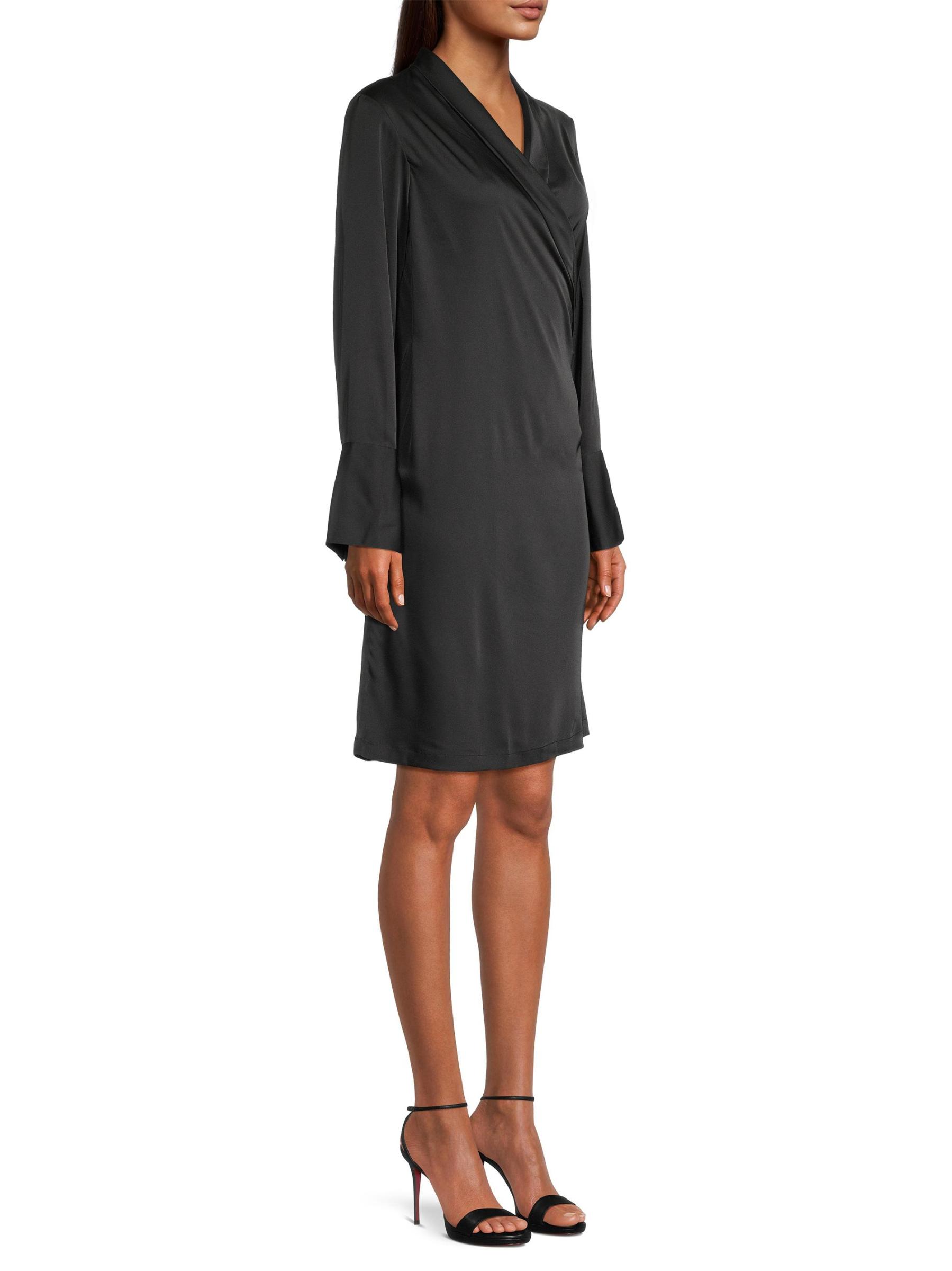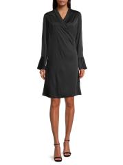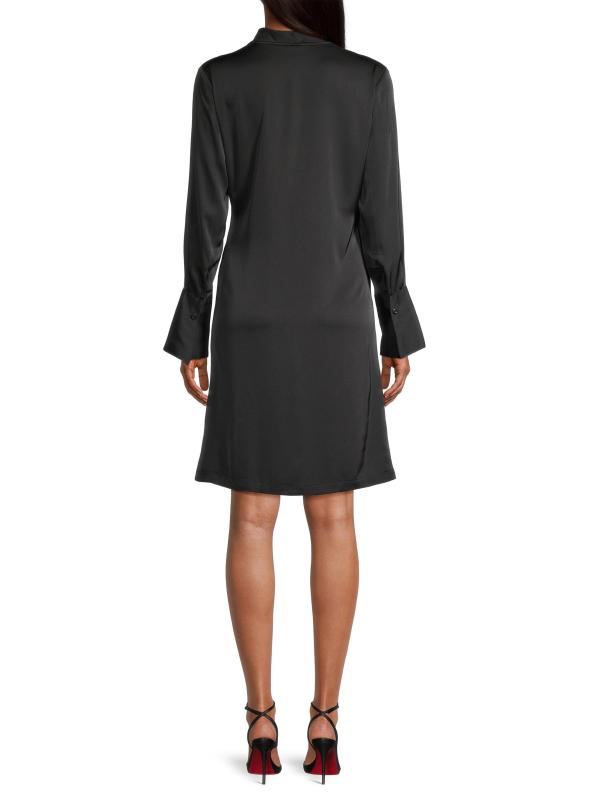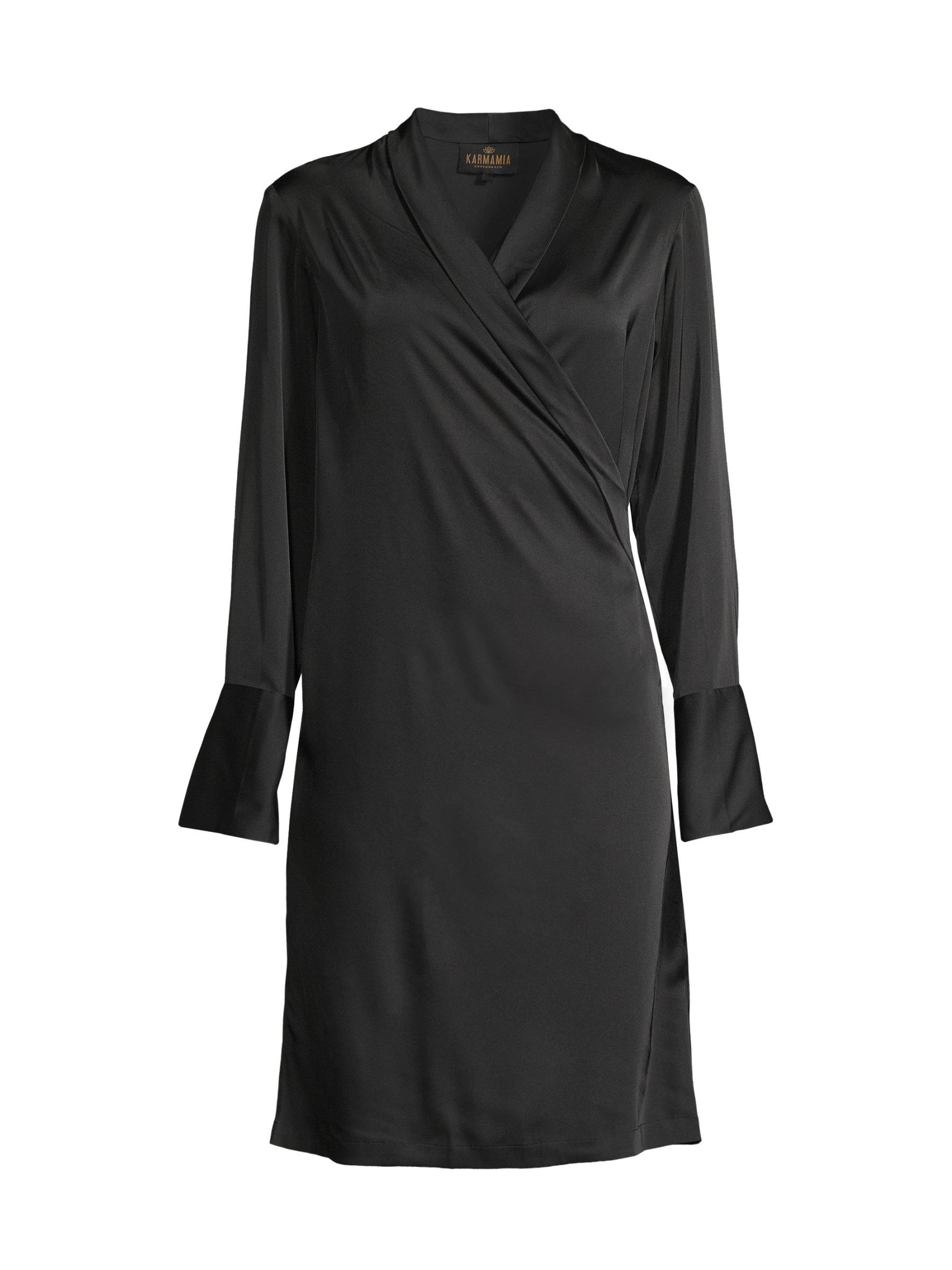 Karmamia's Billie minidress features a draped silhouette crafted of smooth satin. A surplice neckline and wide button cuffs define the look.Surplice neck Long sleeves button cuffs Tie-front detail Concealed button-front closure 100% polyester Machine wash Imported