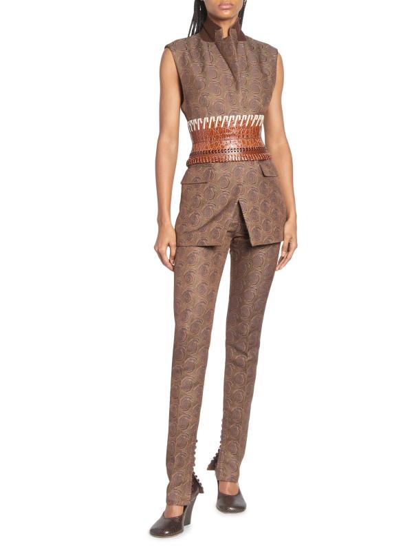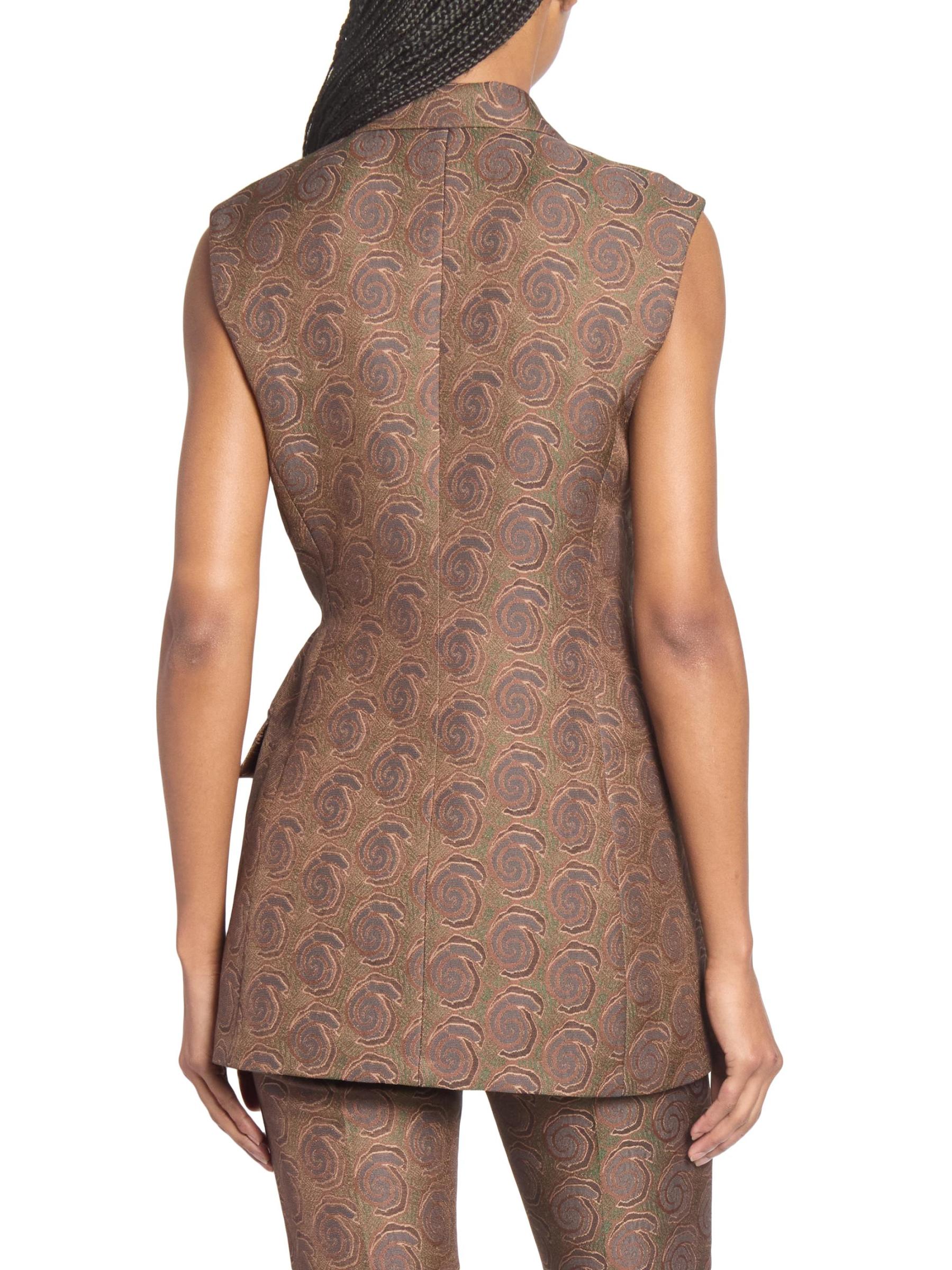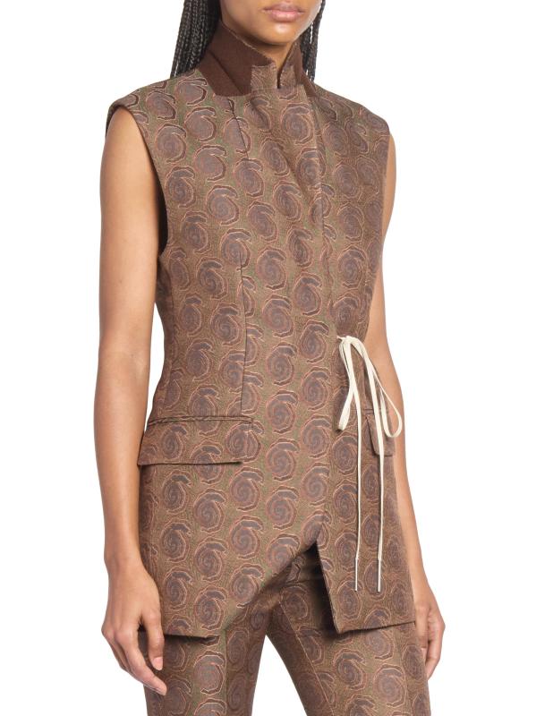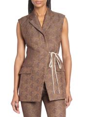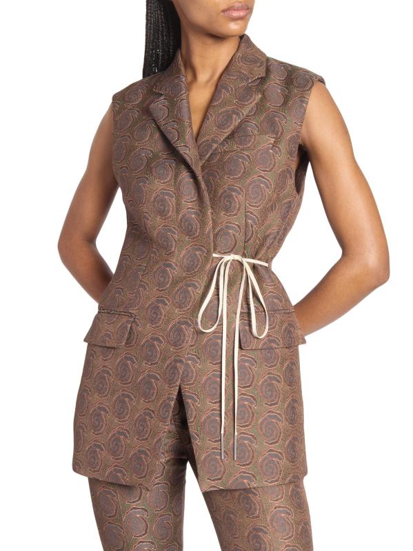The Bimbila sleeveless blazer from Dries Van Noten features a unique printed design and a waist tie.