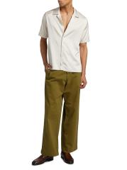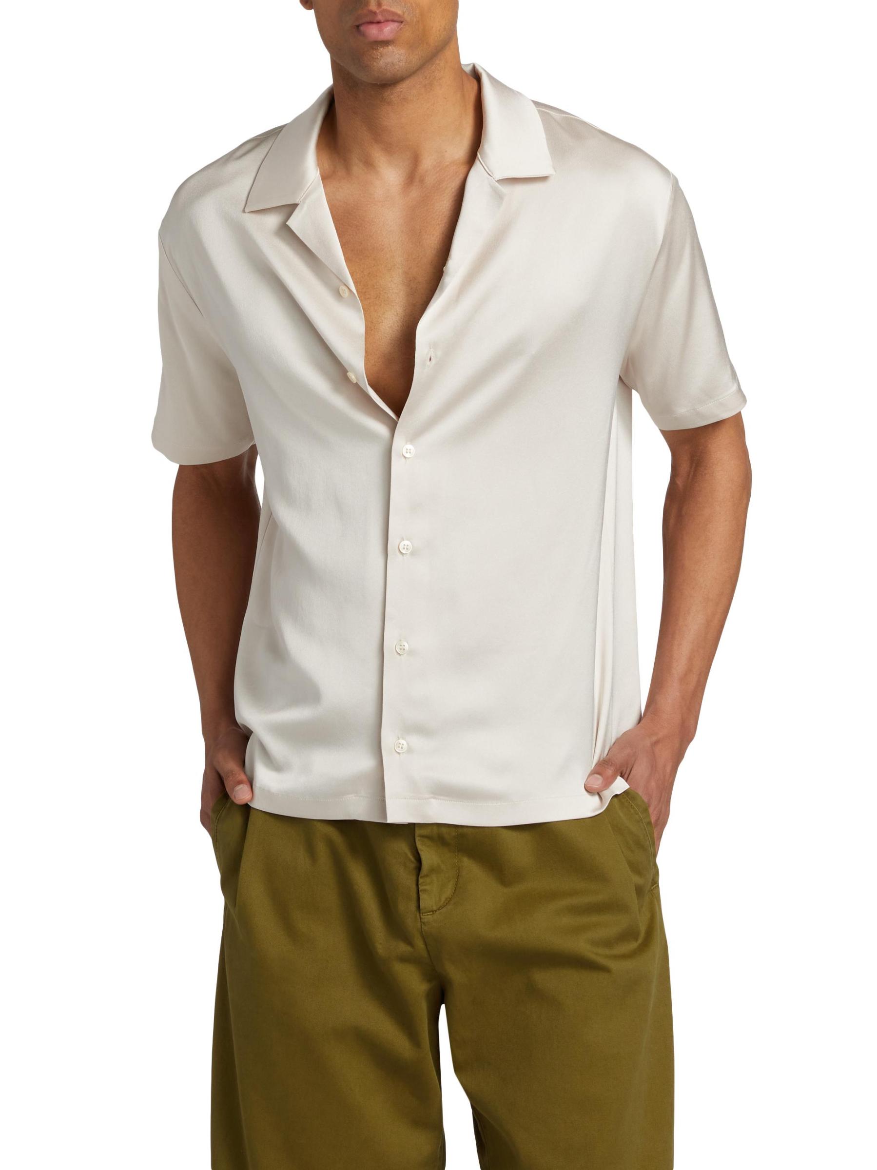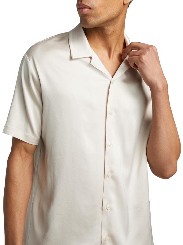 The Bisrat shirt from Áwet highlights a slinky satin design, detailed with a camp collar, short sleeves, and button-front closure.