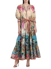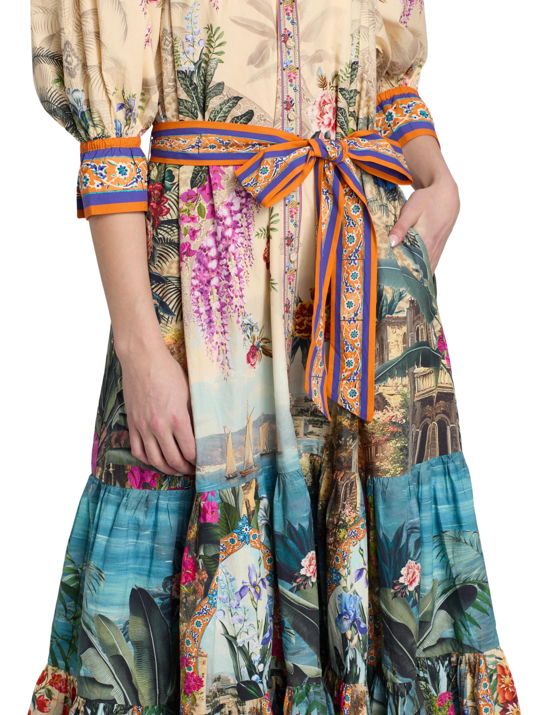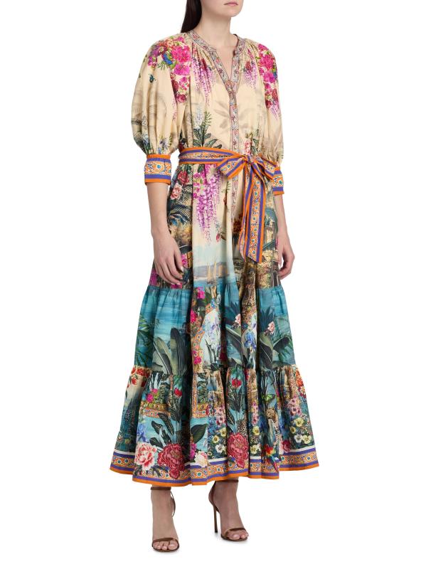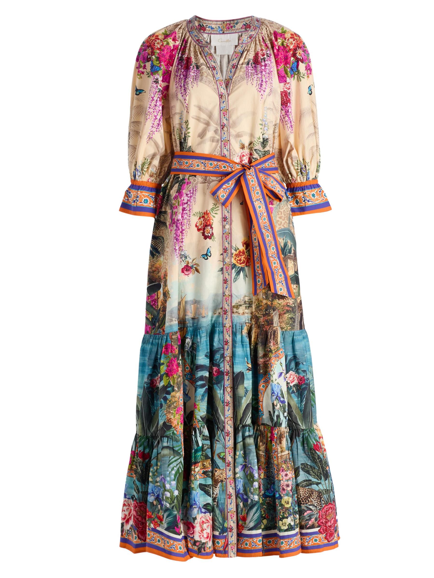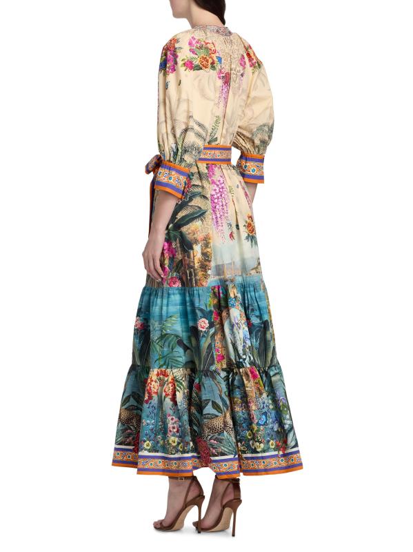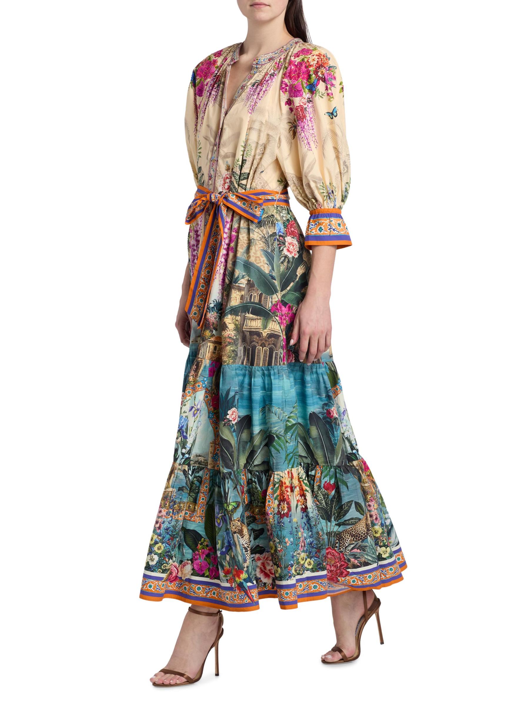 Crafted of cotton, this maxi shirtdress from Camilla features the Bodrum Botanicals print with tropical, floral, and animal motifs in a vibrant multicolored palette. This style has a tiered skirt and a self-tie belt, tailored in an A-line silhouette.Split neck Elbow-length sleeves, flared cuffs Self-tie belt Side slip pockets Button front closure 100% Cotton Dry clean Imported