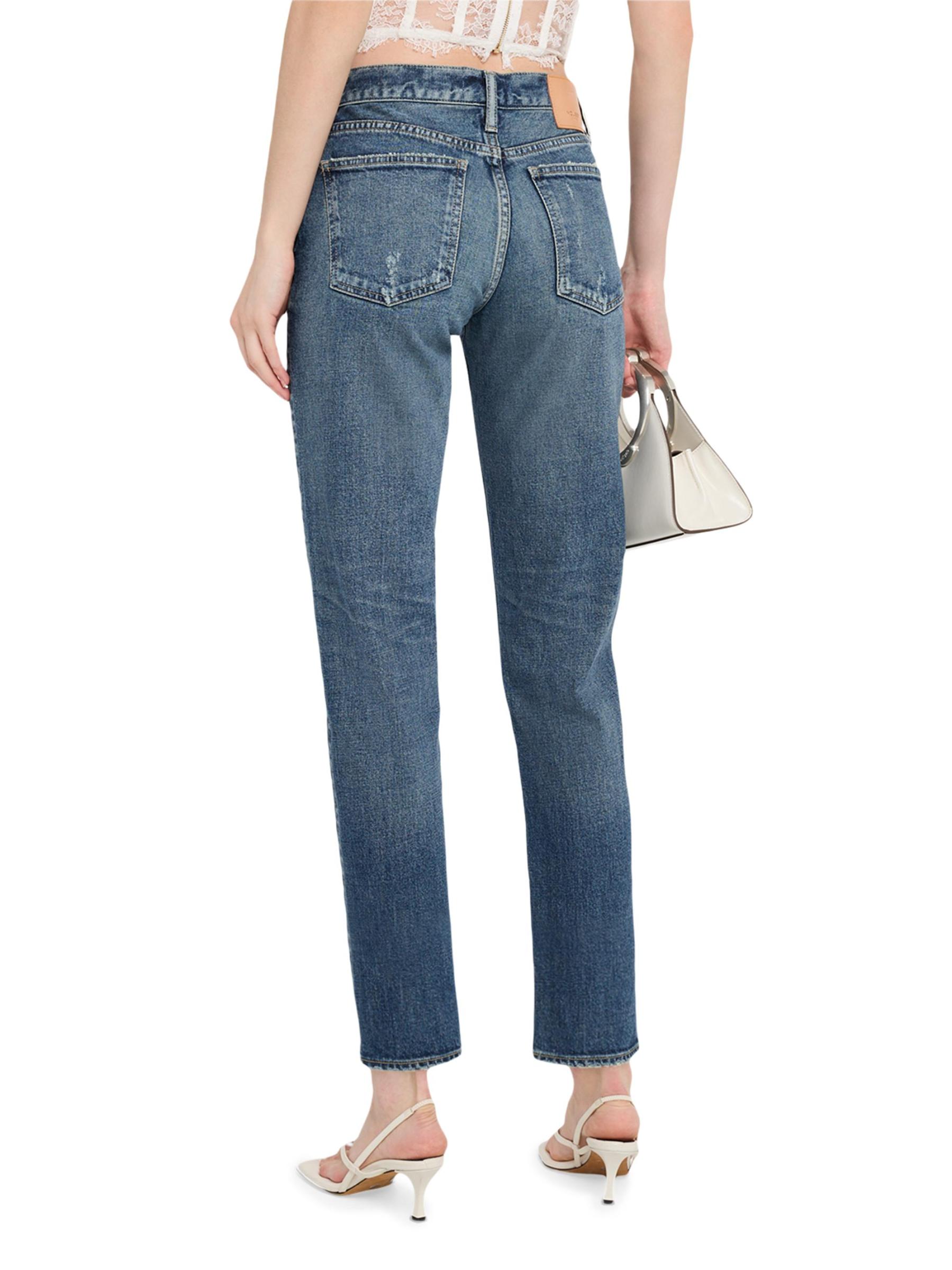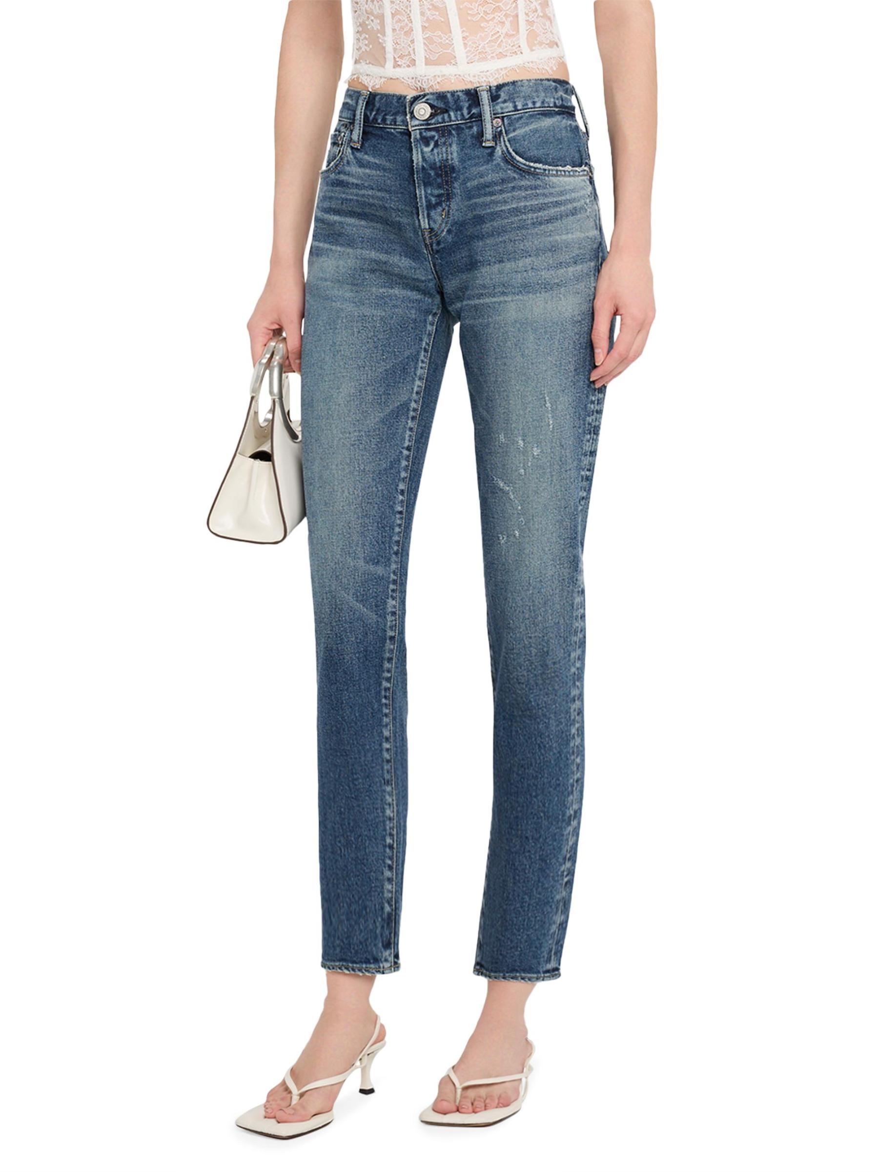 Moussy Vintage’s Brickell jeans are crafted of stretch denim that has been washed and whiskered for a vintage-style distressed look. The slim-straight style features a mid-rise waist and ankle length.
